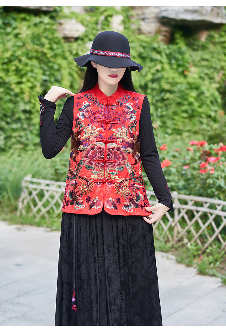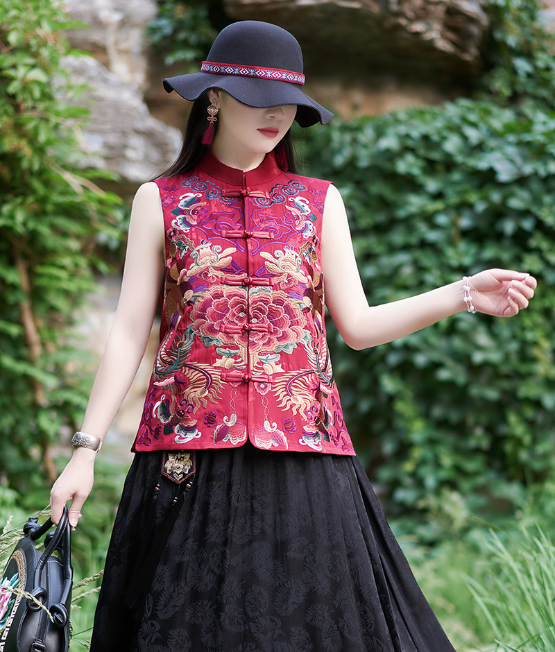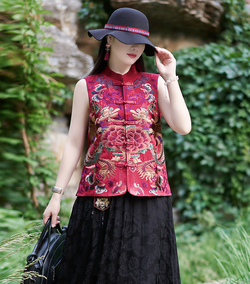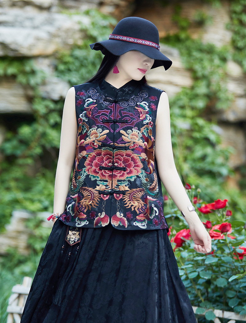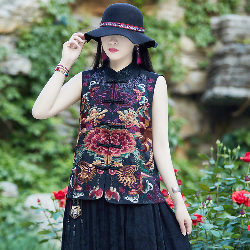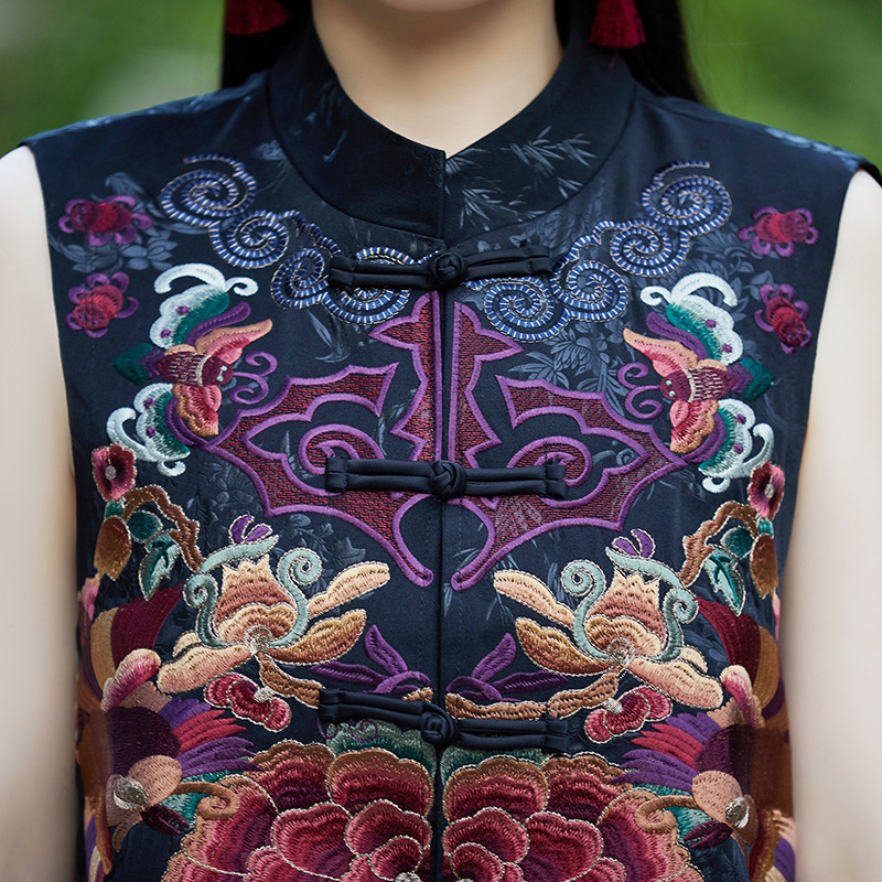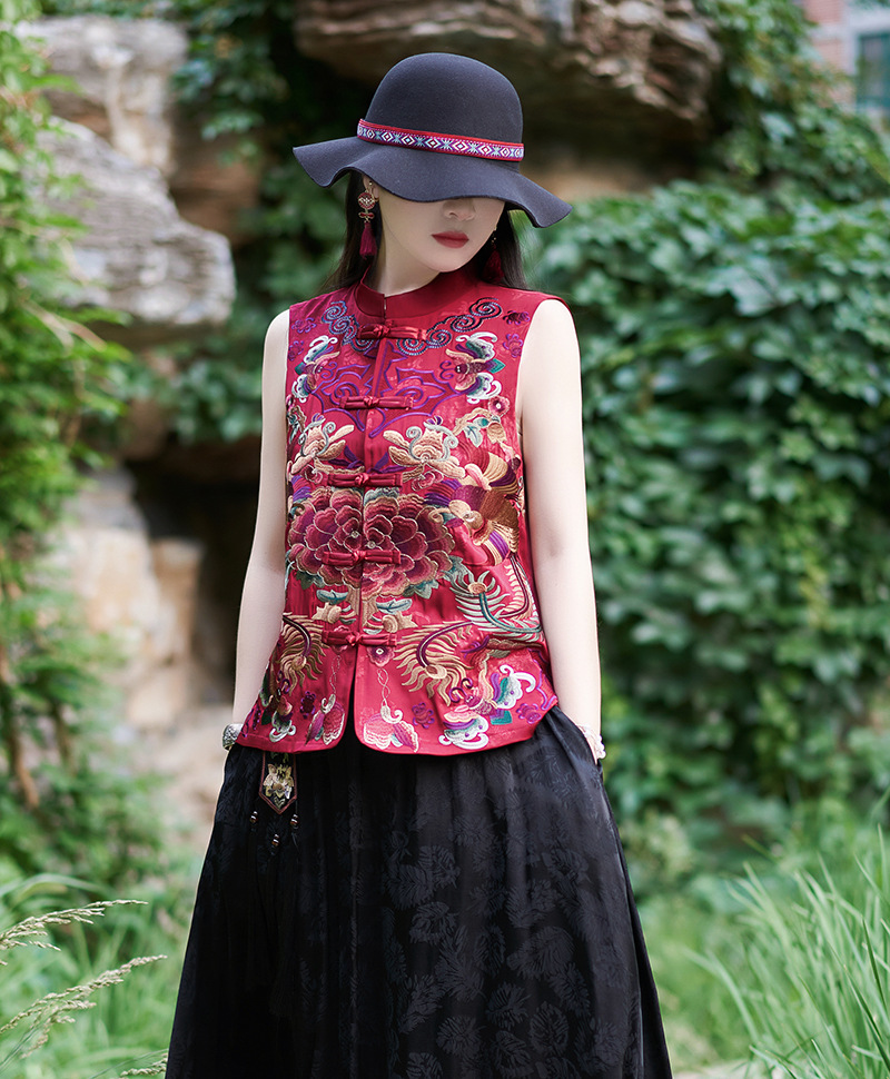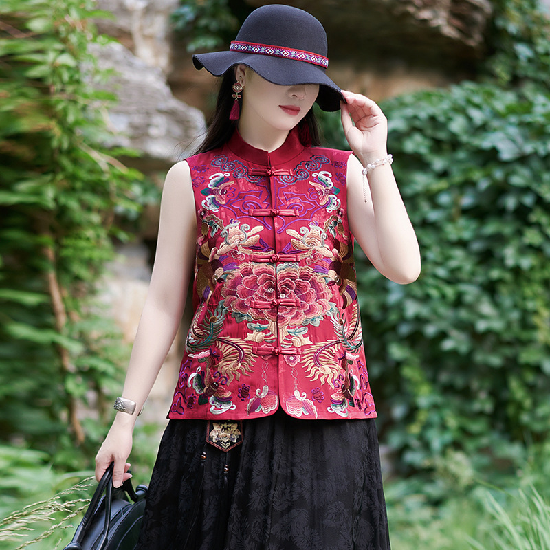 여름 중국 스타일 자수 조끼 자수 피닉스 버클 카디건 조끼 민족 스타일 여성 짧은 수직 칼라 허리 코트