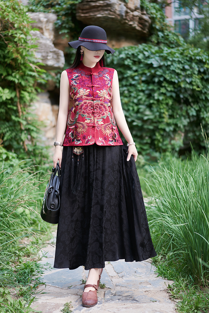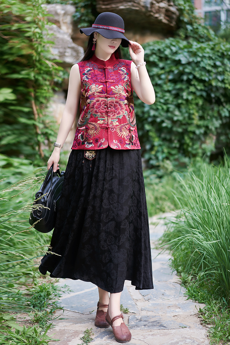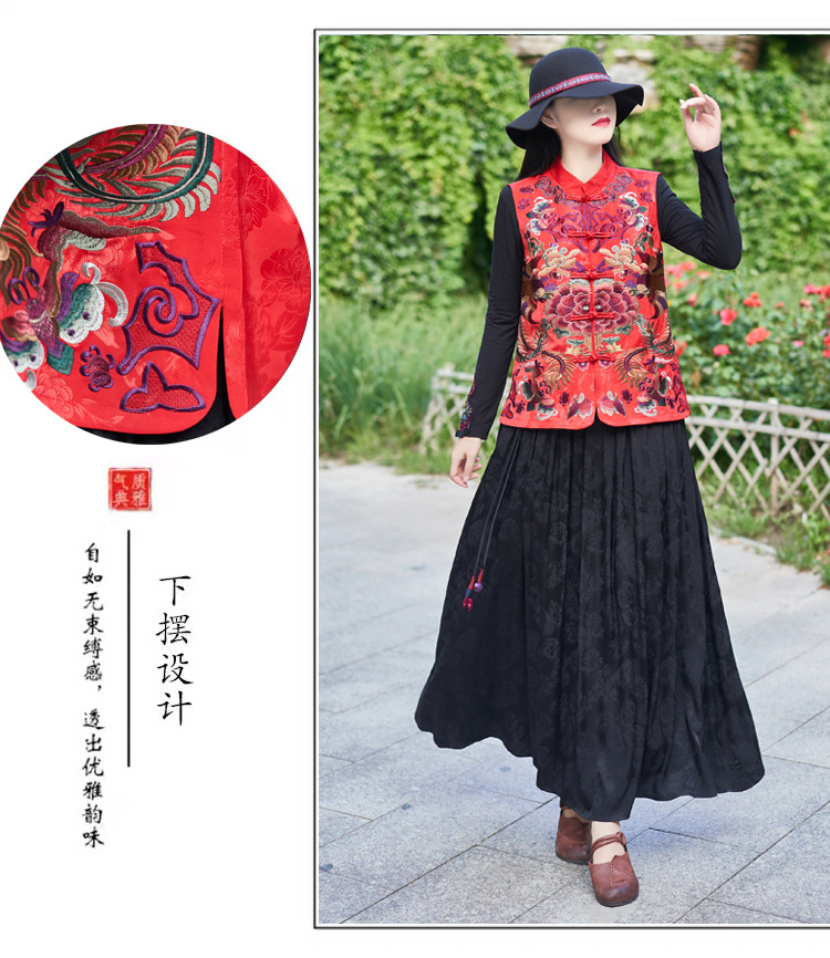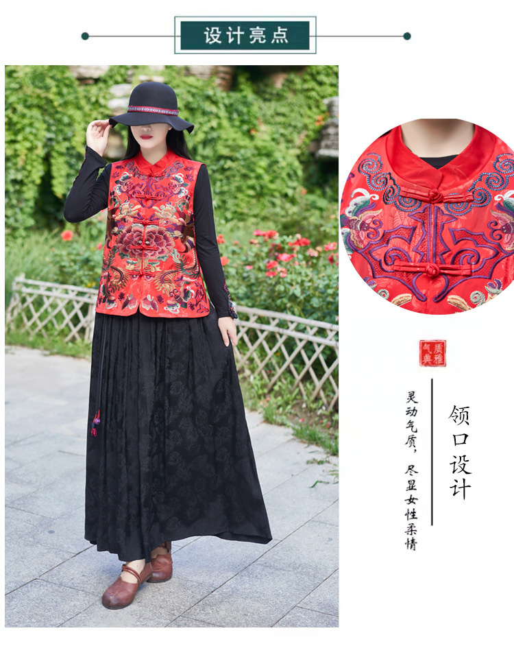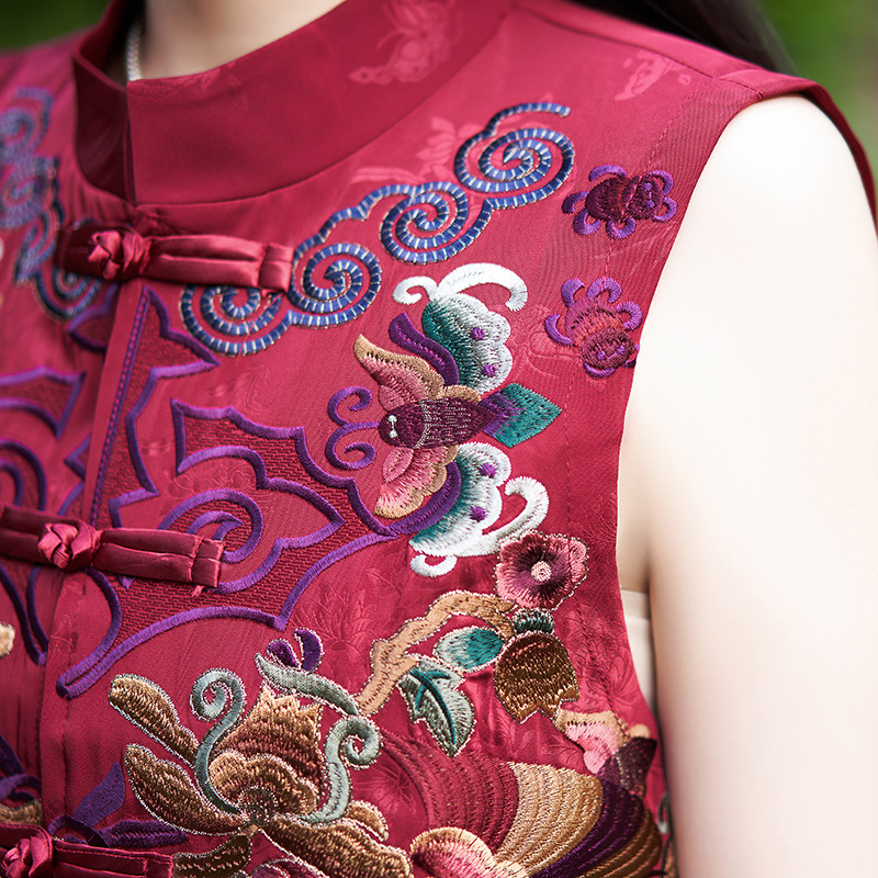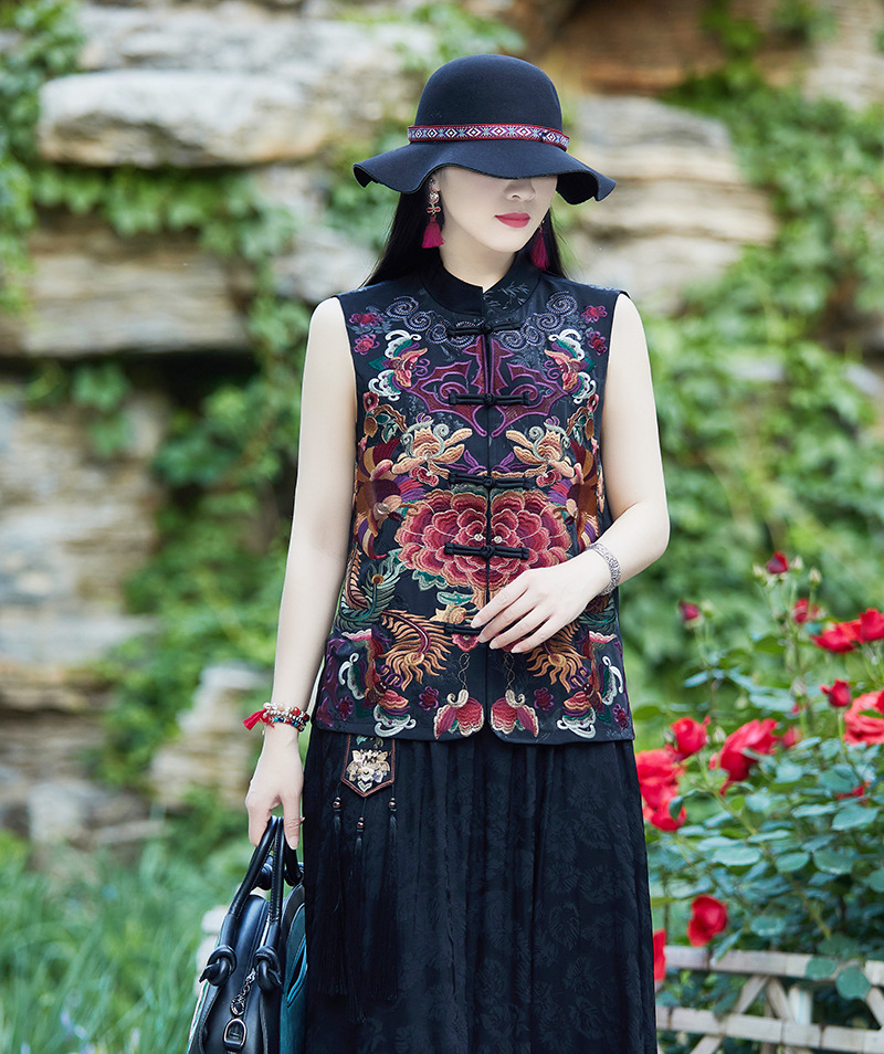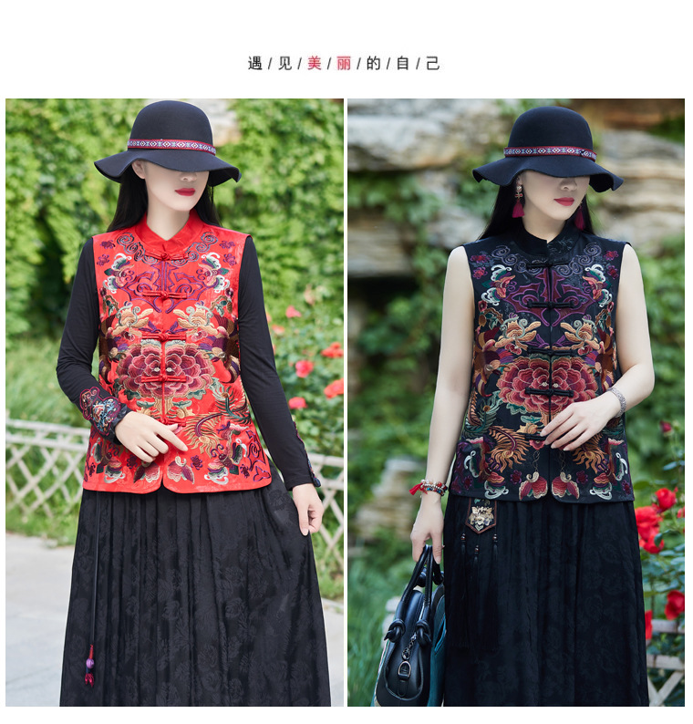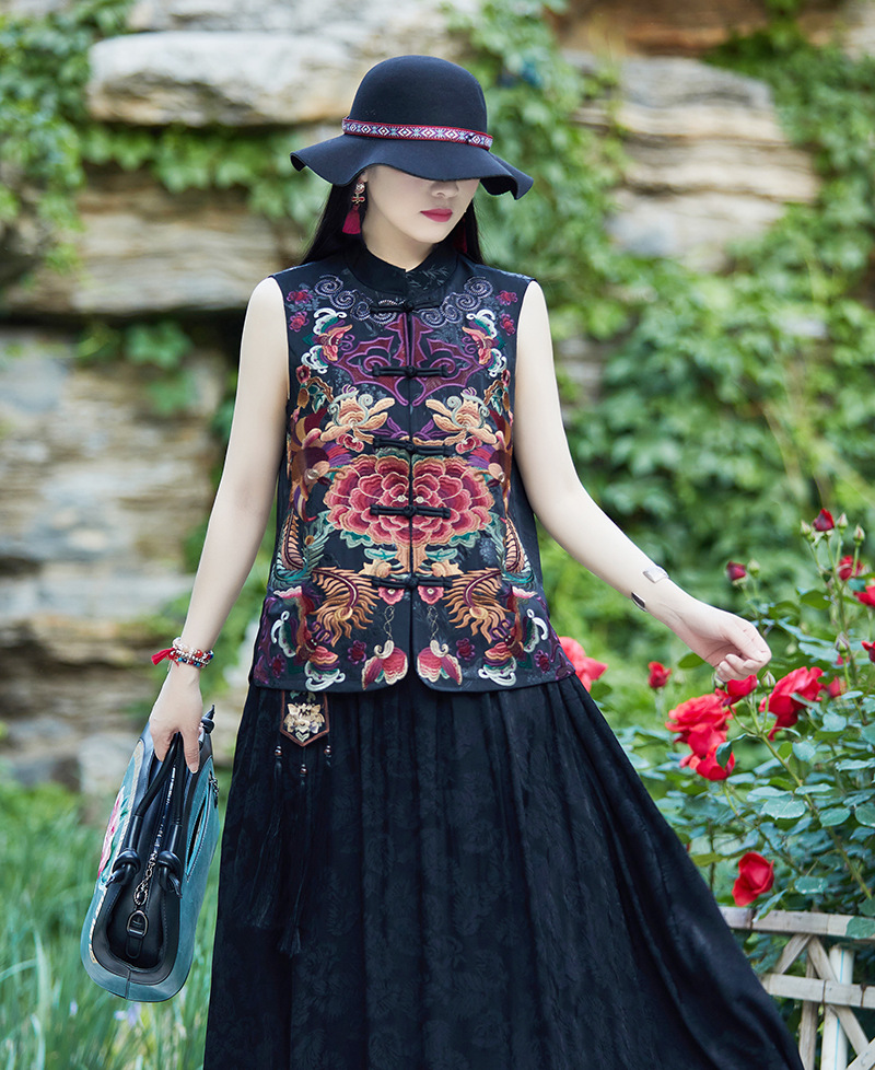 여름 중국 스타일 자수 조끼 자수 피닉스 버클 카디건 조끼 민족 스타일 여성 짧은 수직 칼라 허리 코트