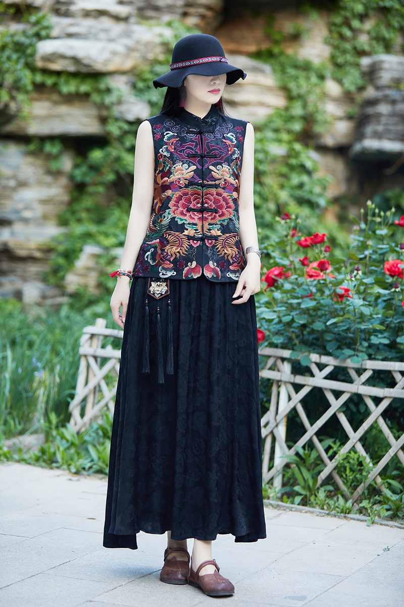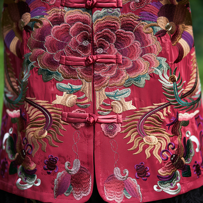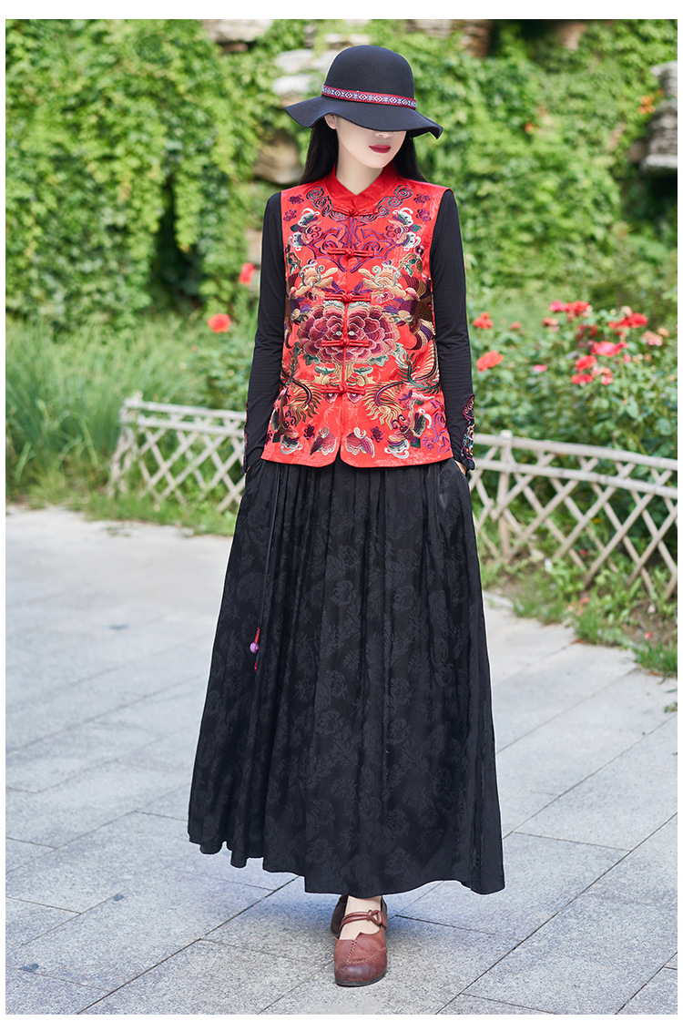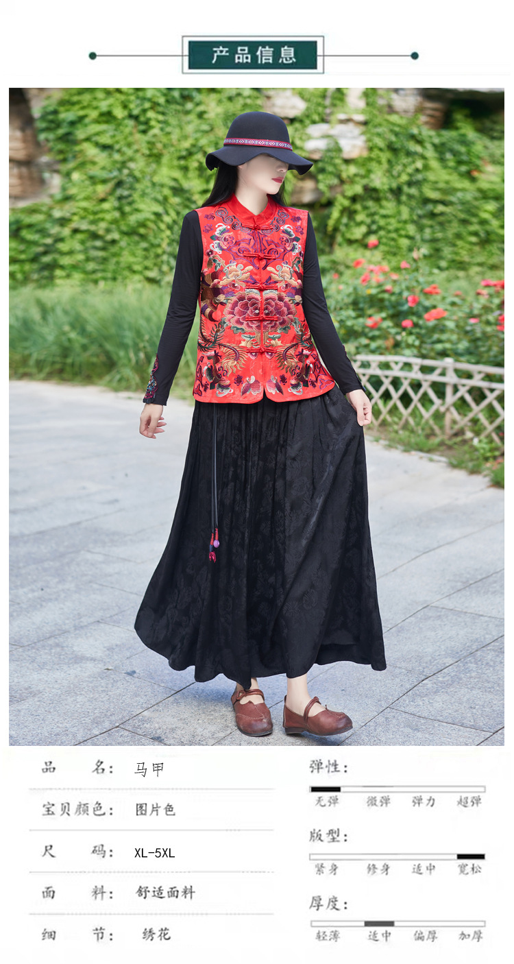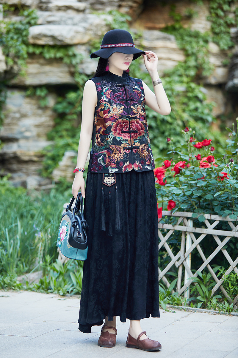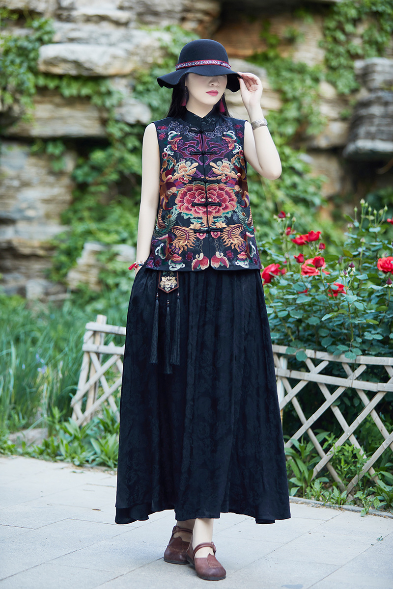 여름 중국 스타일 자수 조끼 자수 피닉스 버클 카디건 조끼 민족 스타일 여성 짧은 수직 칼라 허리 코트