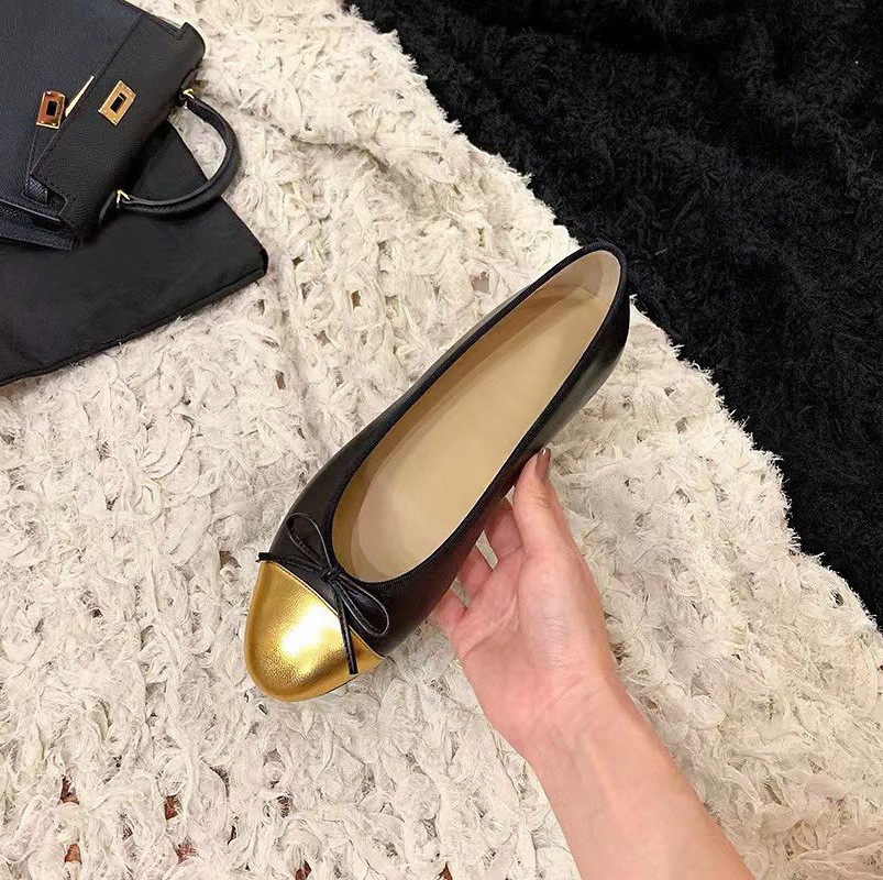 포도 엄마 같은 스타일 Cowhide 프랑스 싱글 레이어 신발 작은 샤넬 스타일 색상 매칭 활 라운드 발가락 얕은 입 우아한 발레 신발스토어 가기
