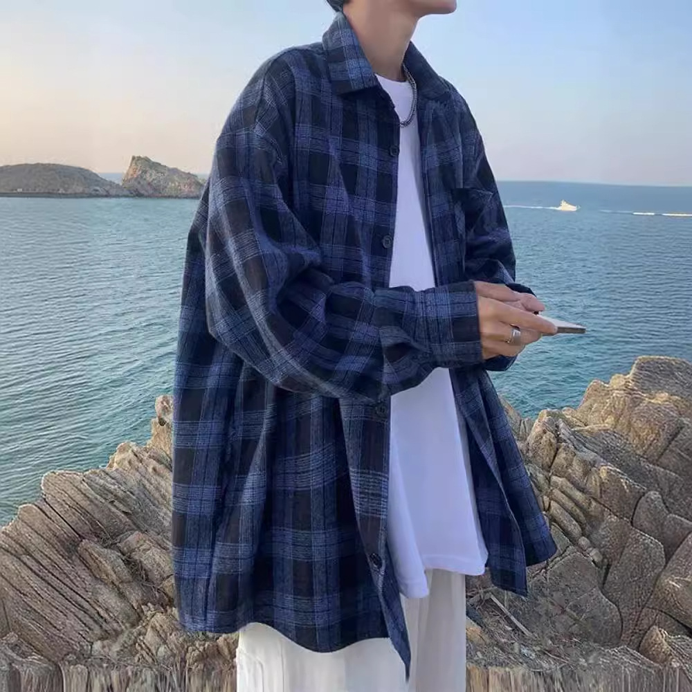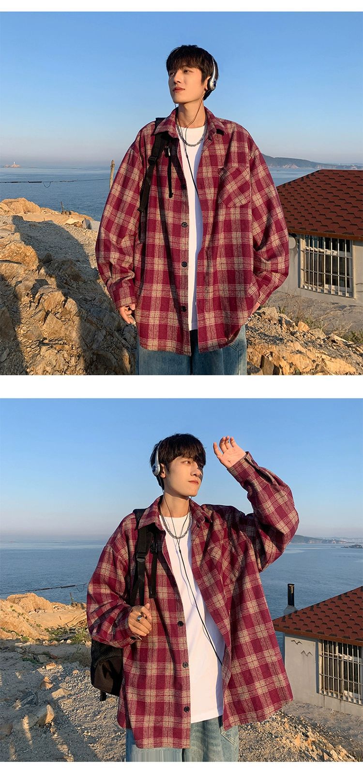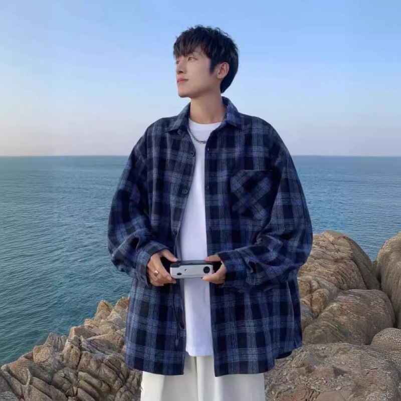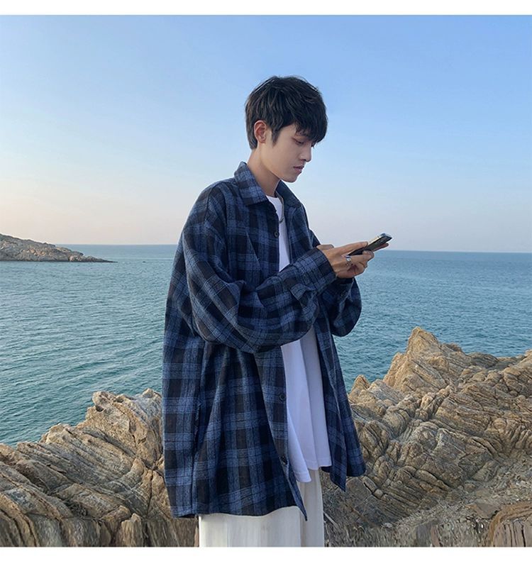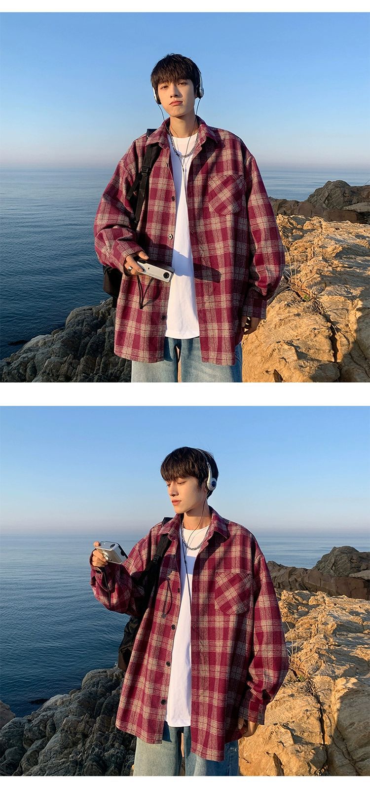 느슨한 레트로 캐주얼 트렌디 브랜드 셔츠 캐주얼 재킷 2024 봄과 가을 복고풍 격자 셔츠 남자 긴 소매 한국 스타일스토어 가기