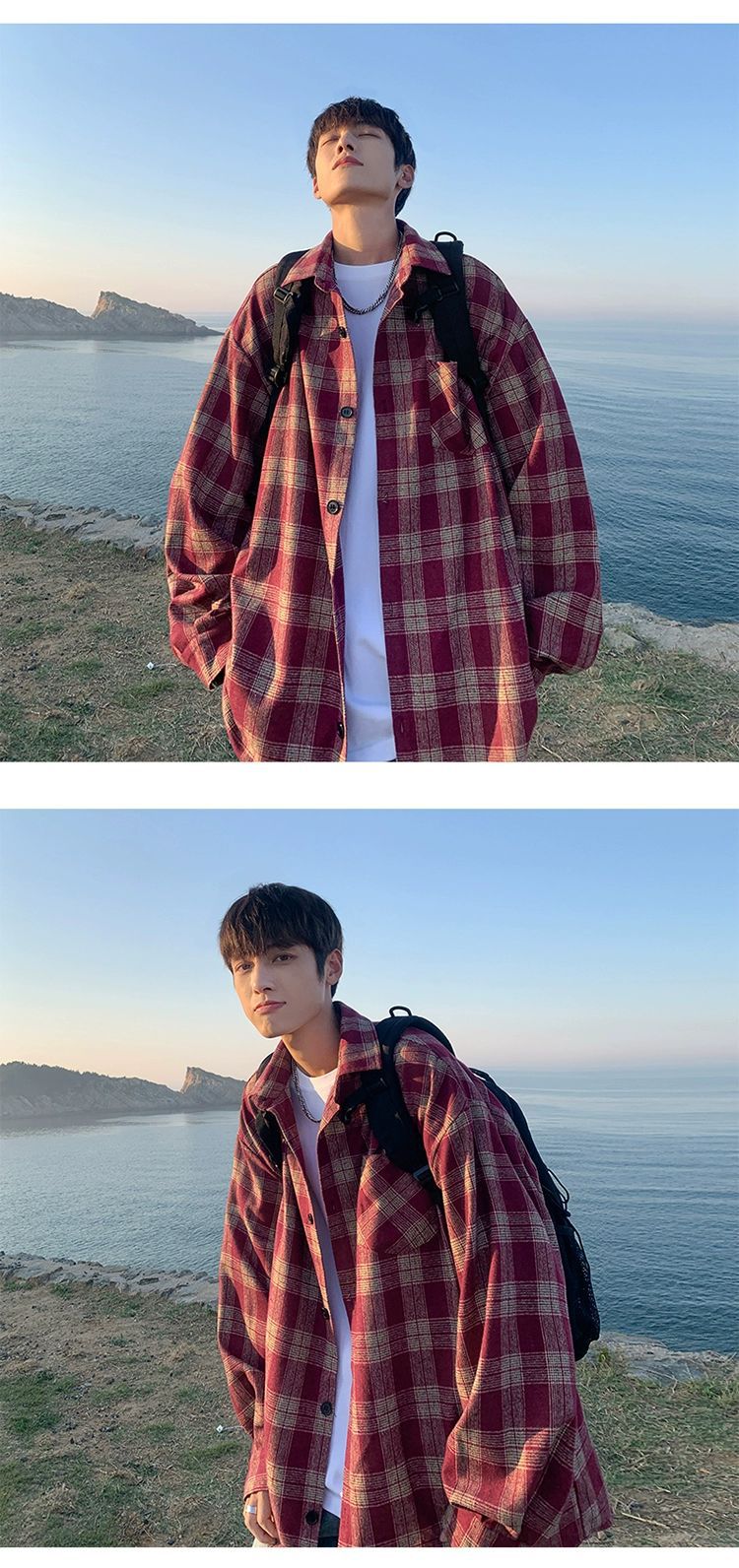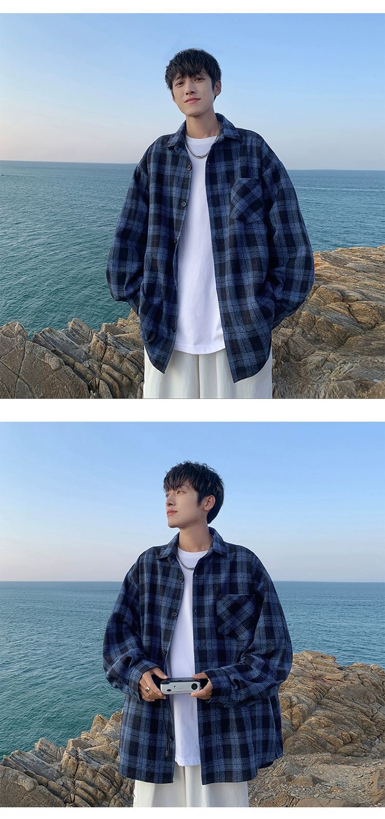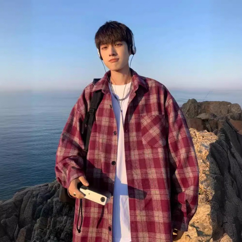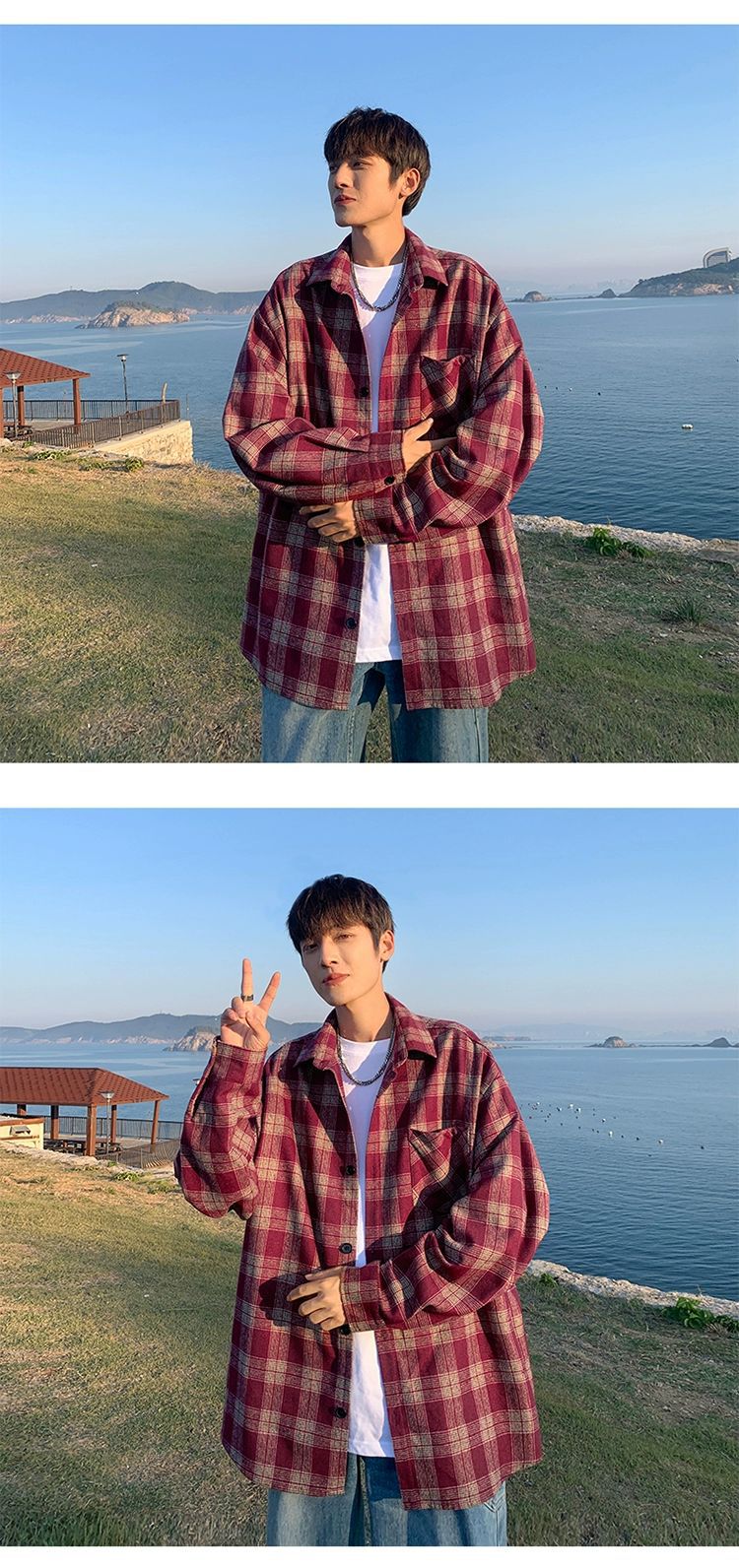 느슨한 레트로 캐주얼 트렌디 브랜드 셔츠 캐주얼 재킷 2024 봄과 가을 복고풍 격자 셔츠 남자 긴 소매 한국 스타일스토어 가기