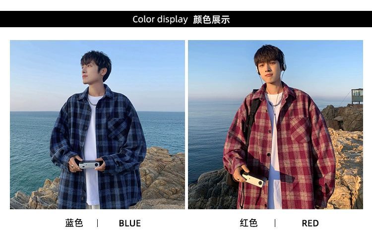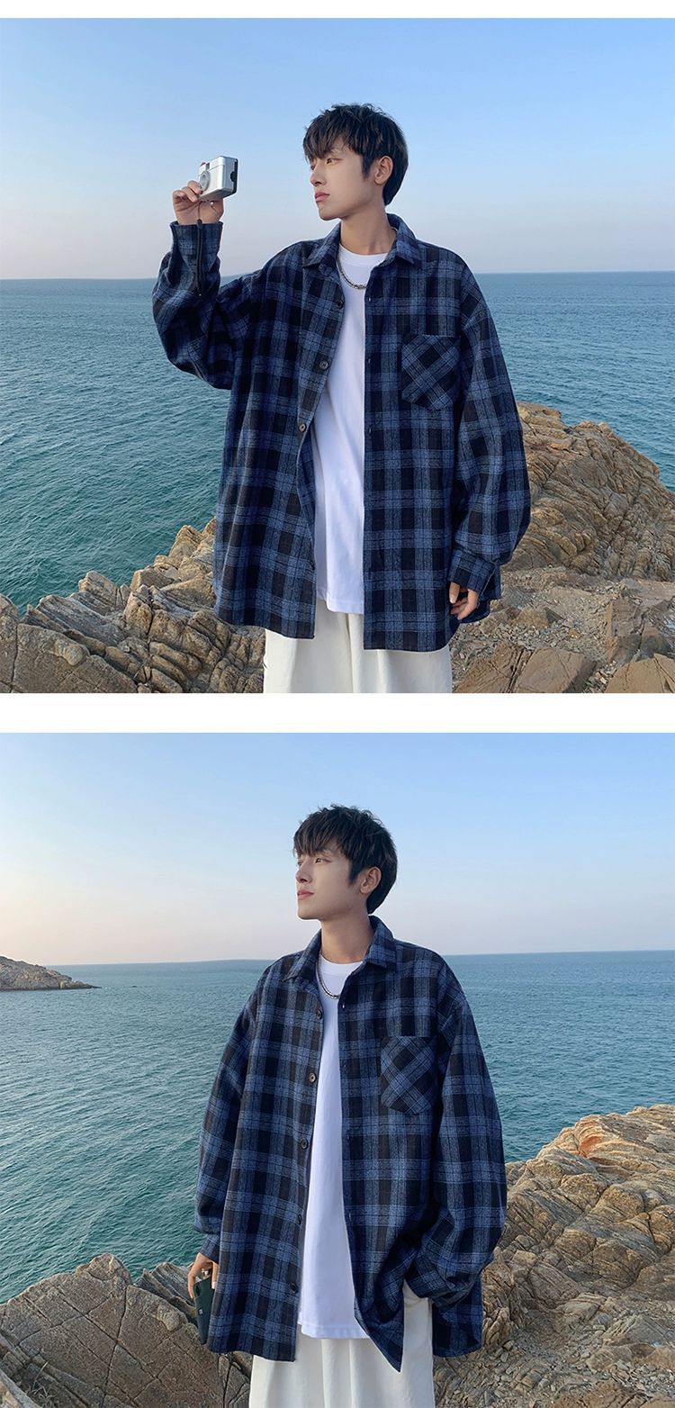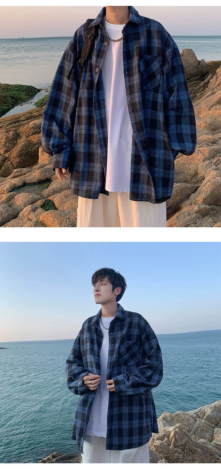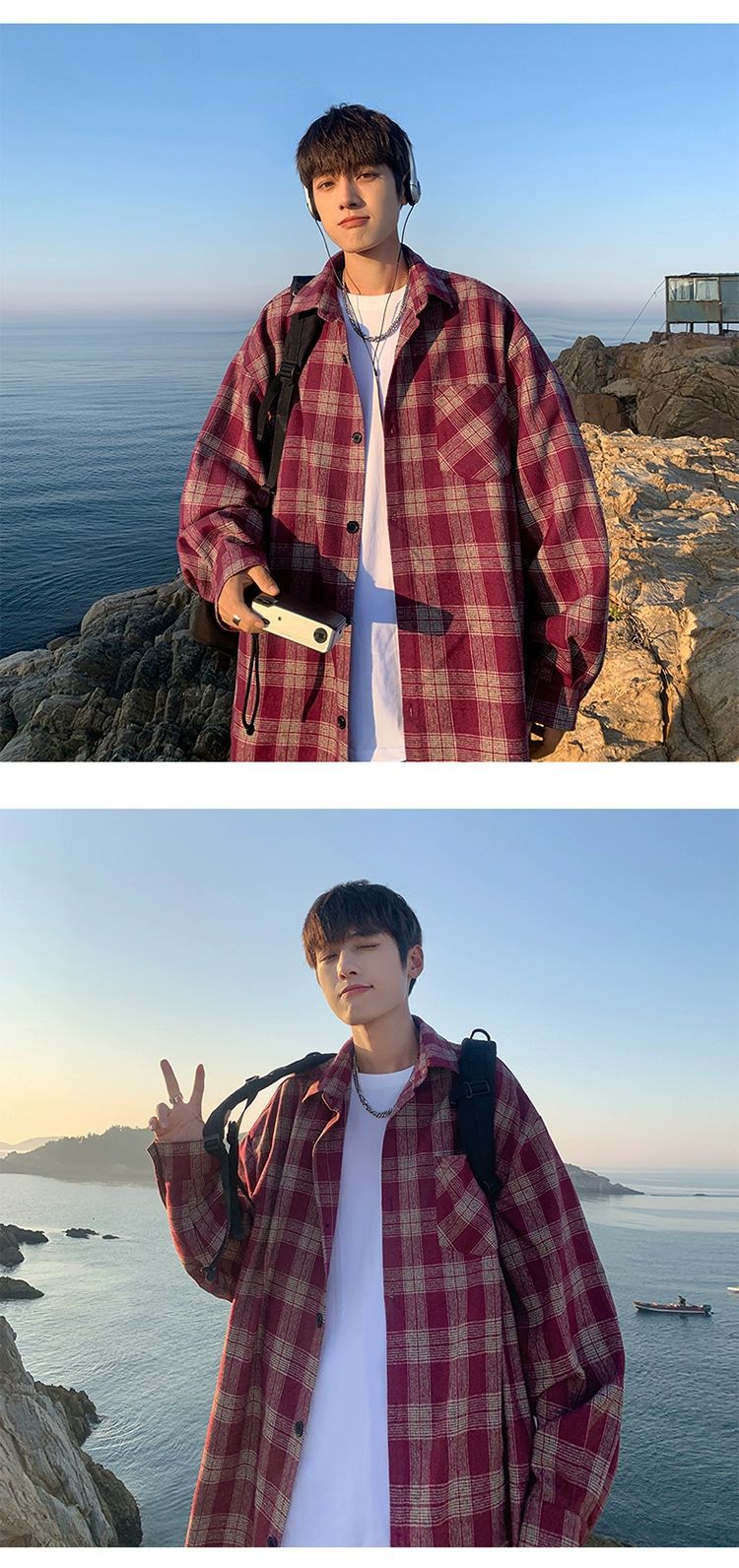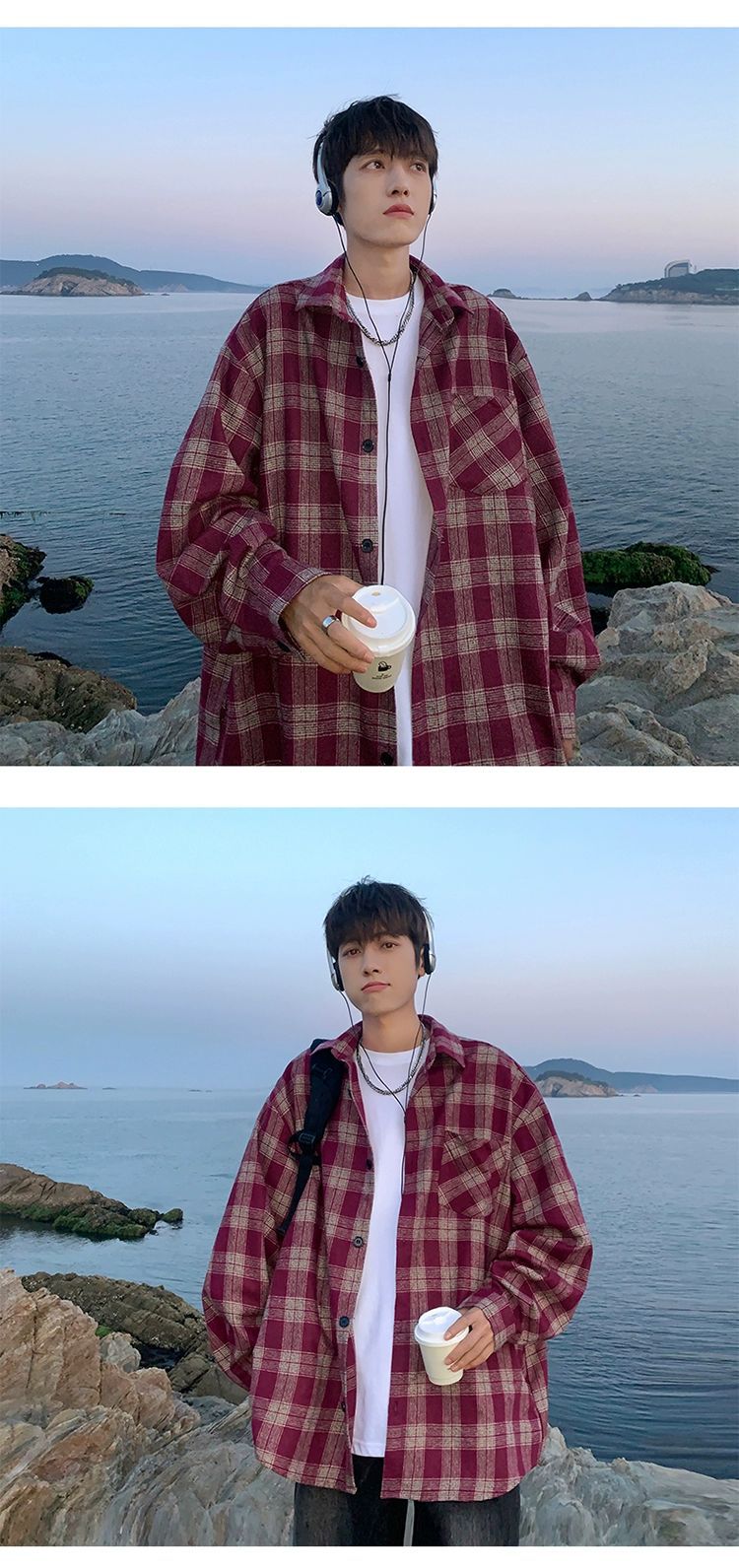 느슨한 레트로 캐주얼 트렌디 브랜드 셔츠 캐주얼 재킷 2024 봄과 가을 복고풍 격자 셔츠 남자 긴 소매 한국 스타일스토어 가기