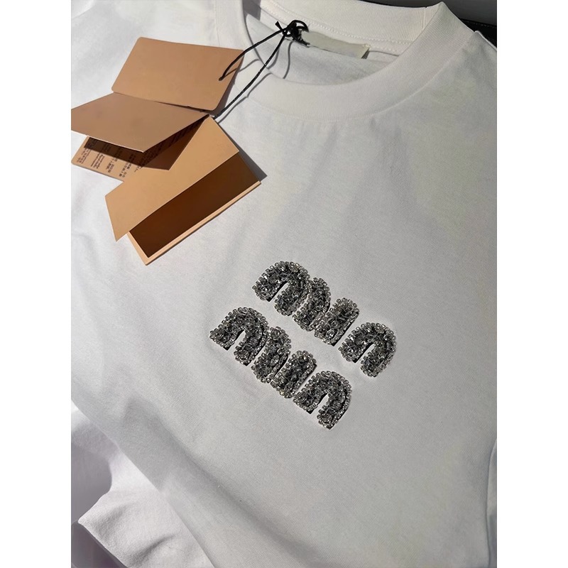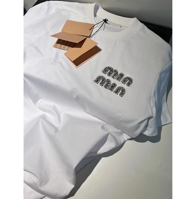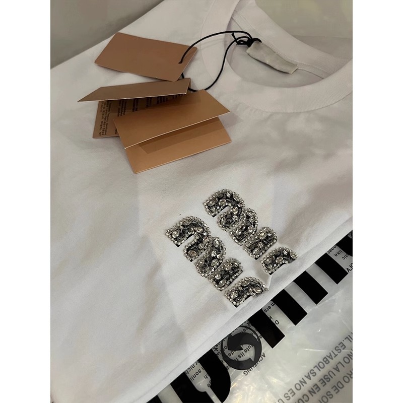 중공업 다이아몬드 편지 화이트 반팔 티셔츠 여성 여름 2024 새로운 유럽 느슨한 캐주얼 어깨 탑인스토어 가기
