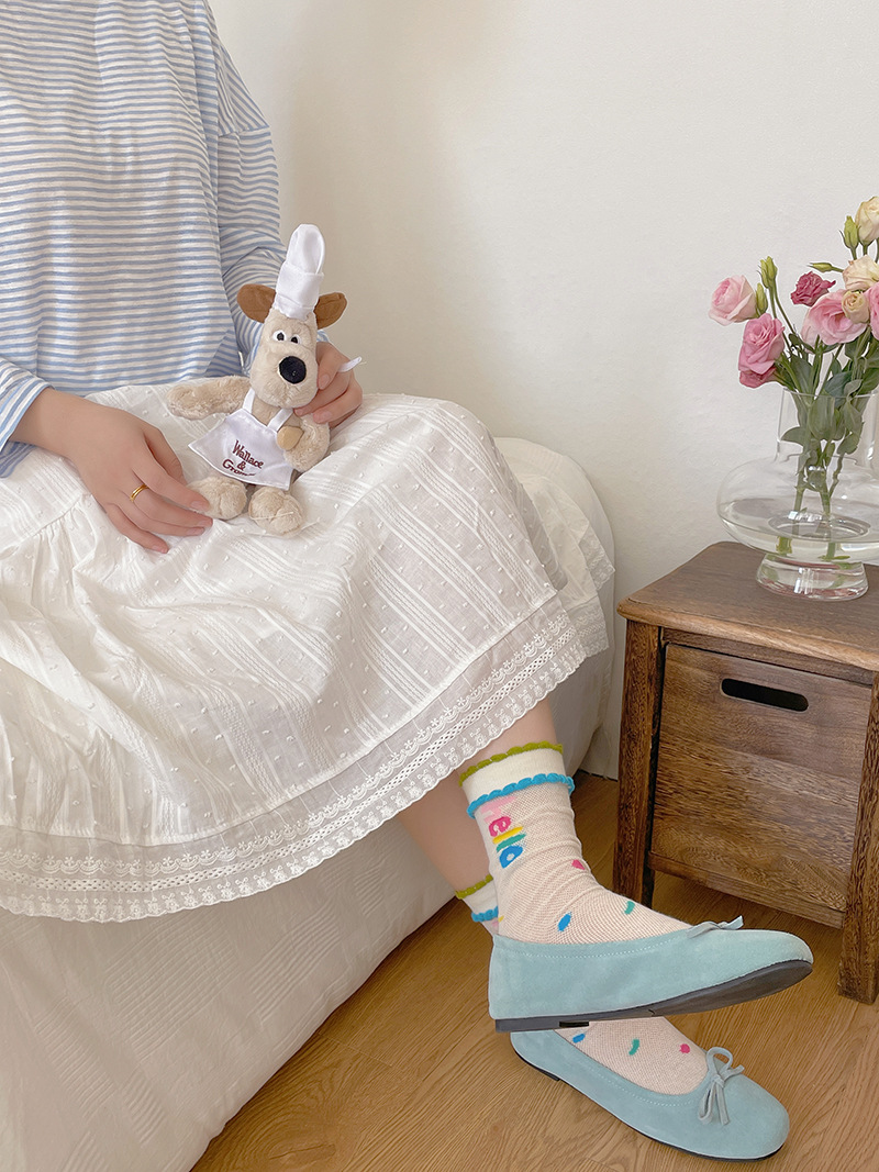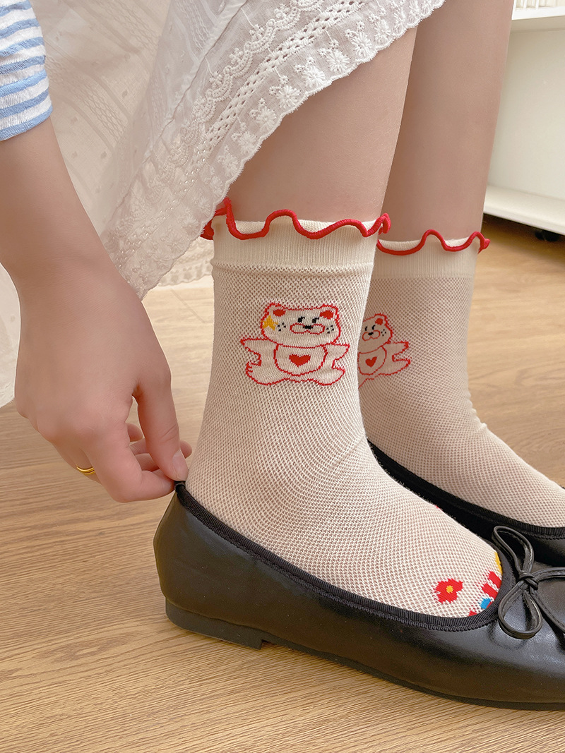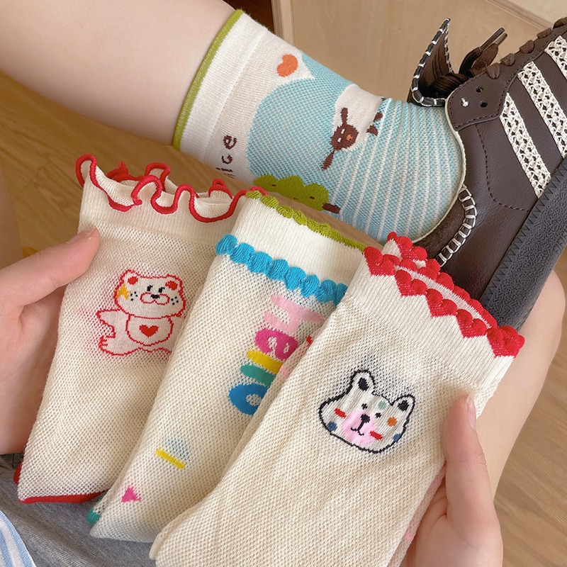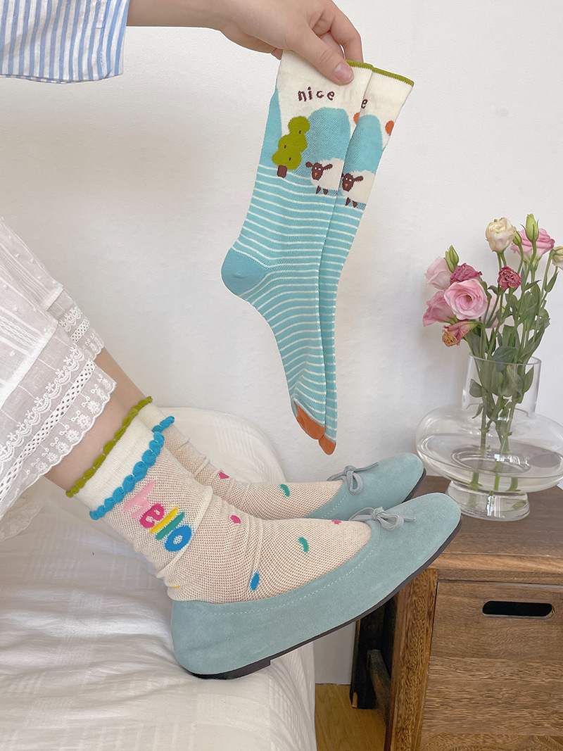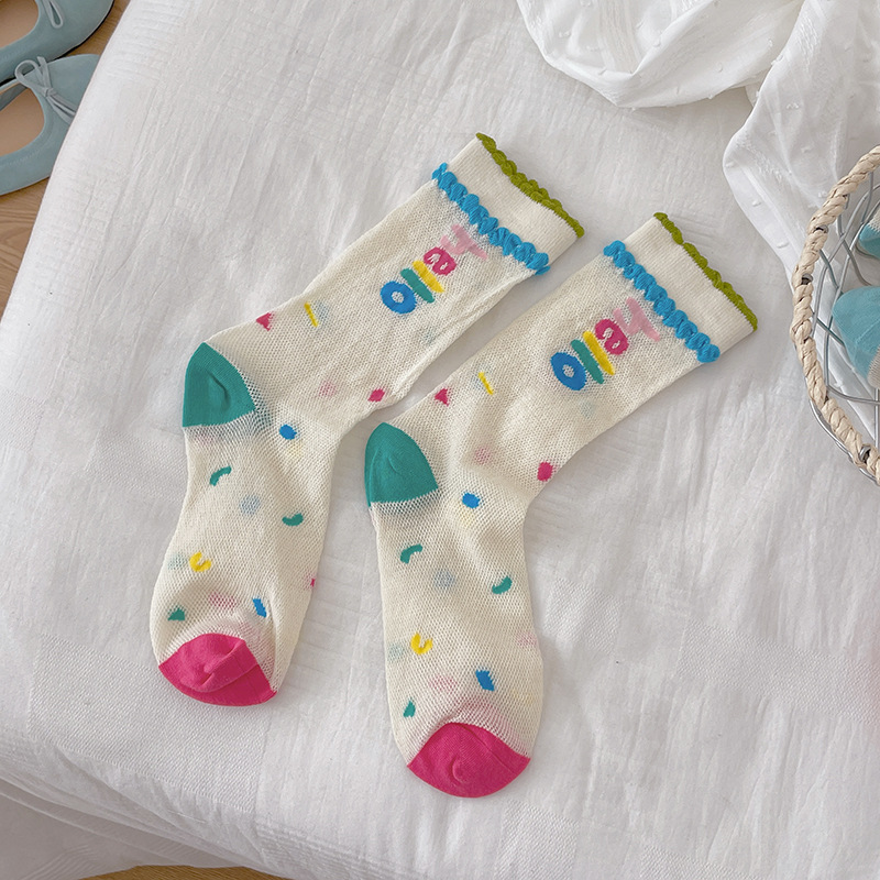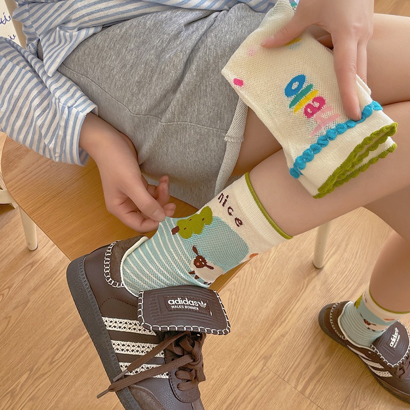 봄과 여름의 날 양말 여성의 얇은 메쉬 통기성 컬러 웨이브 도트 강아지 만화 코튼 양말 한국 스타일 미드 양말 유행