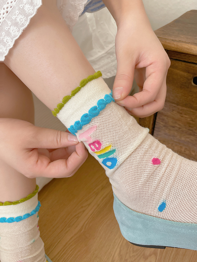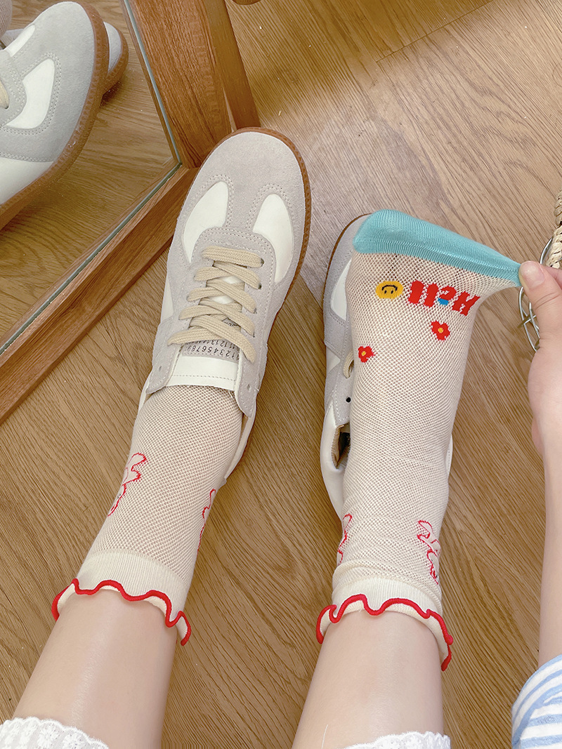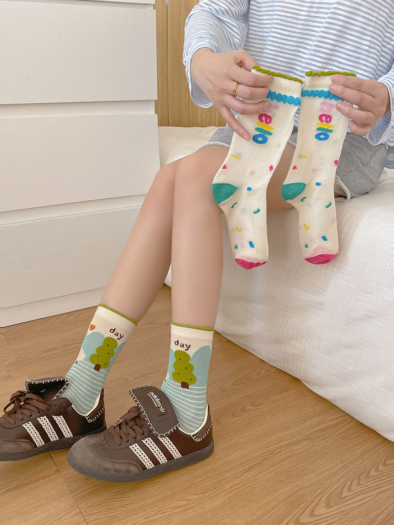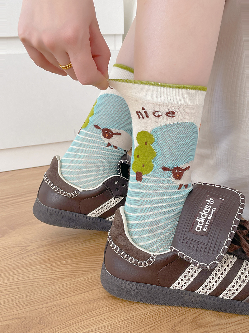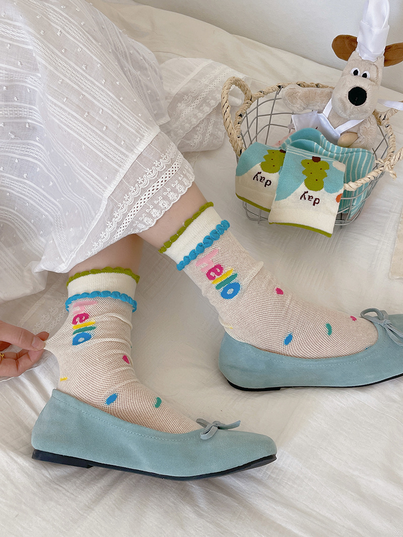 봄과 여름의 날 양말 여성의 얇은 메쉬 통기성 컬러 웨이브 도트 강아지 만화 코튼 양말 한국 스타일 미드 양말 유행
