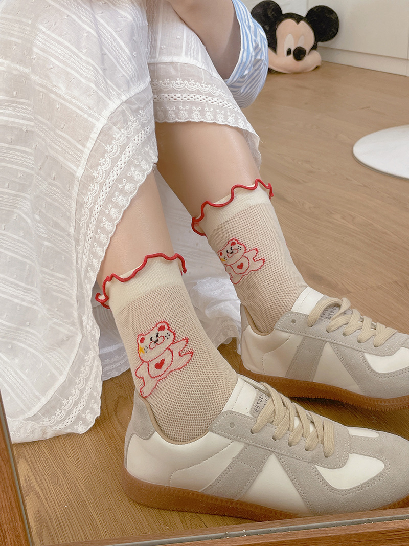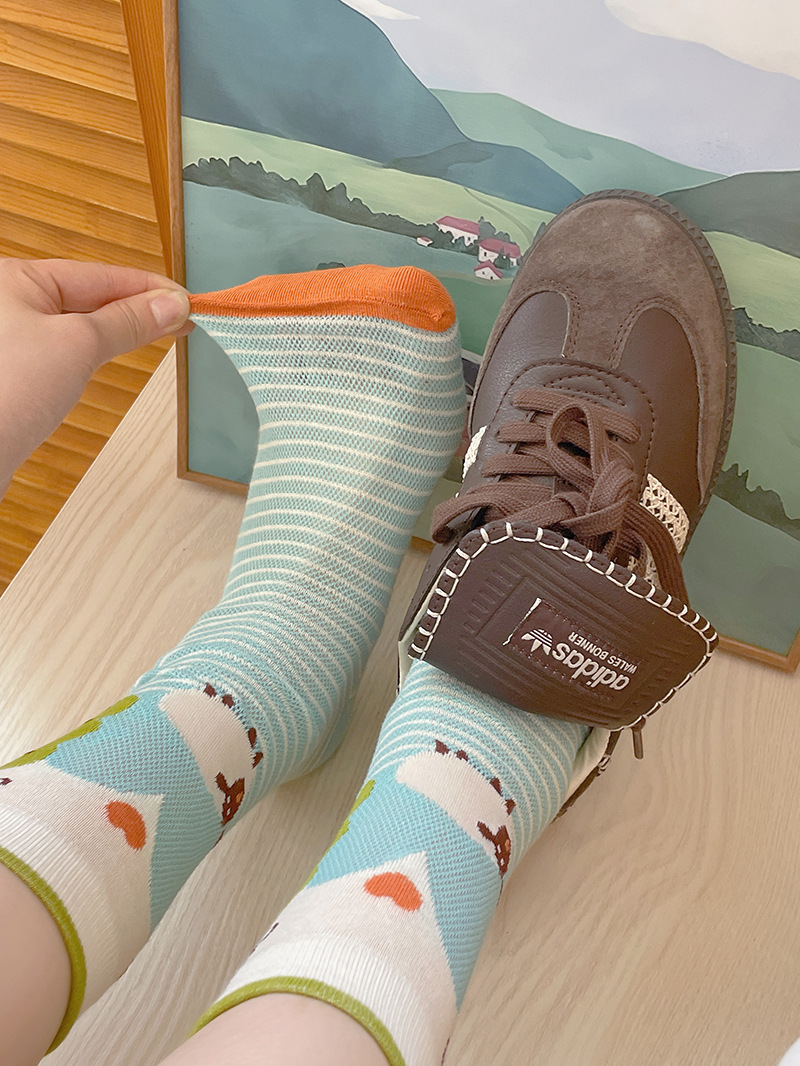 봄과 여름의 날 양말 여성의 얇은 메쉬 통기성 컬러 웨이브 도트 강아지 만화 코튼 양말 한국 스타일 미드 양말 유행스토어 가기