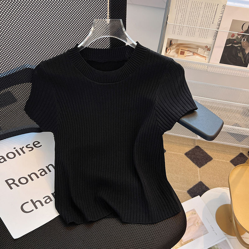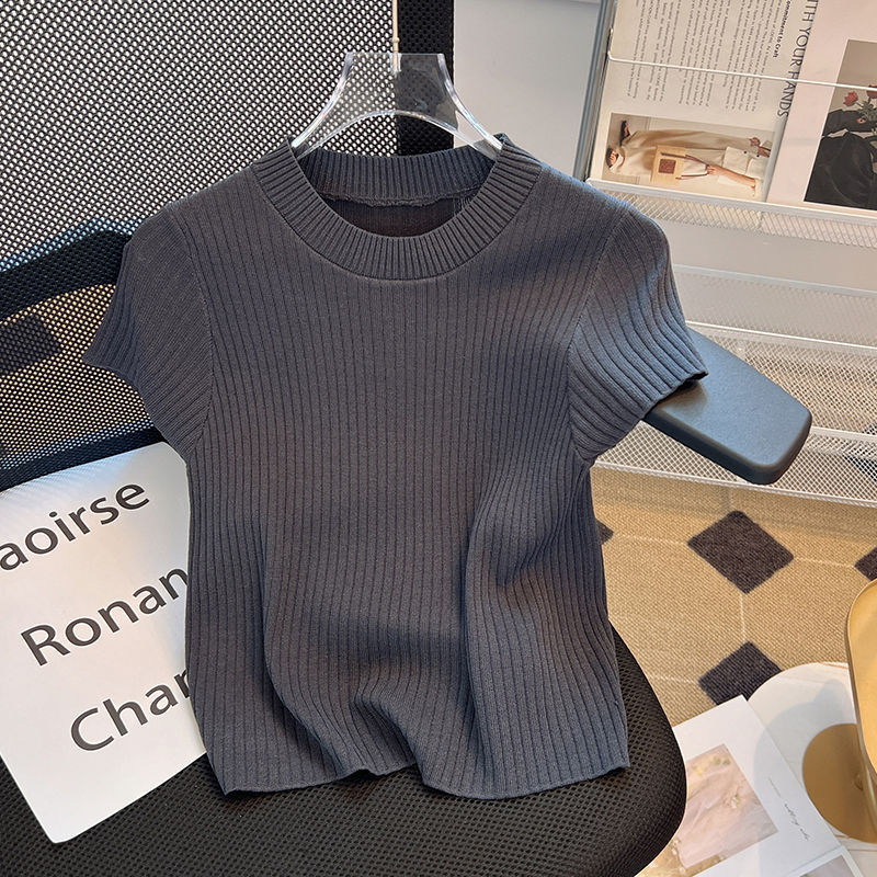 플러스 사이즈 통통녀 그레이 아이스 실크 니트 반팔 티셔츠 여성용 여름 얇은 슬림 핏 슬리밍 라이트 성숙한 스타일 티셔츠 탑