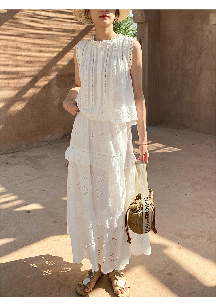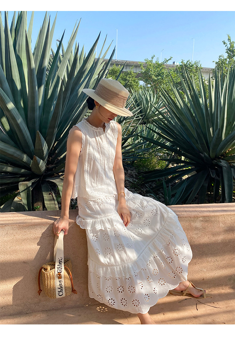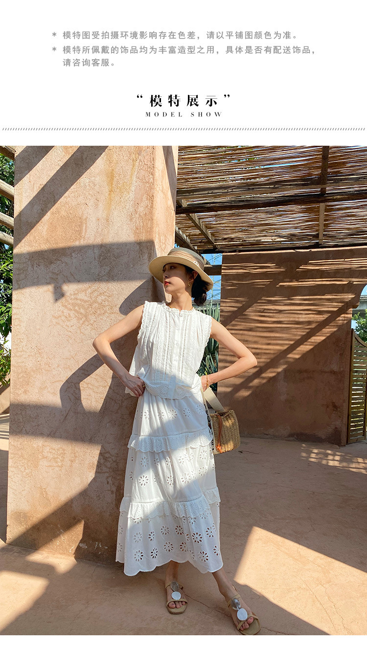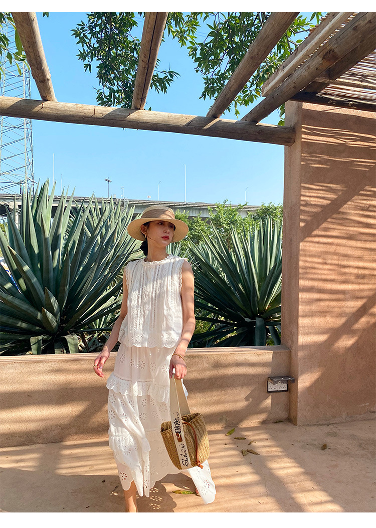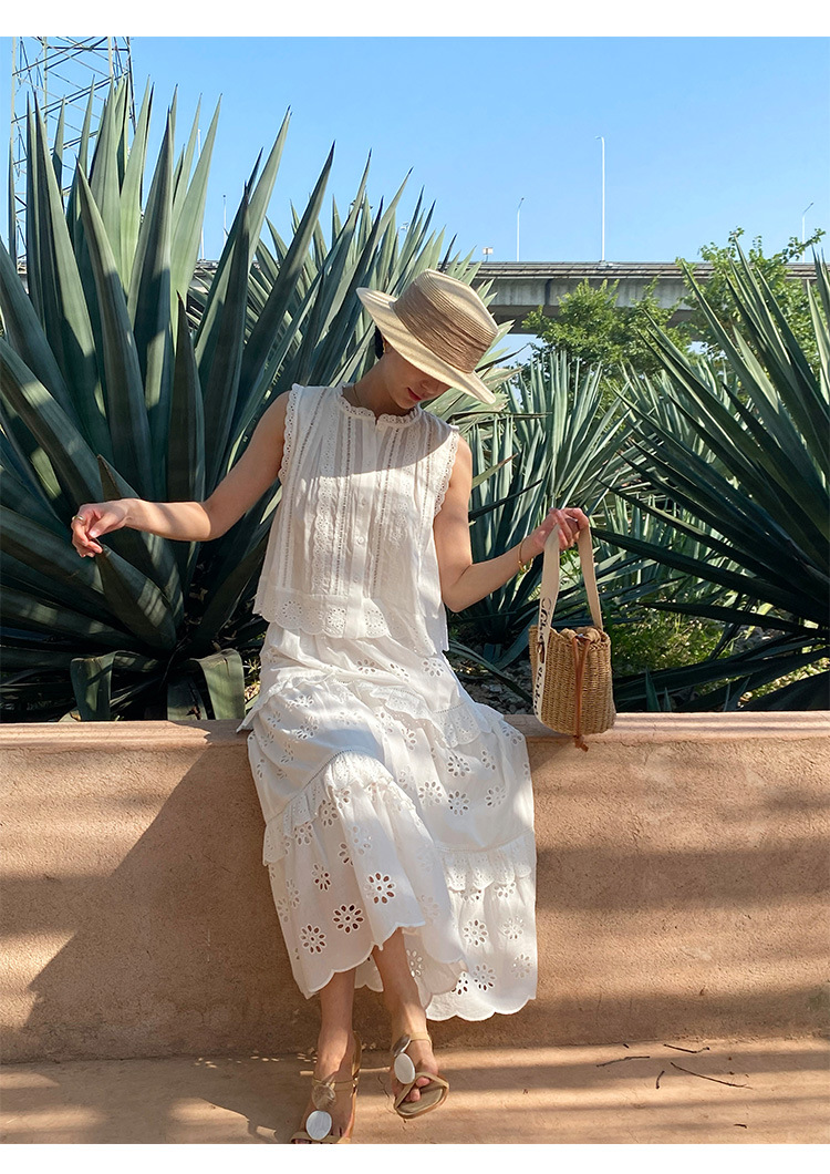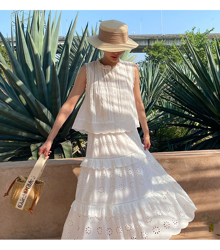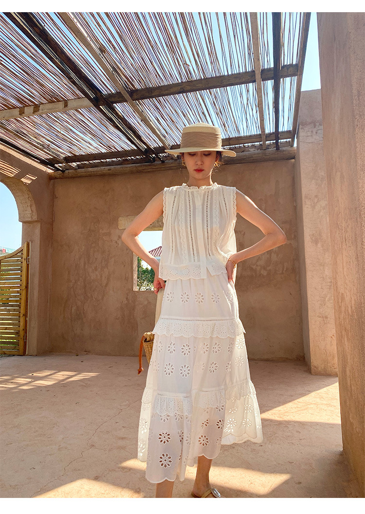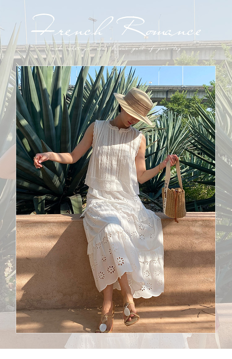 여름 새로운 프랑스 휴가 자수 작은 상단 절반 길이 원피스 여성 해외 무역 여성 의류 디자인 센스 세트