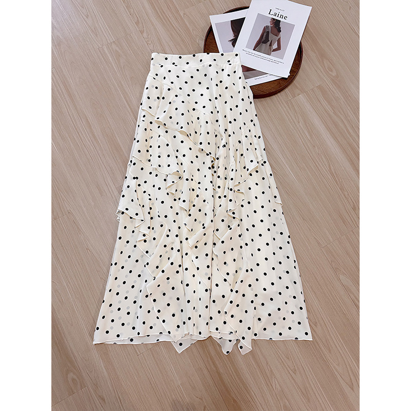 Qianyu 2026 여름 프렌치 스타일의 부드러운 디자인, 불규칙한 러플과 물방울무늬 하이웨이스트 롱 스커트스토어 가기