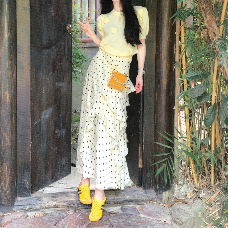 Qianyu 2026 여름 프렌치 스타일의 부드러운 디자인, 불규칙한 러플과 물방울무늬 하이웨이스트 롱 스커트