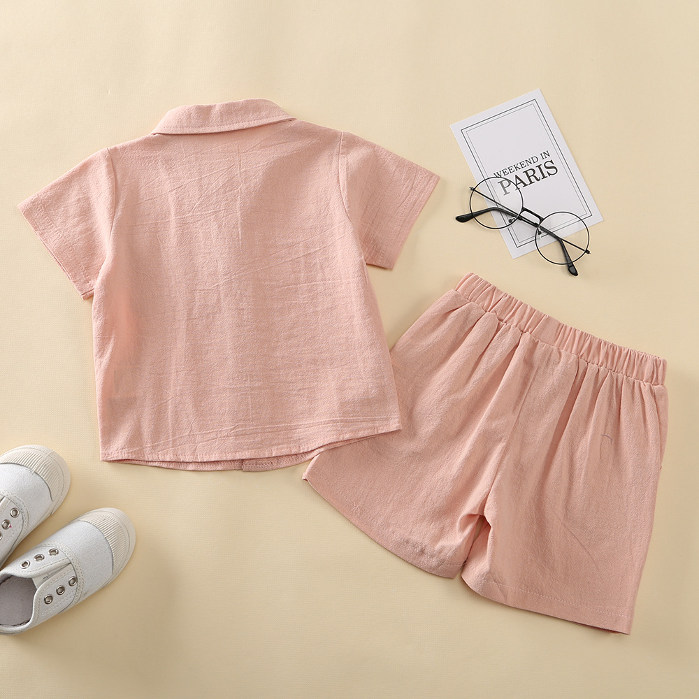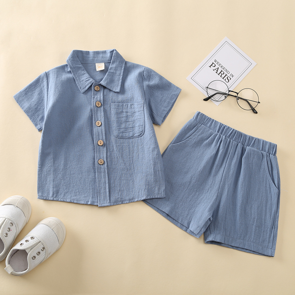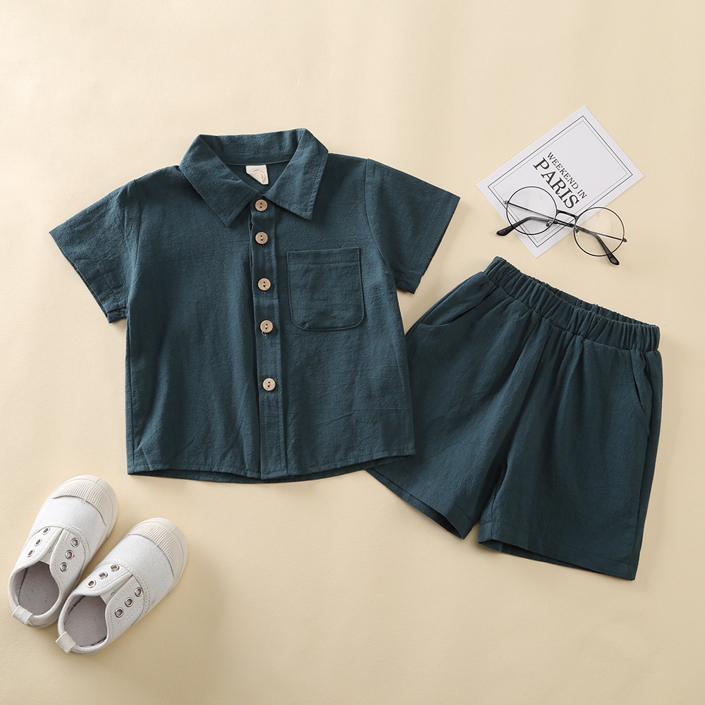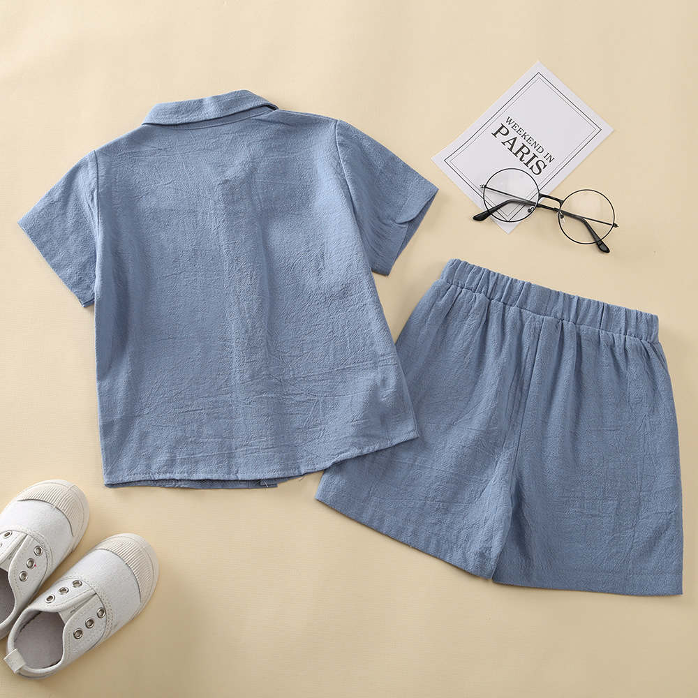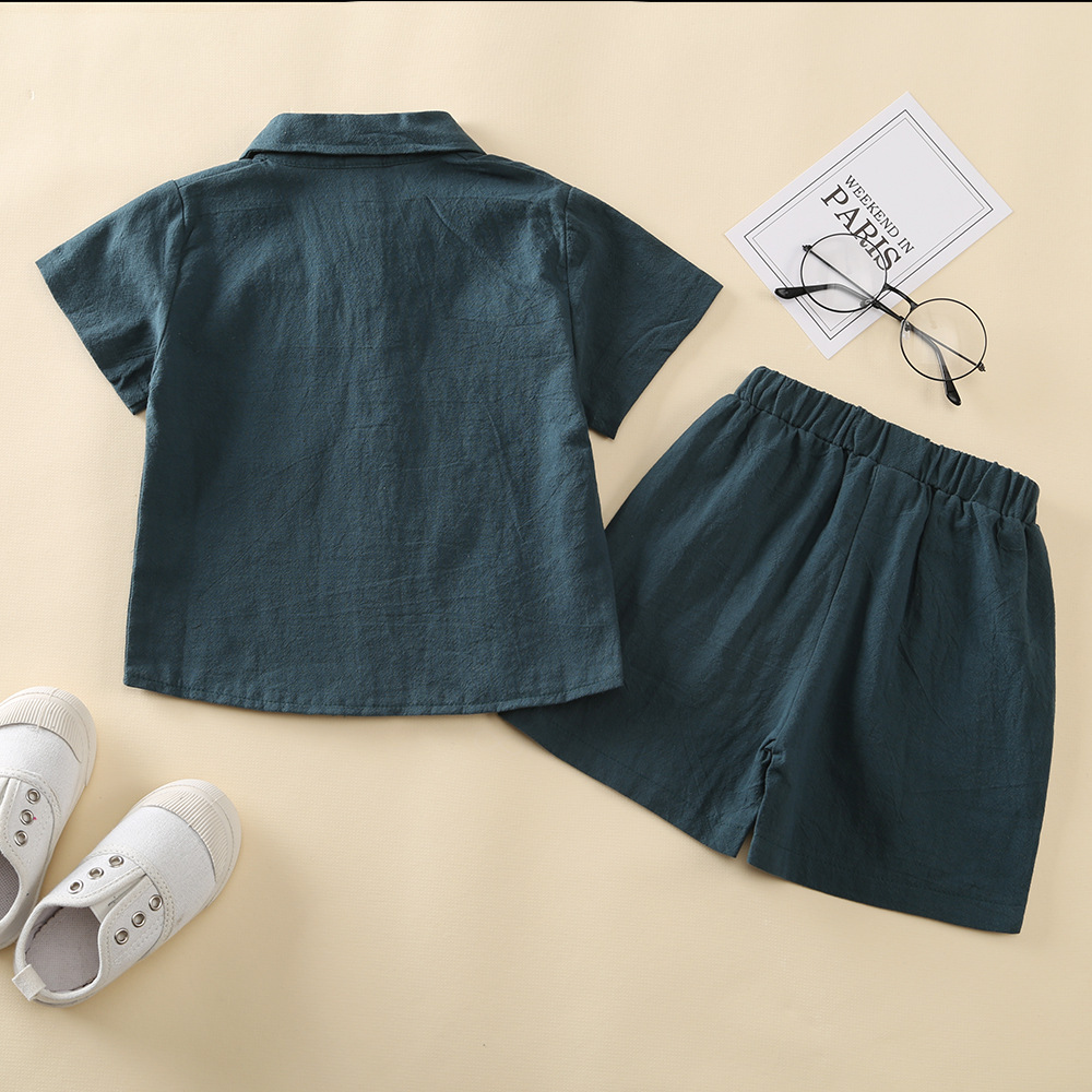 2024 여름 소년 솔리드 컬러 옷깃 코튼 반팔 셔츠 반바지 정장 아동 캐주얼 투피스 세트 대외 무역 아동 의류