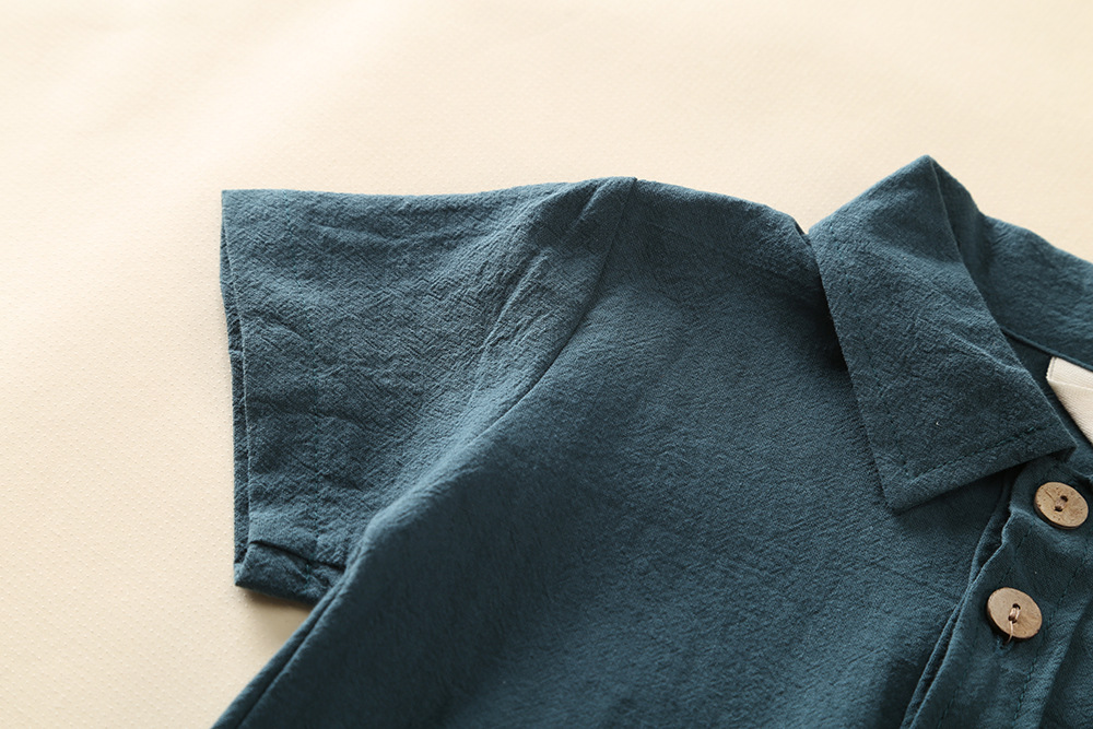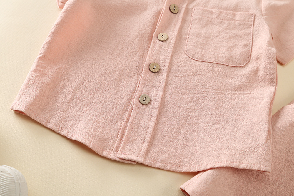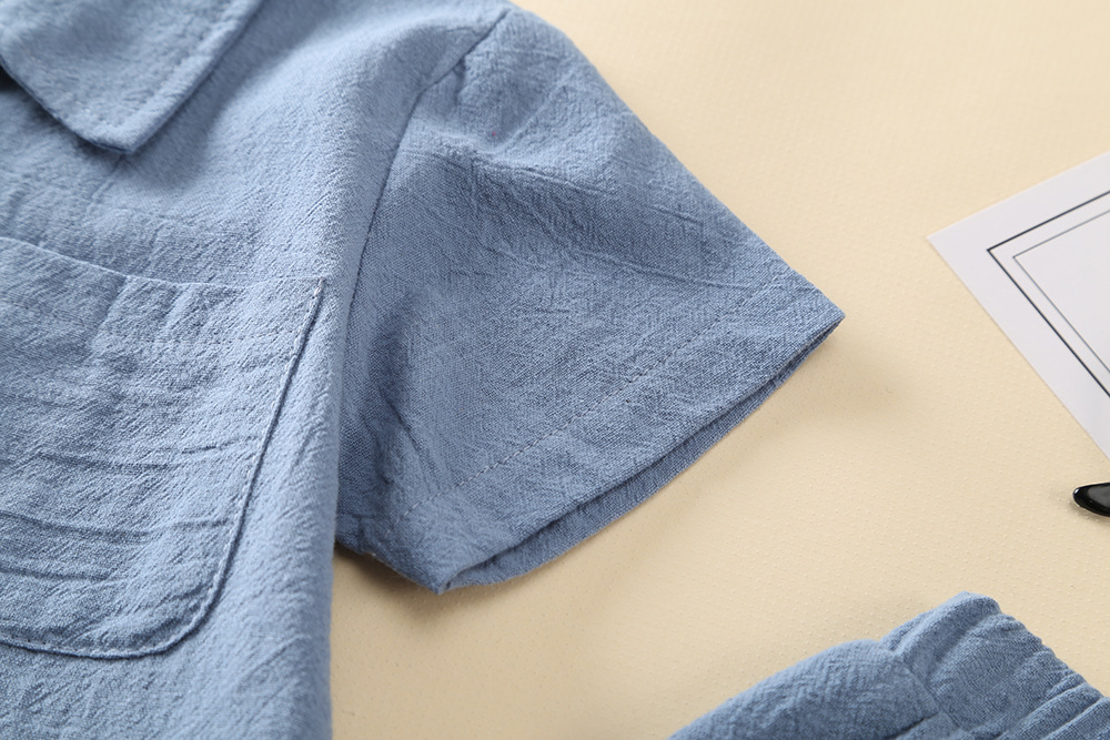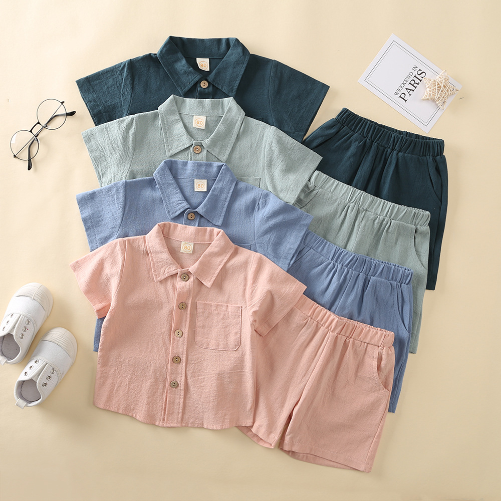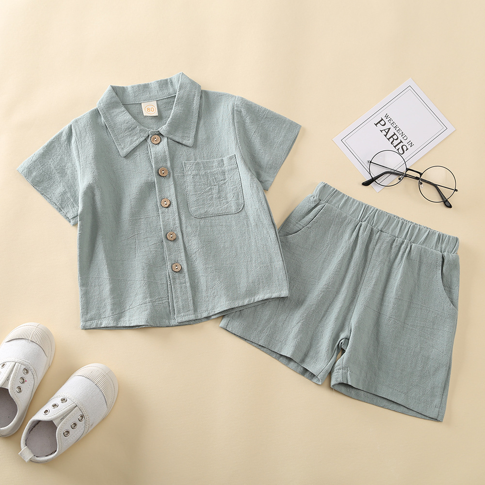 2024 여름 소년 솔리드 컬러 옷깃 코튼 반팔 셔츠 반바지 정장 아동 캐주얼 투피스 세트 대외 무역 아동 의류스토어 가기
