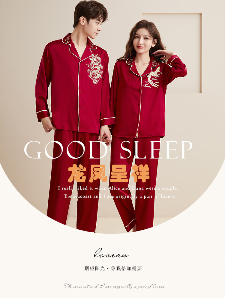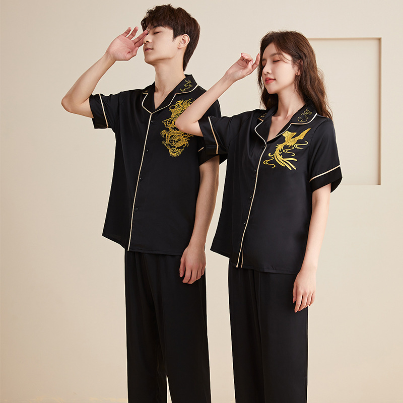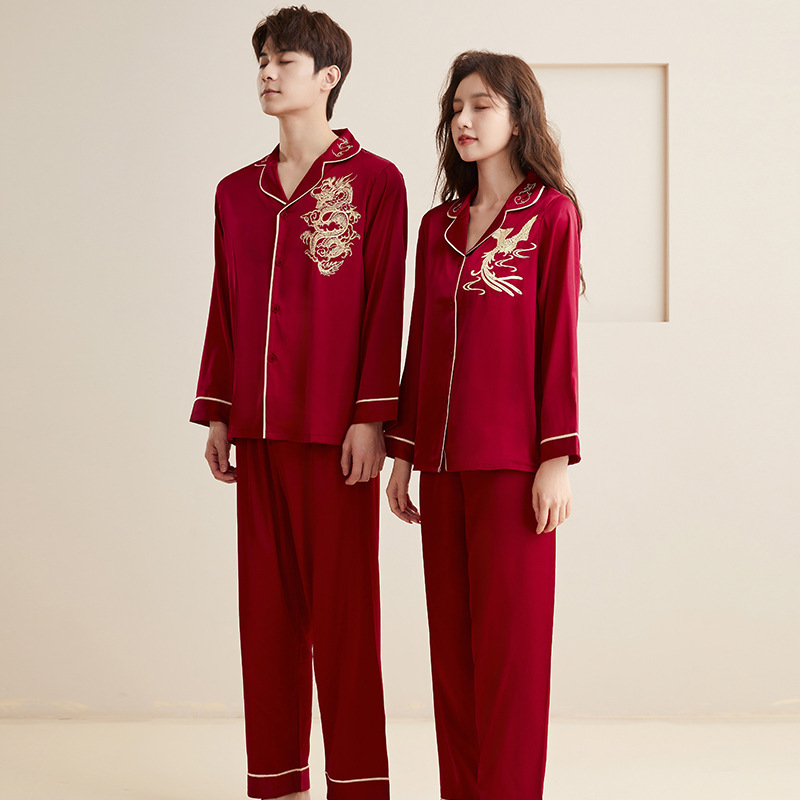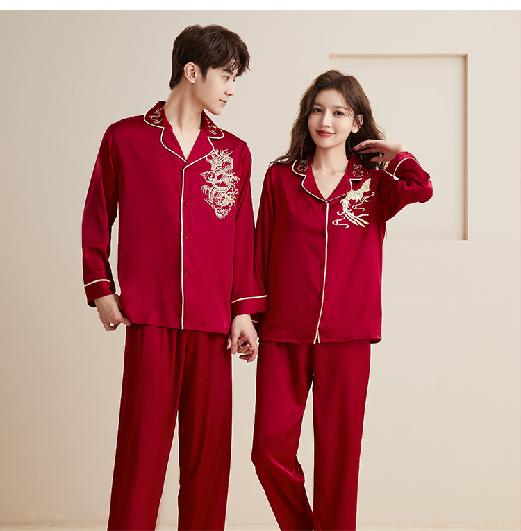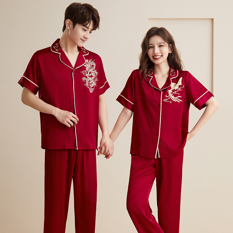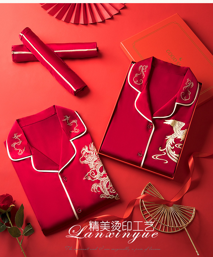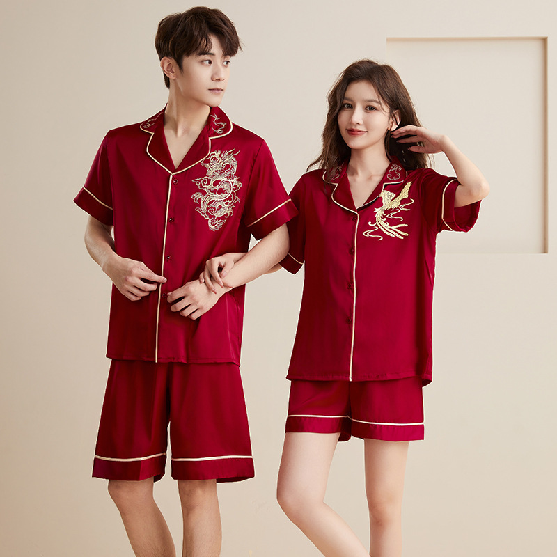 커플 잠옷 레드 웨딩 여성의 봄과 여름 새틴 반팔 신년 가을 드래곤과 피닉스 홈 의류 세트