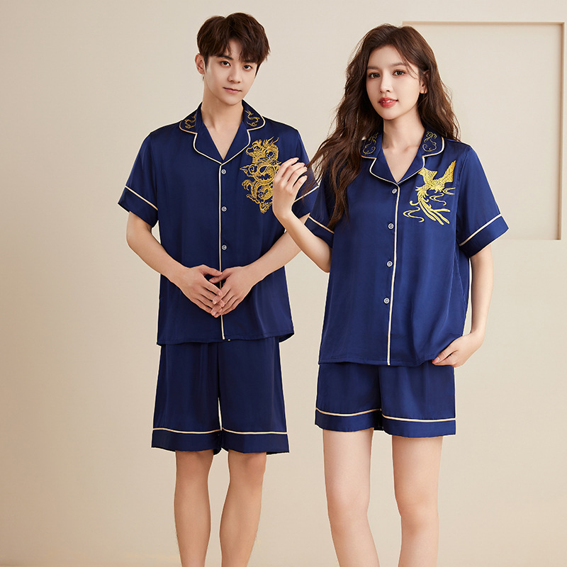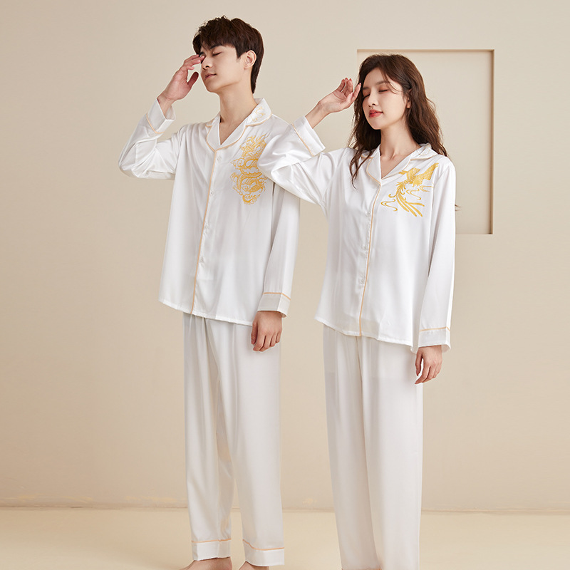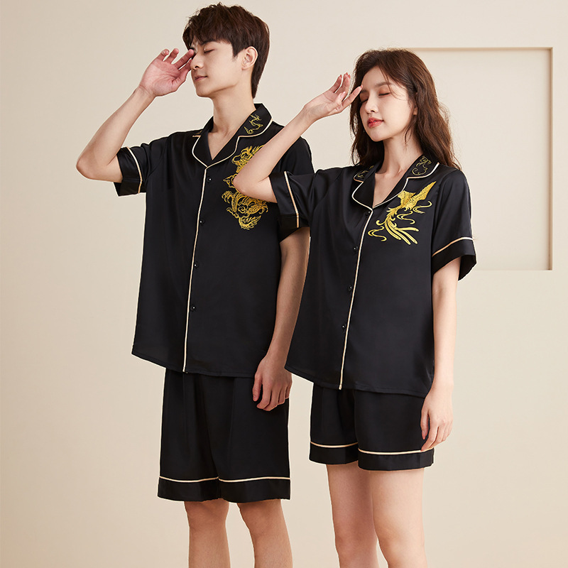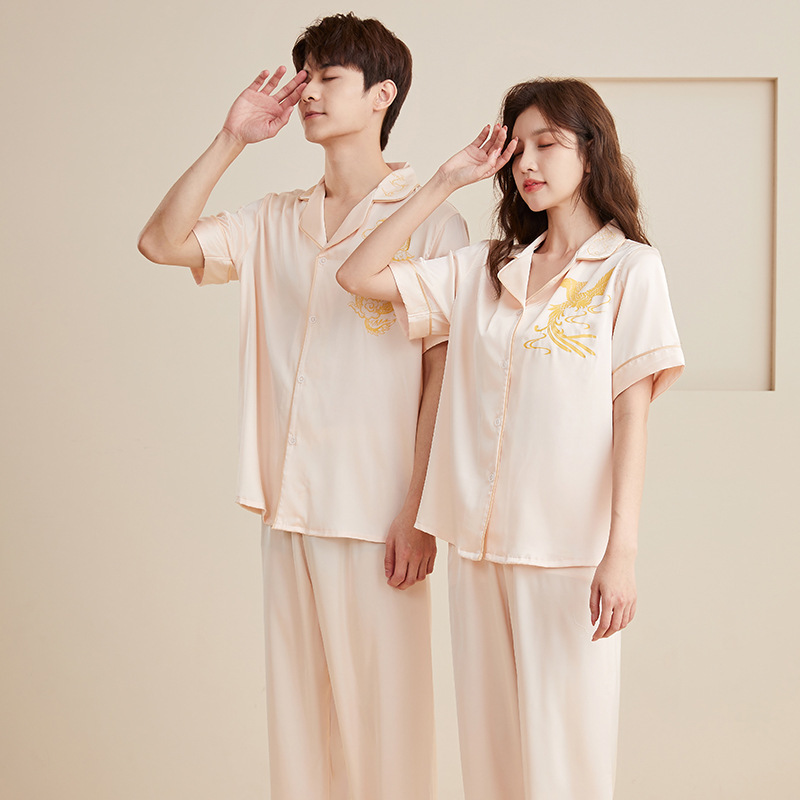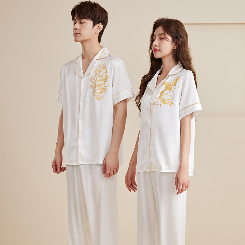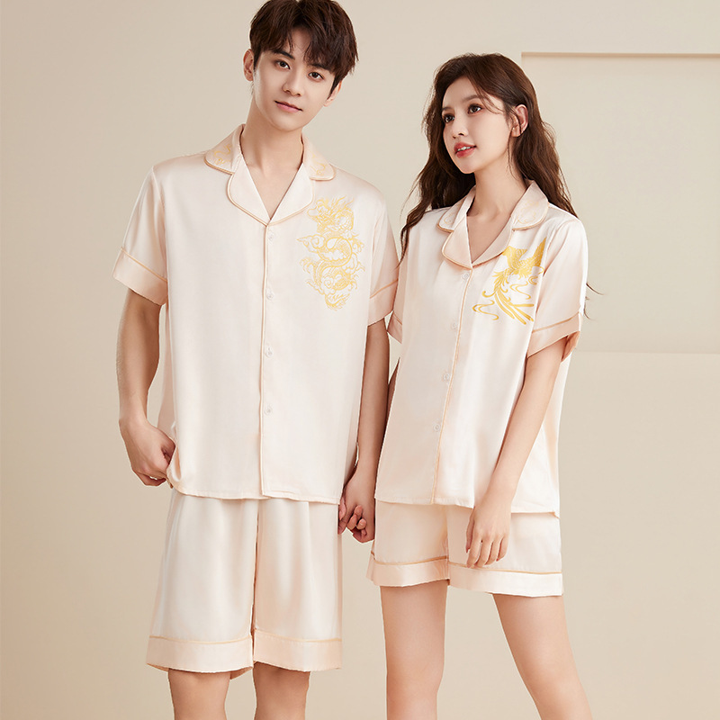커플 잠옷 레드 웨딩 여성의 봄과 여름 새틴 반팔 신년 가을 드래곤과 피닉스 홈 의류 세트