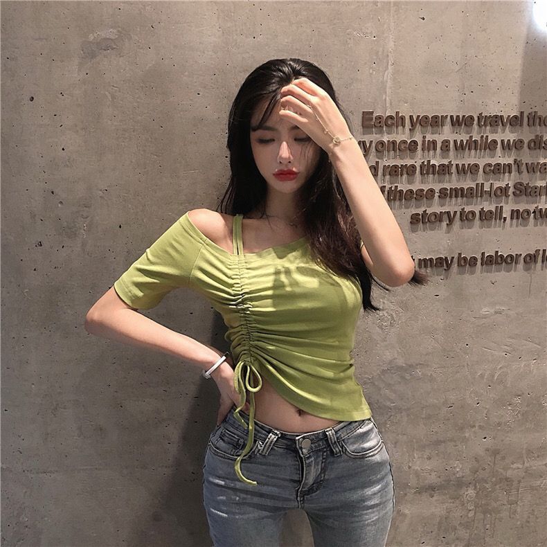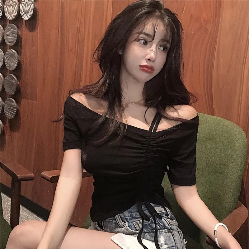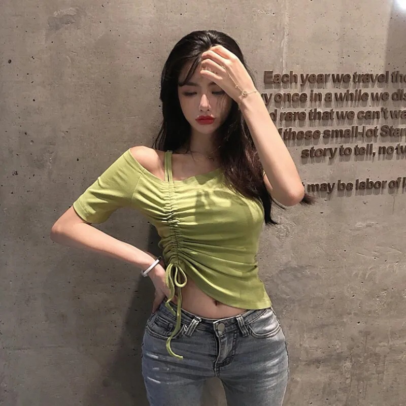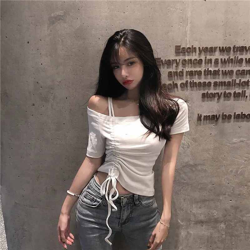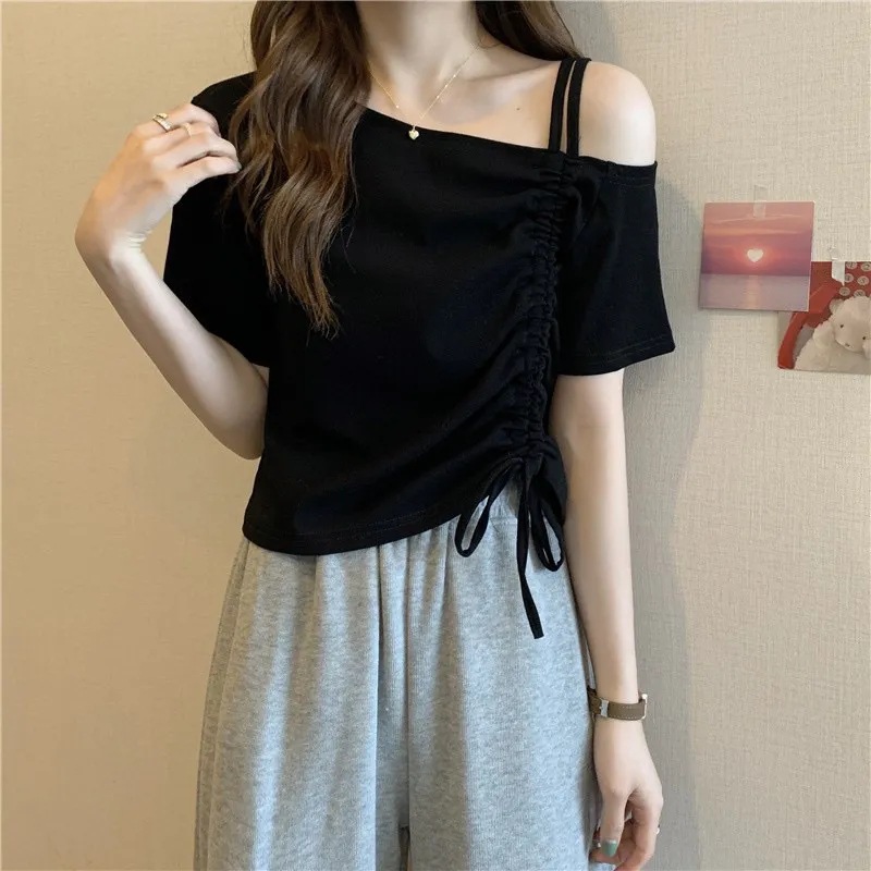 어깨에 노출 된 드로우 스트링 반팔 티셔츠 여성 여름 2024 새로운 세련된 스파이스 걸스 클래 버클 오프 숄더 탑 퓨어 쇼트스토어 가기