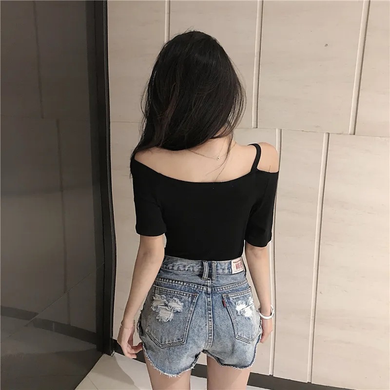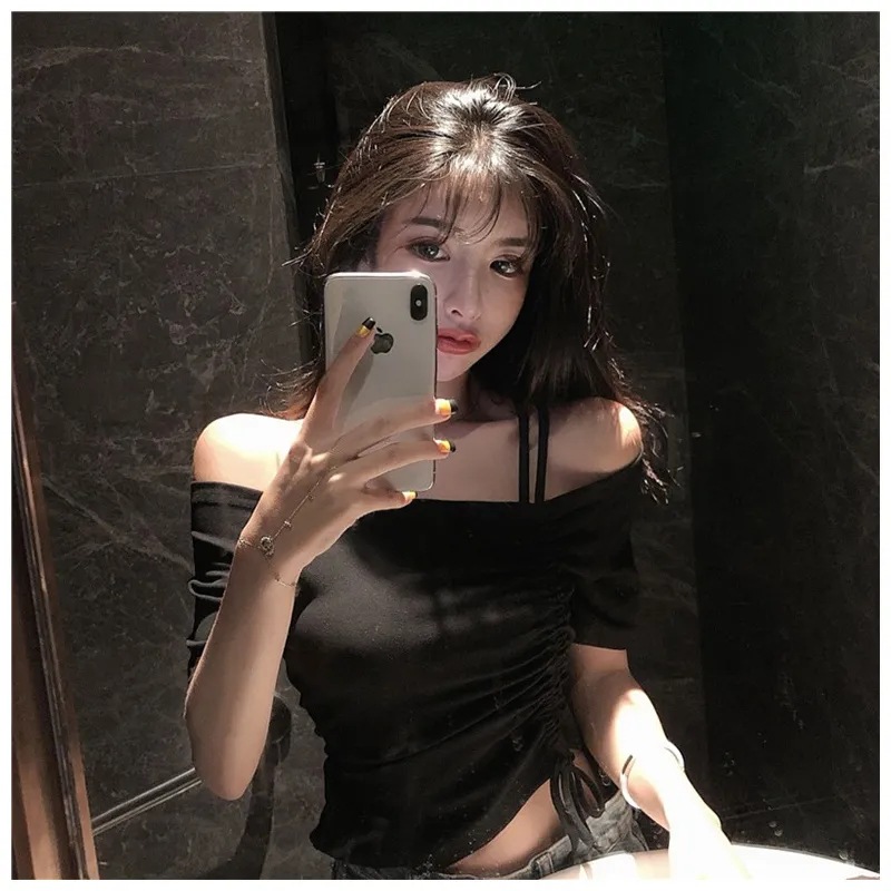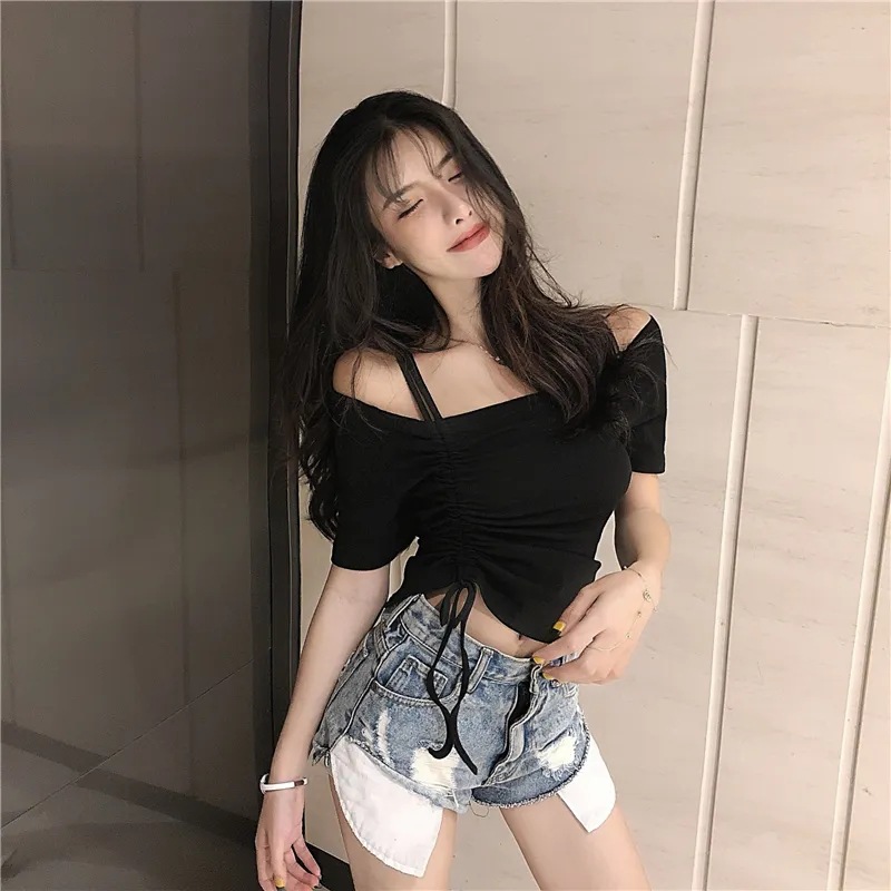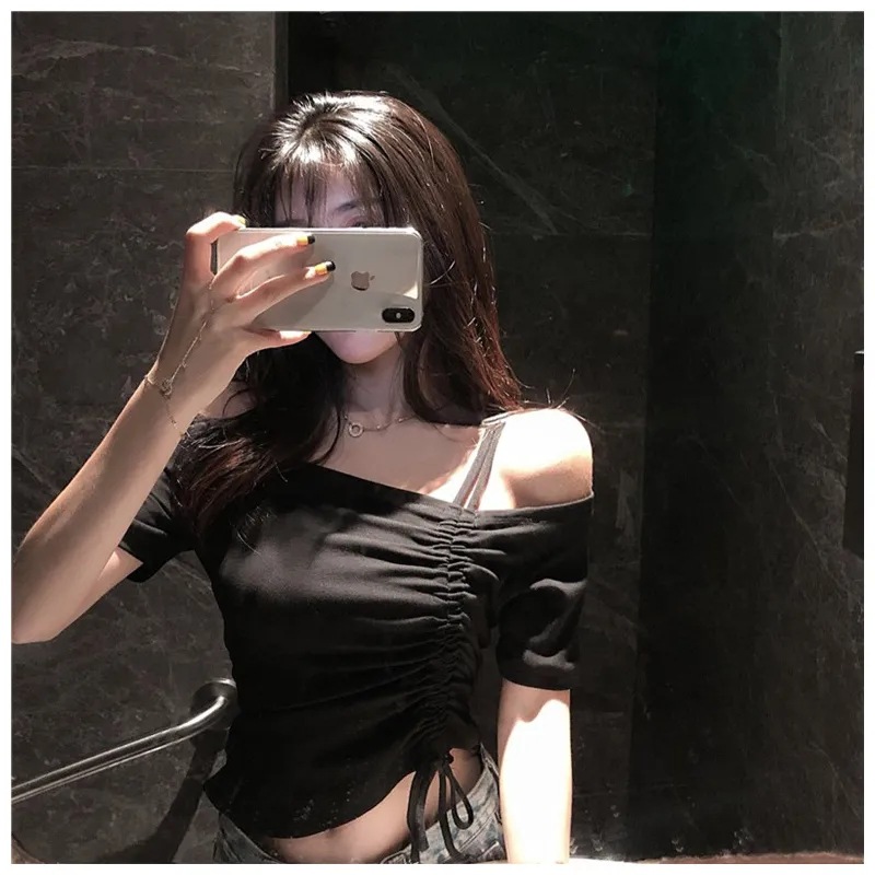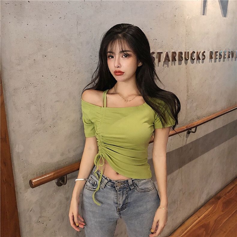 어깨에 노출 된 드로우 스트링 반팔 티셔츠 여성 여름 2024 새로운 세련된 스파이스 걸스 클래 버클 오프 숄더 탑 퓨어 쇼트스토어 가기