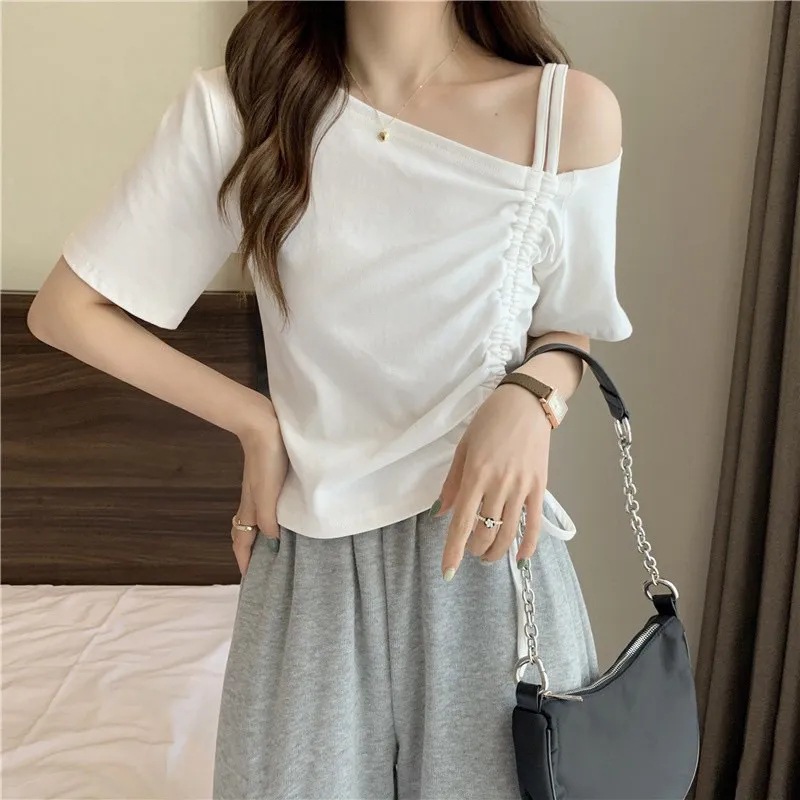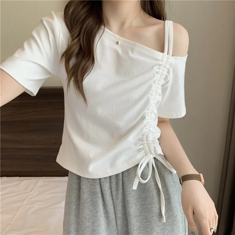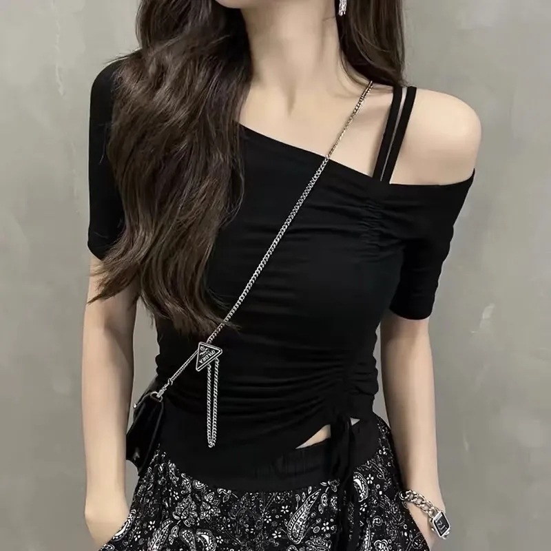 어깨에 노출 된 드로우 스트링 반팔 티셔츠 여성 여름 2024 새로운 세련된 스파이스 걸스 클래 버클 오프 숄더 탑 퓨어 쇼트