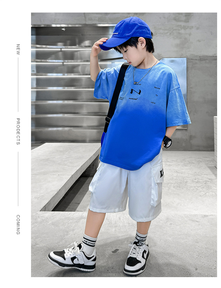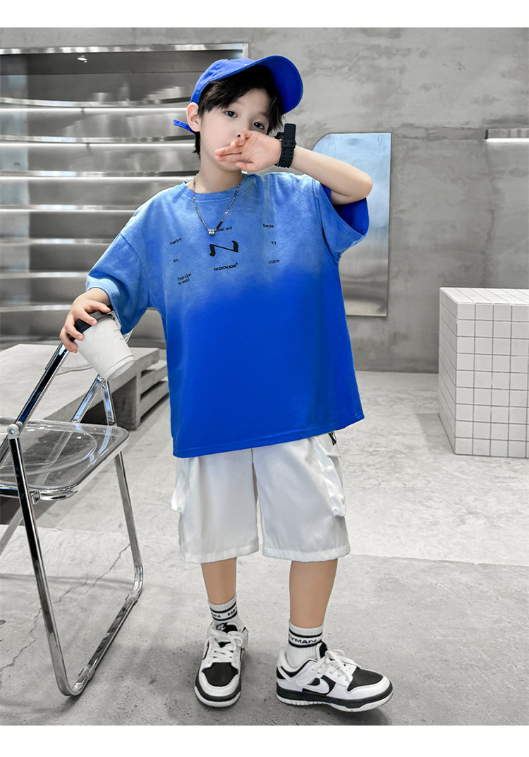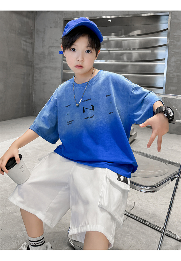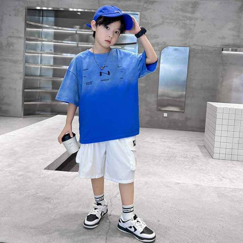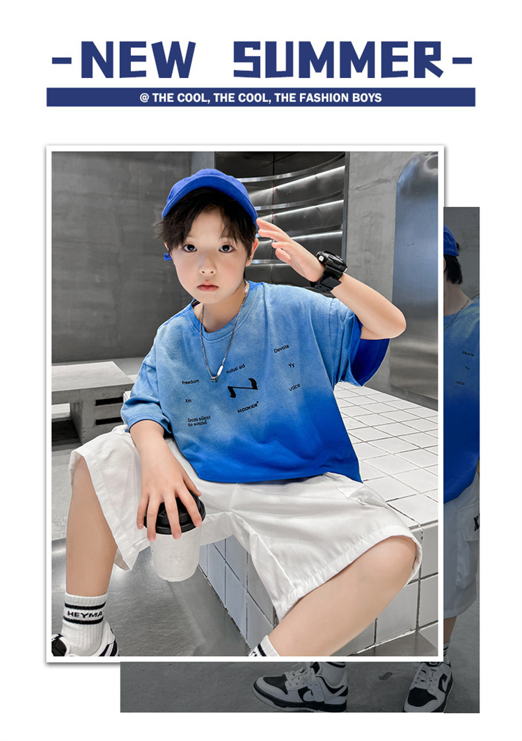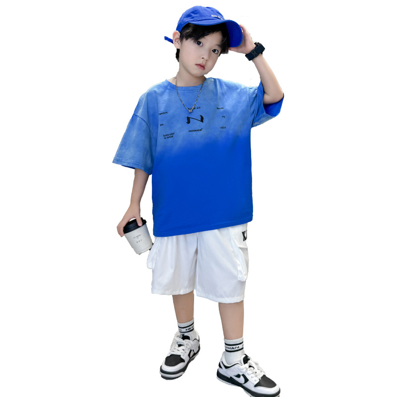 남학생 여름 세트 2024 새로운 어린이 서양식 스포츠 레저 걸이 염색 편지 반팔 티셔츠 투피스 세트 8 트렌디스토어 가기