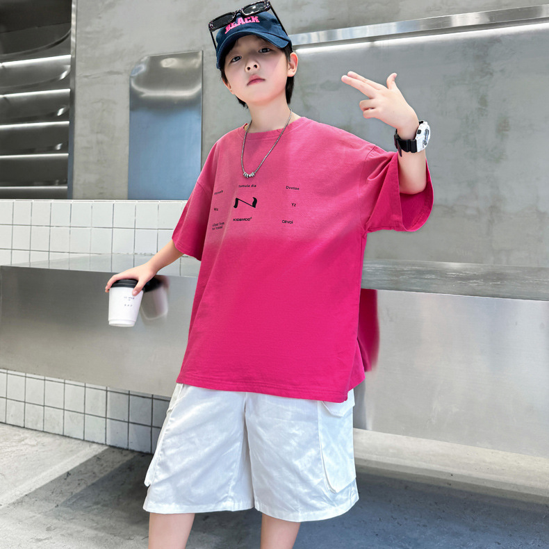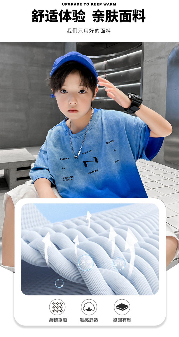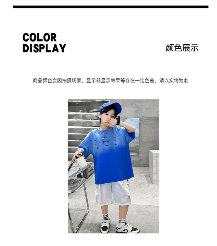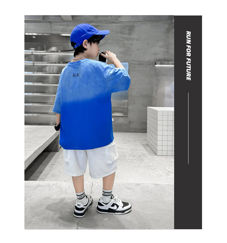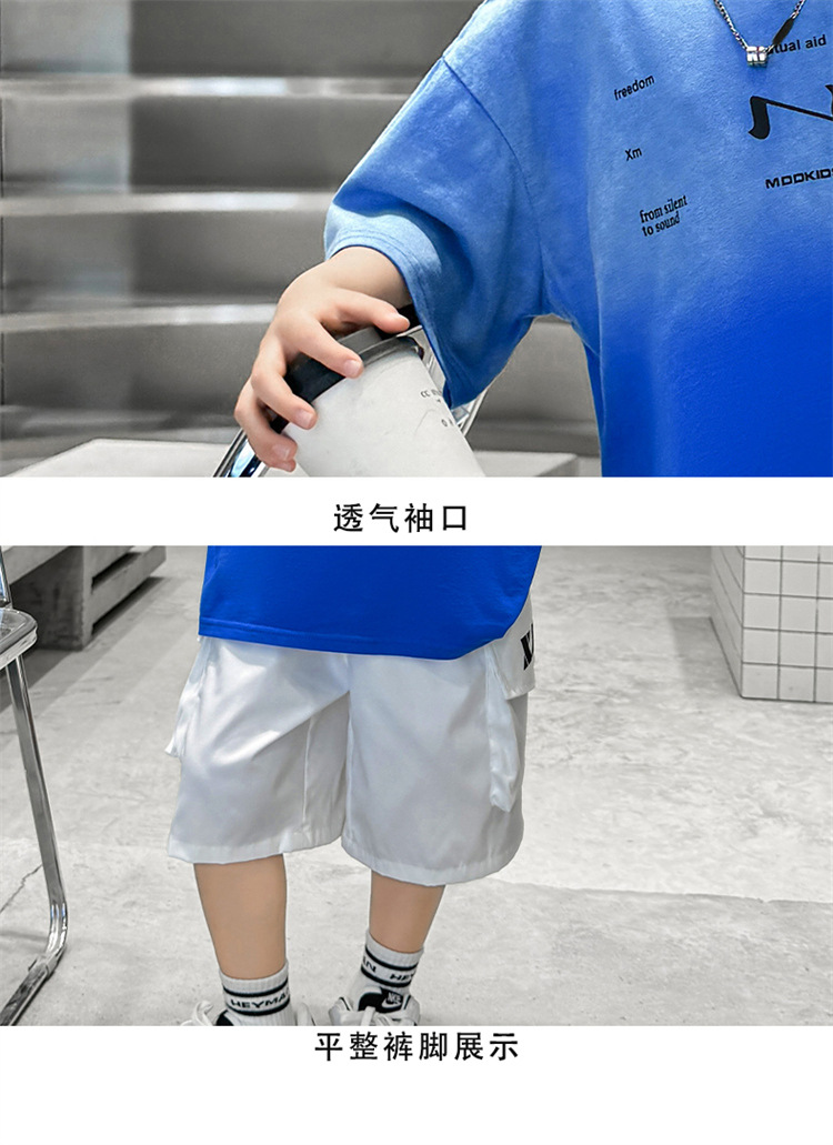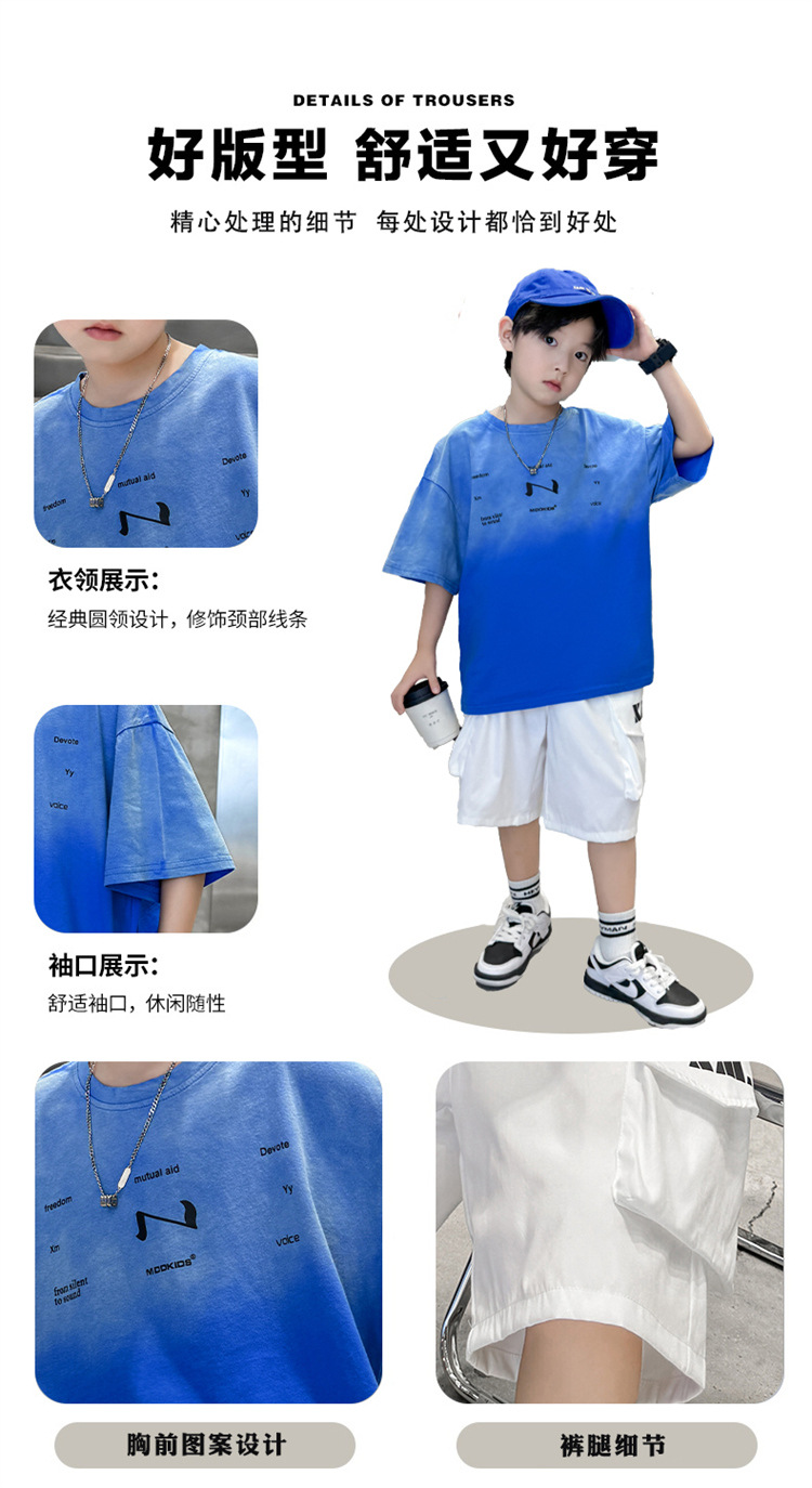남학생 여름 세트 2024 새로운 어린이 서양식 스포츠 레저 걸이 염색 편지 반팔 티셔츠 투피스 세트 8 트렌디스토어 가기