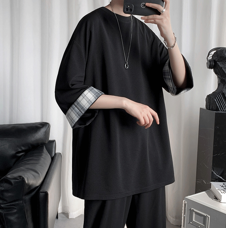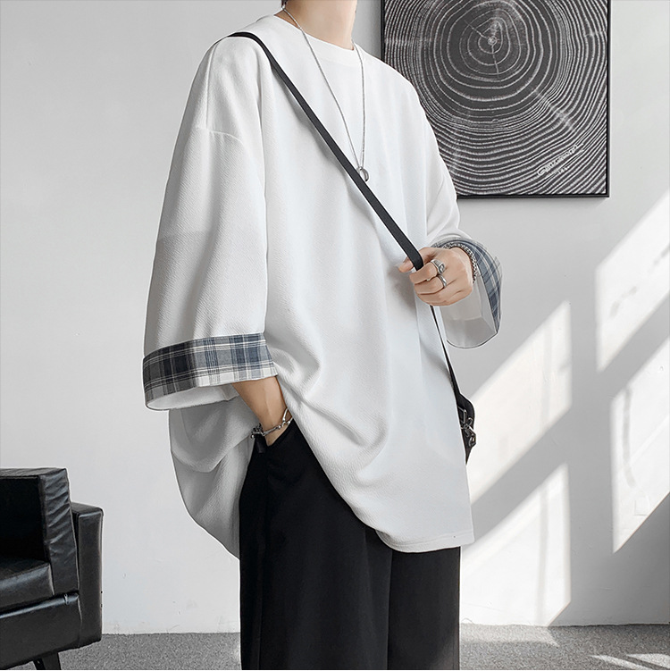 트렌디 한 브랜드 7-소매 티셔츠 남자의 여름 격자 무늬 바느질 디자인 센스 작은 주변 짧은 소매 트렌디 올매치 7-소매 티셔츠