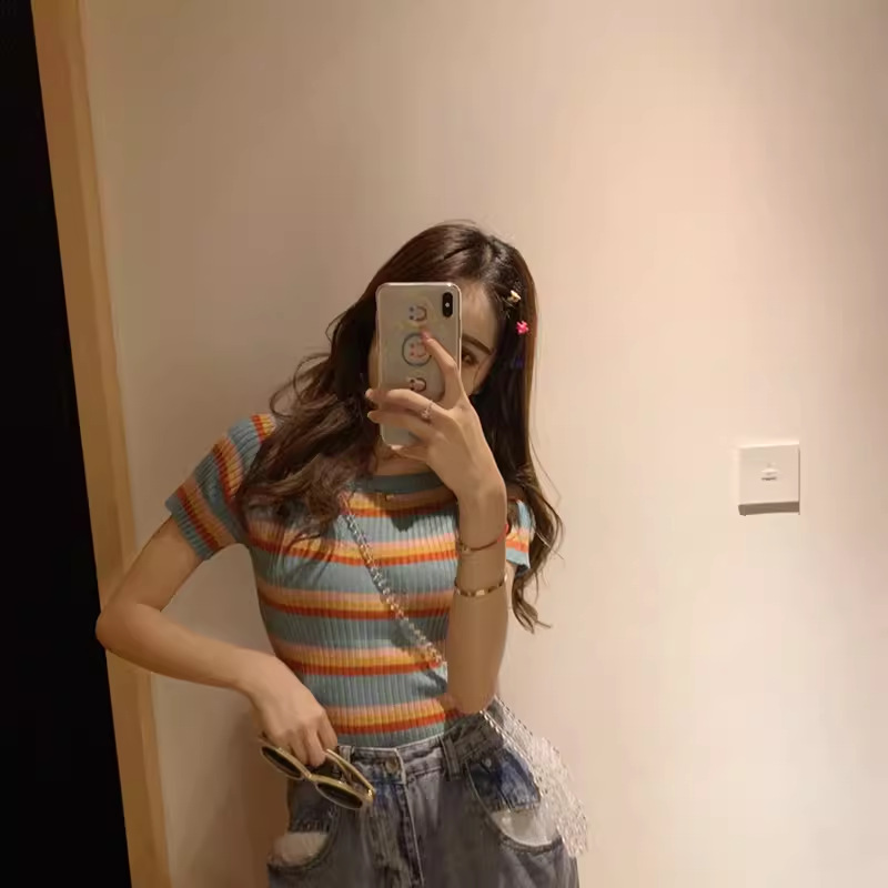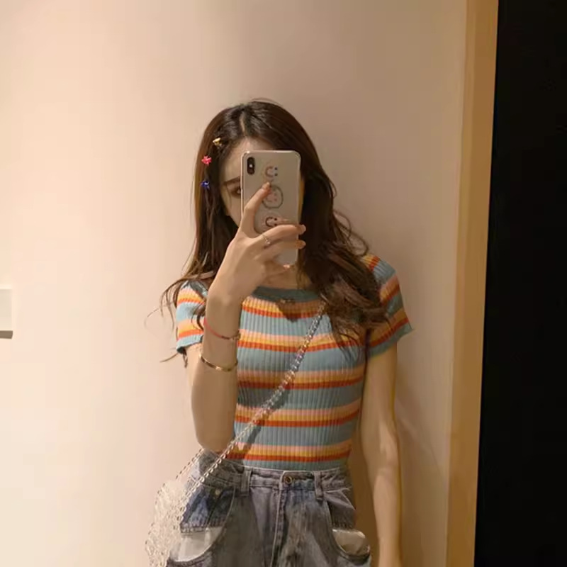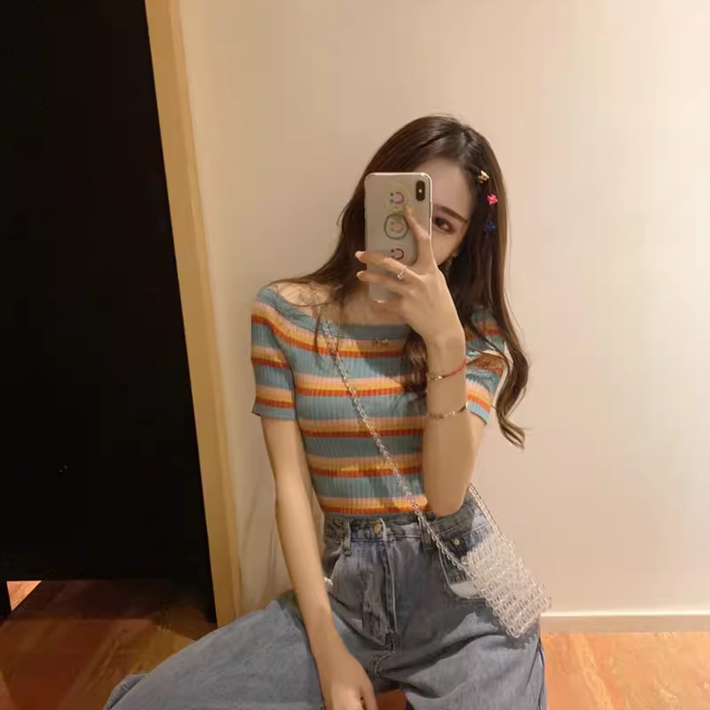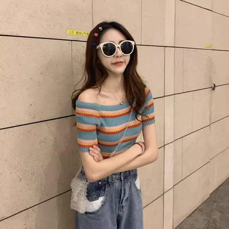 레인보우 스트라이프 아이스 실크 티셔츠 여성용 2026 여름 신상 니트 반팔 원라인 네크라인 오프숄더 섹시하고 다재다능한 탑스토어 가기