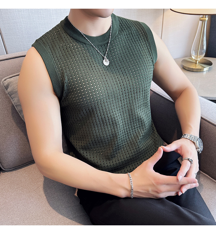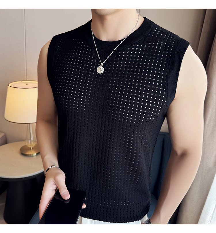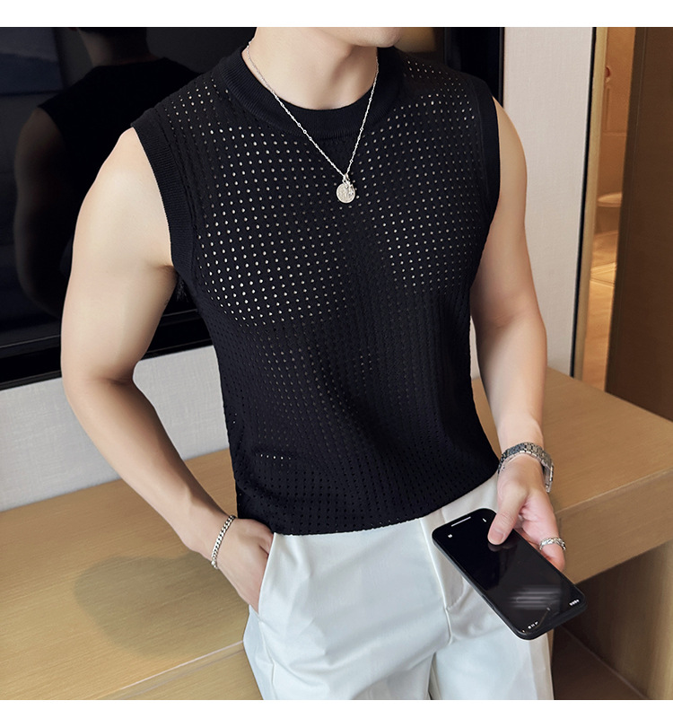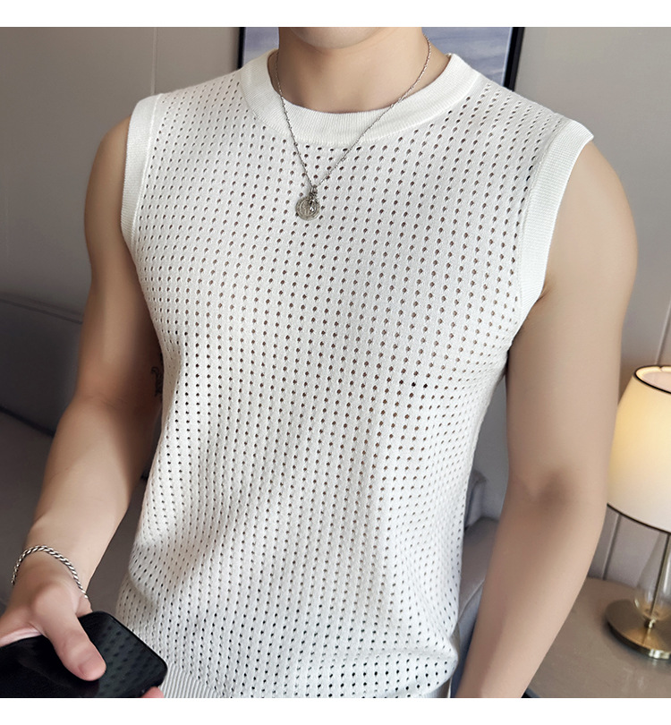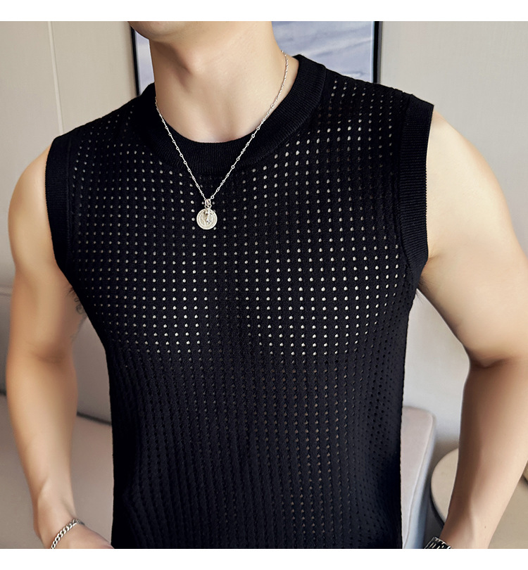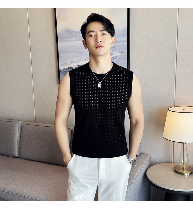 여름 새로운 남성 속이 빈 조끼 한국 민소매 둥근 목 티셔츠 시원한 통기성 고급 메쉬 탄성 티