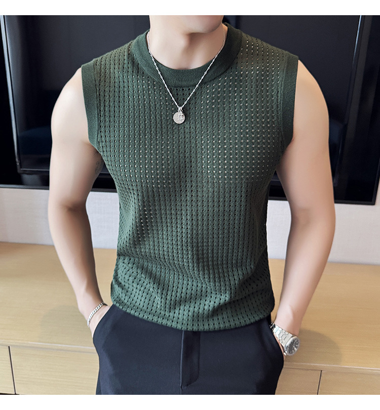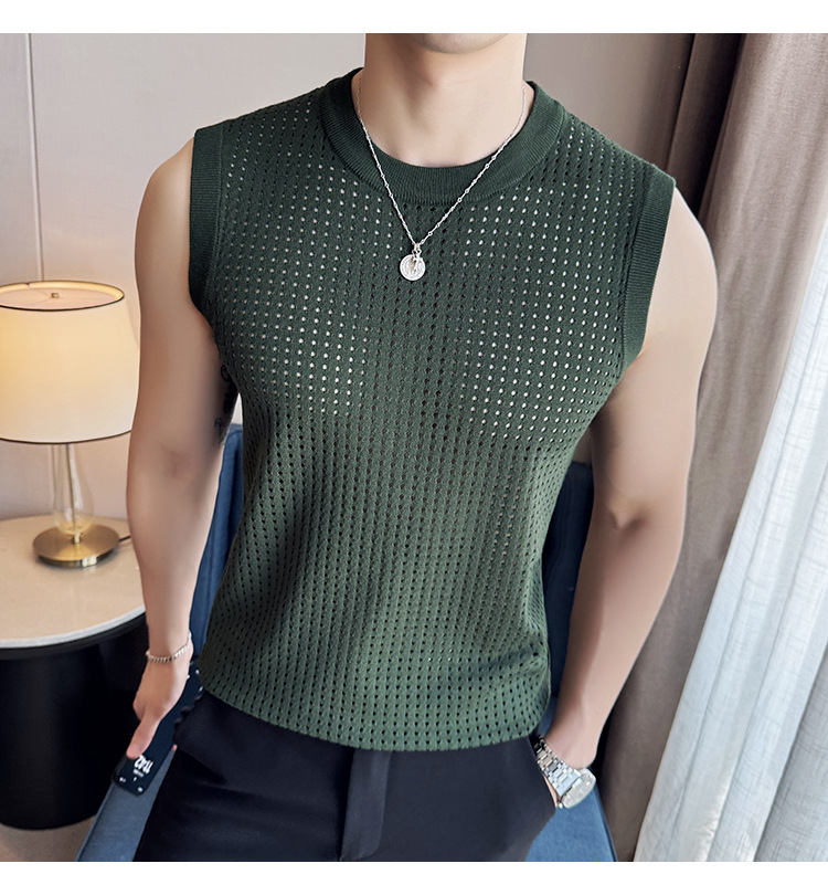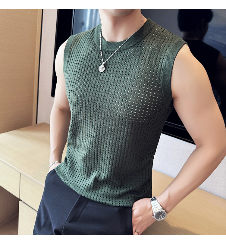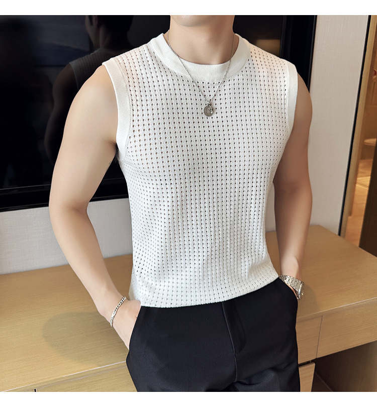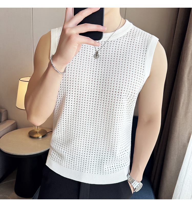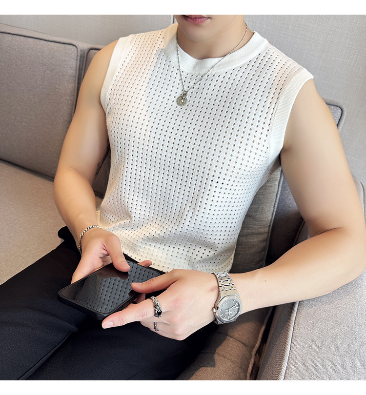 여름 새로운 남성 속이 빈 조끼 한국 민소매 둥근 목 티셔츠 시원한 통기성 고급 메쉬 탄성 티