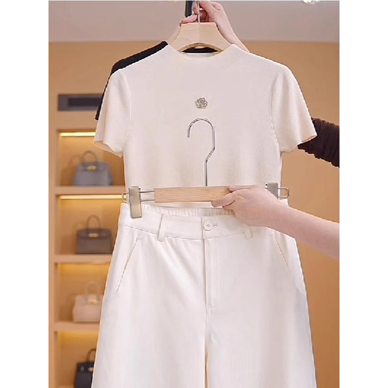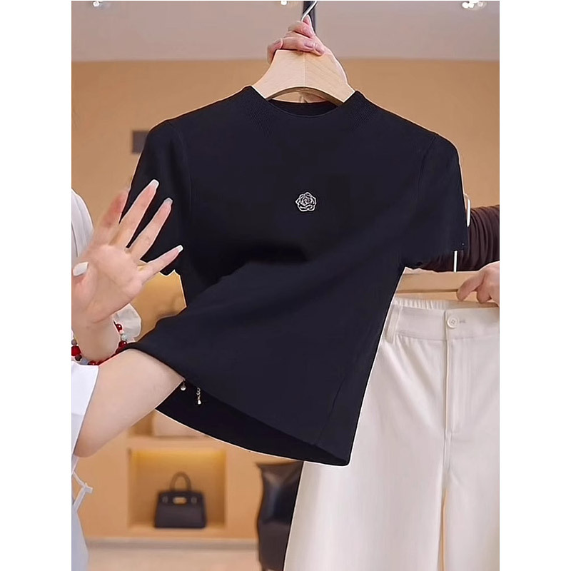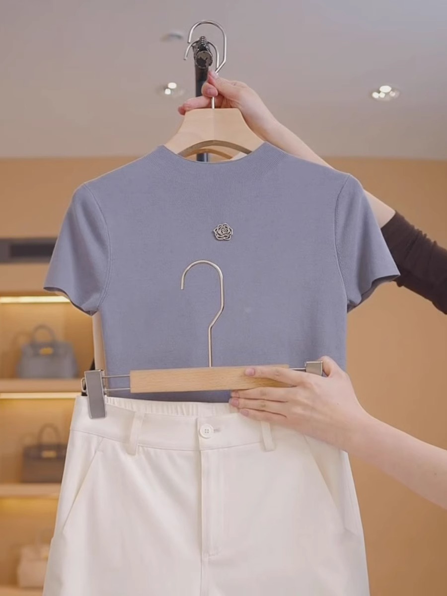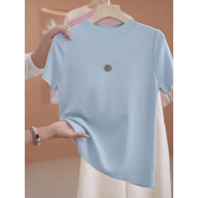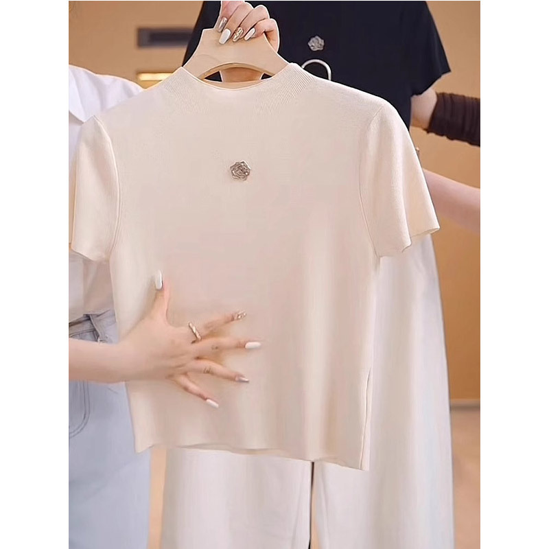 카멜리아 얇은 반팔 티셔츠 여성용 2026년 신상 여름 스타일 다용도 슬리밍 프렌치 아이스 실크 니트 탑