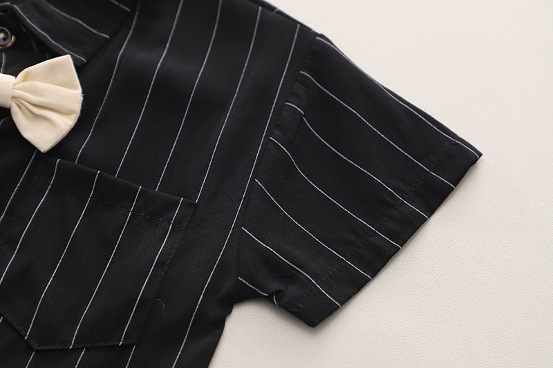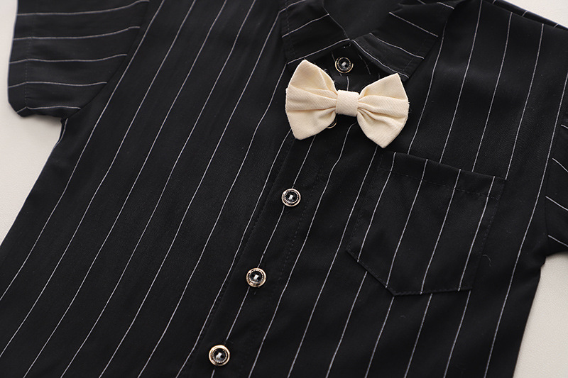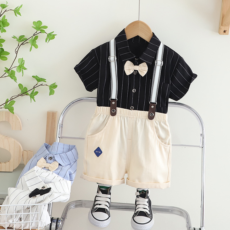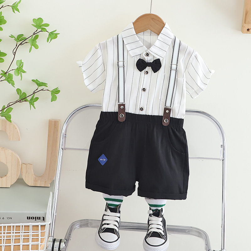 어린이 착용 여름 새 소년 스트랩 바지 넥타이 셔츠 반팔 세트 캐주얼 어깨 스트랩 바지 투피스 세트