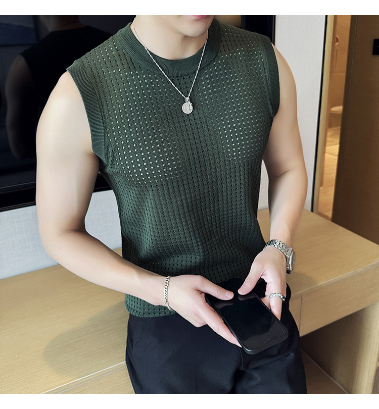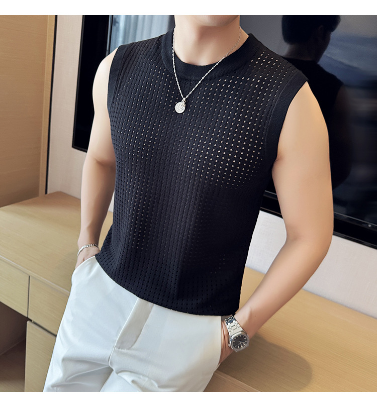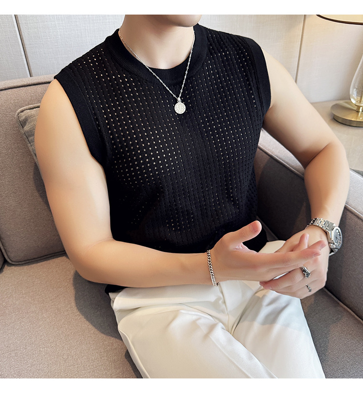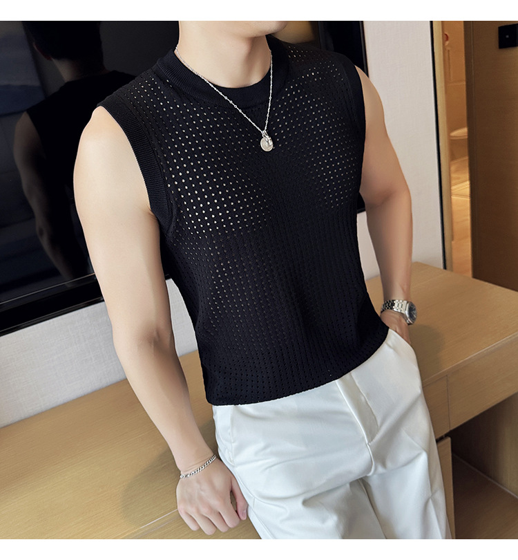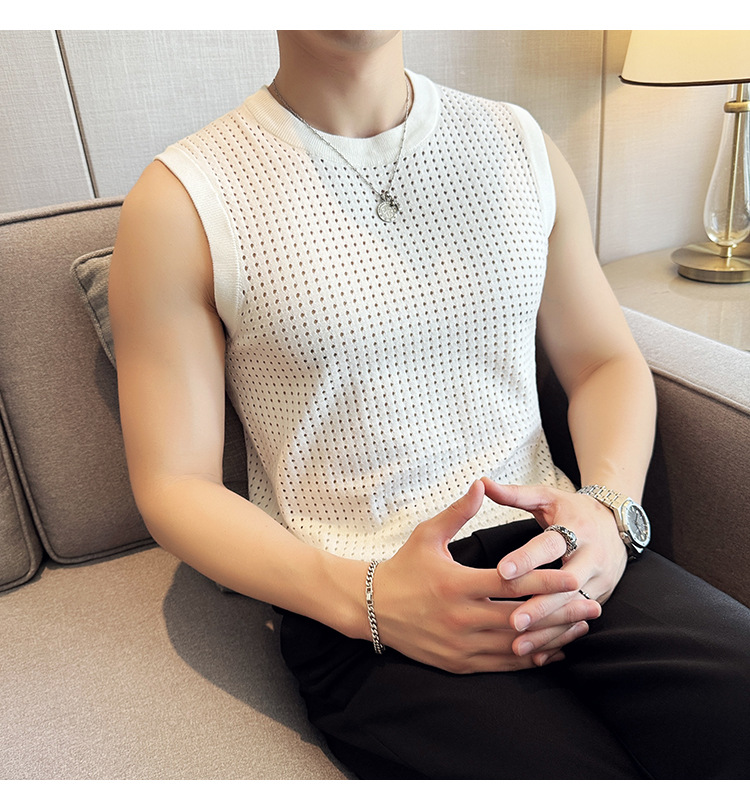 국경 간 대외 무역 스타일 남자의 고급 센스 메쉬 할로우 니트 조끼 남자 슬림 핏 탄성 민소매 스포츠 티셔츠 남자스토어 가기