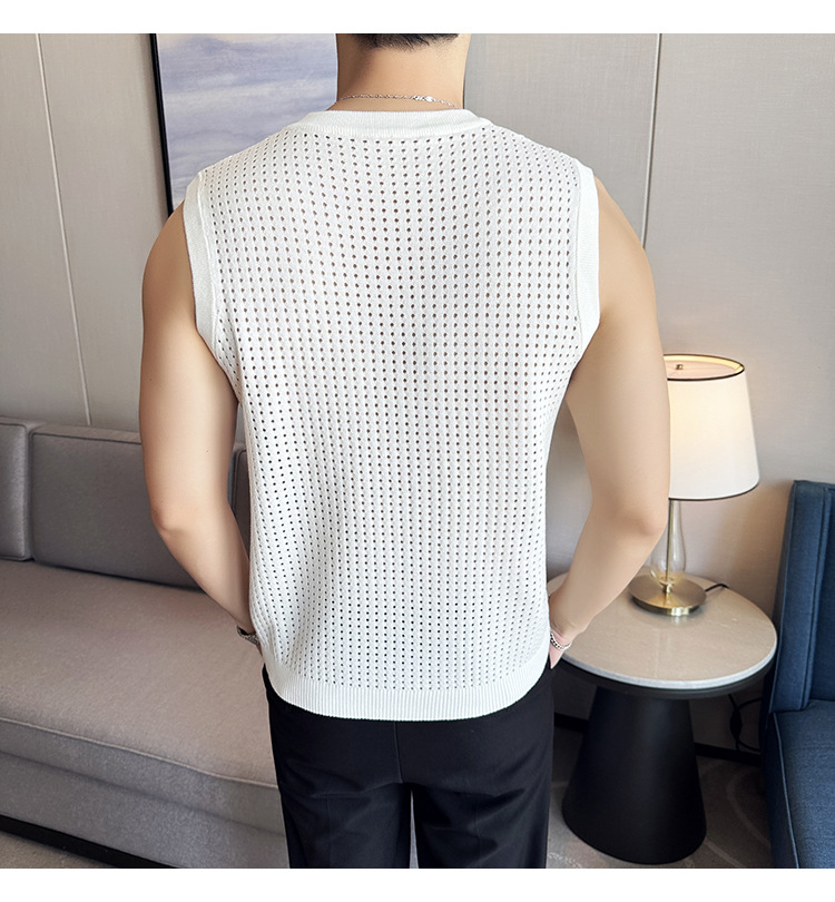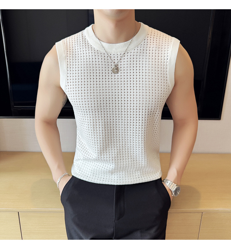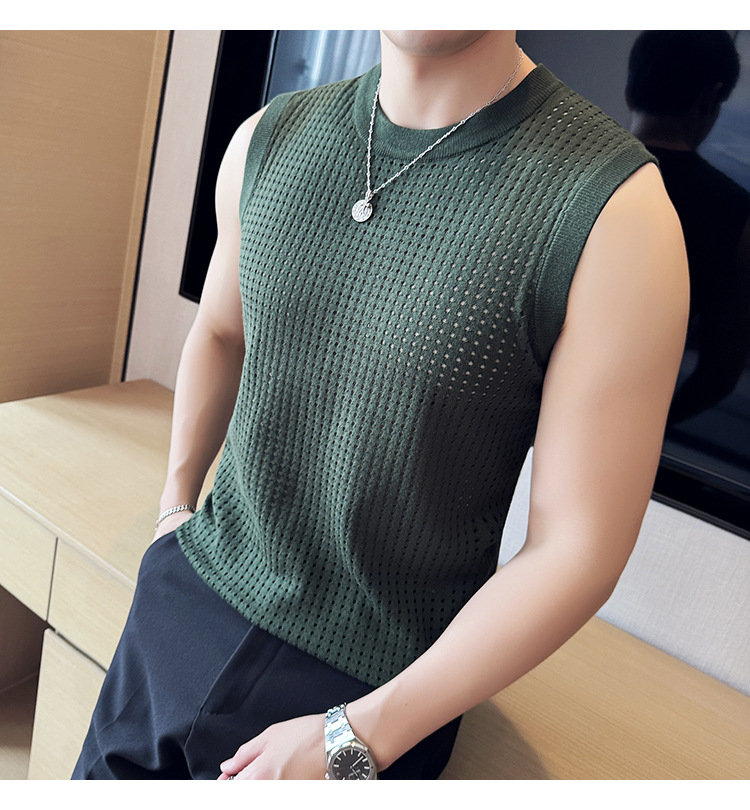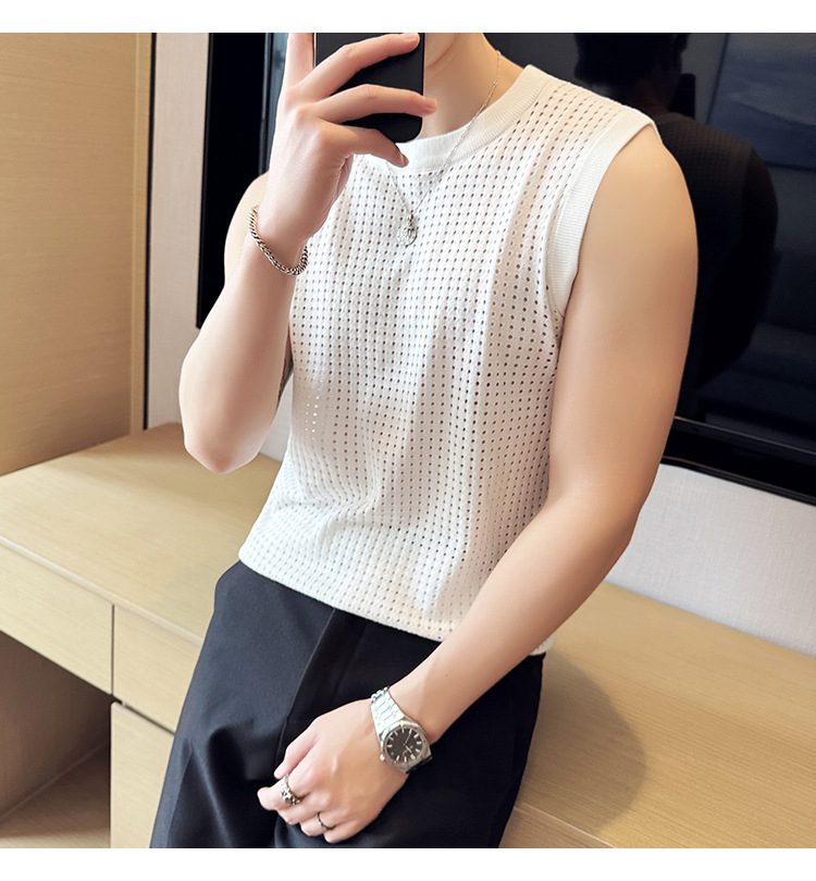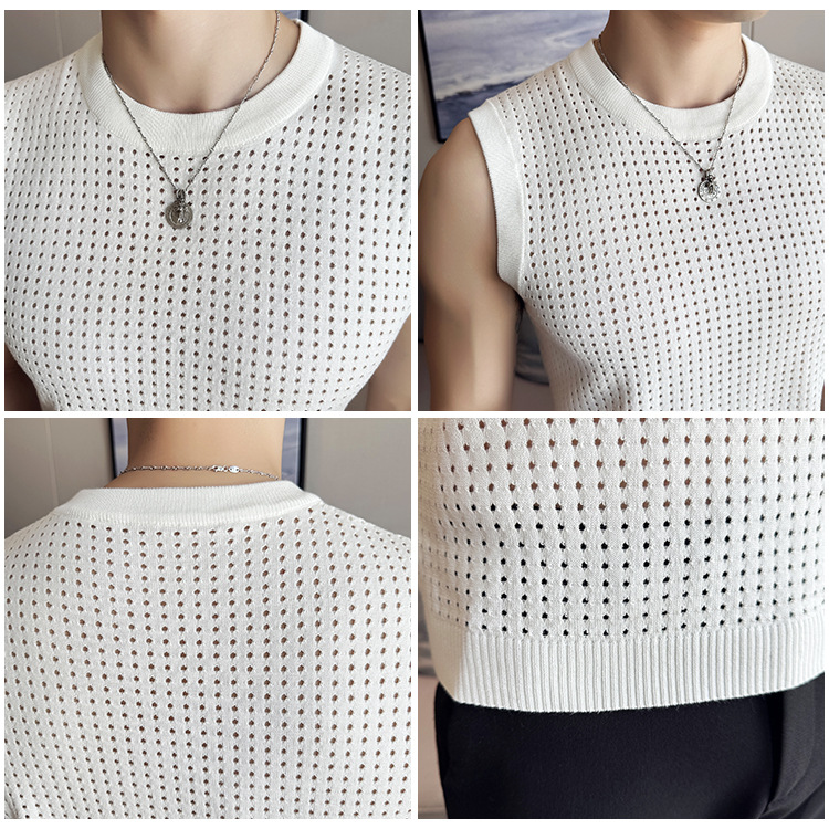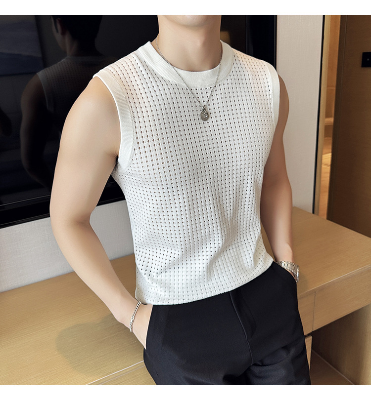 국경 간 대외 무역 스타일 남자의 고급 센스 메쉬 할로우 니트 조끼 남자 슬림 핏 탄성 민소매 스포츠 티셔츠 남자스토어 가기