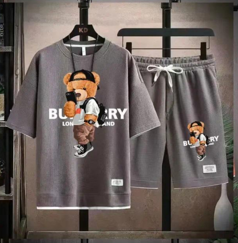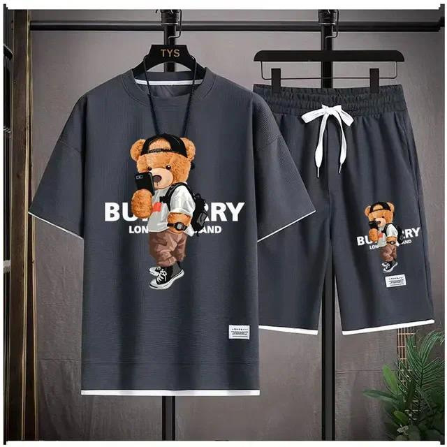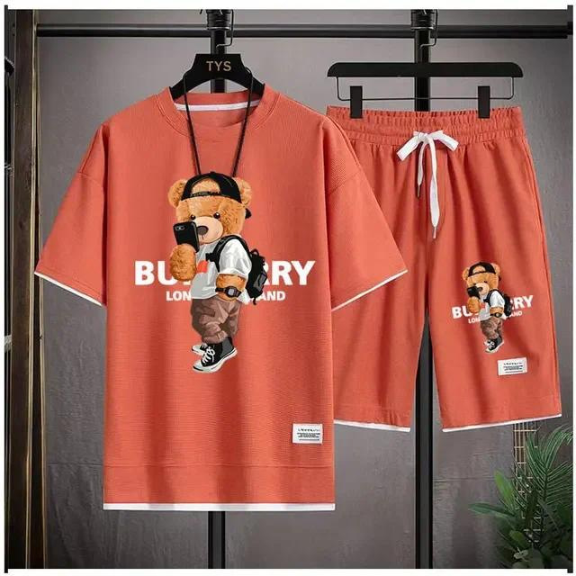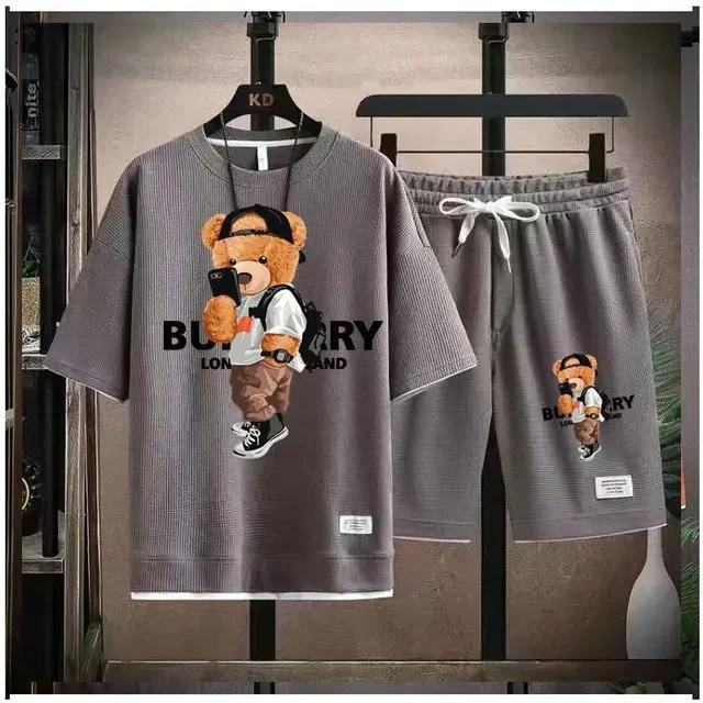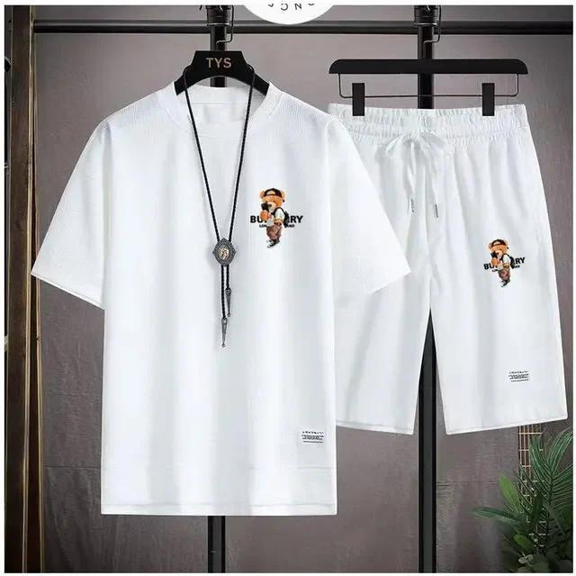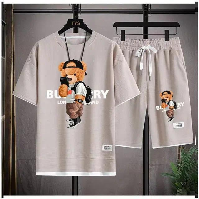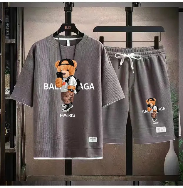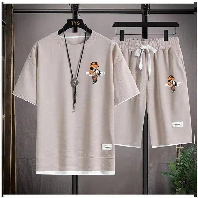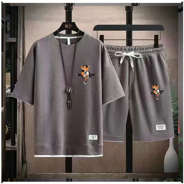 Waffe 반팔 티셔츠 남성 캐주얼 스포츠 세트 도매 여름 느슨한 가짜 투피스 반소매 티셔츠 투피스 세트