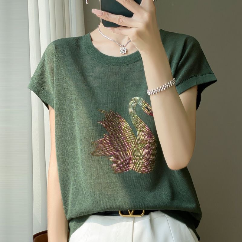쿨 슬럽 코튼 반팔 여성용 티셔츠 리틀 스완 핫 드릴링 아이스 실크 라운드 넥 베이스 여성 탑 어머니의 탑
