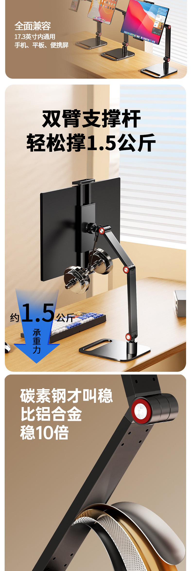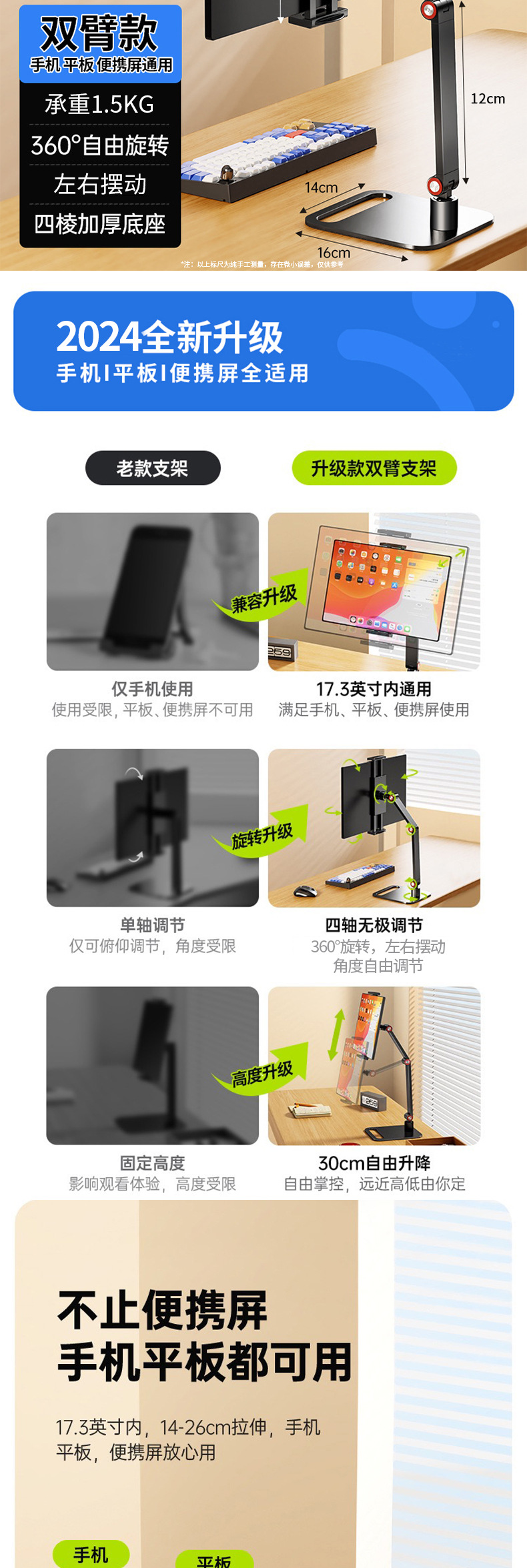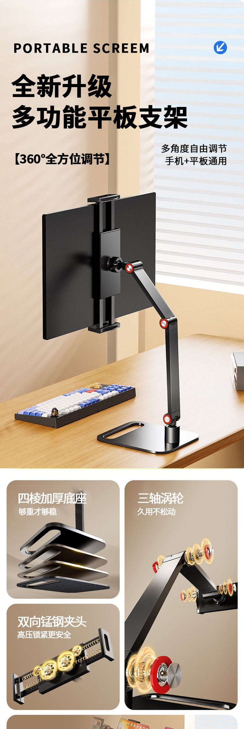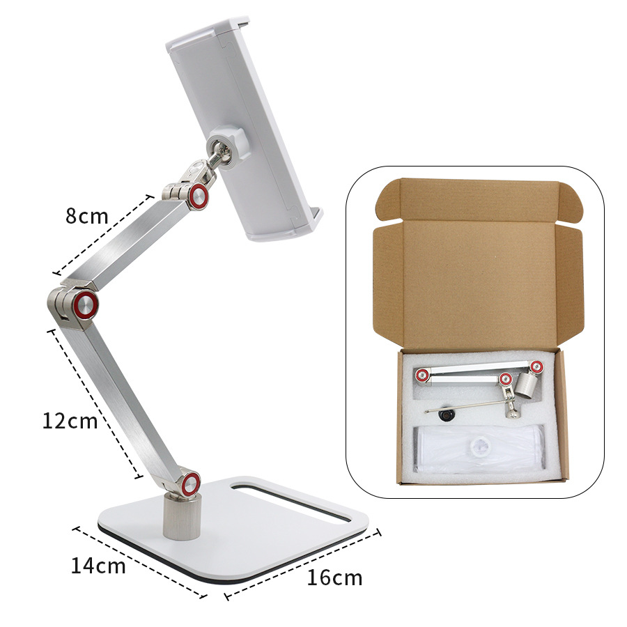 데스크탑 듀얼 암 태블릿 스탠드 360도 회전 알루미늄 합금 조절 가능 휴대용 스크린 확장 스탠드