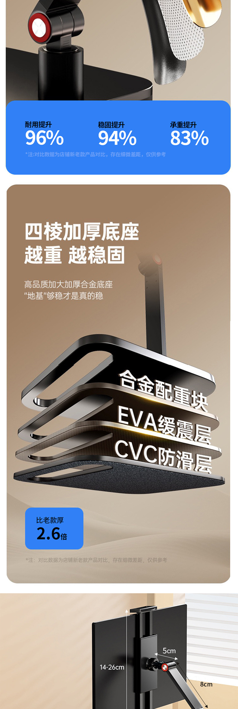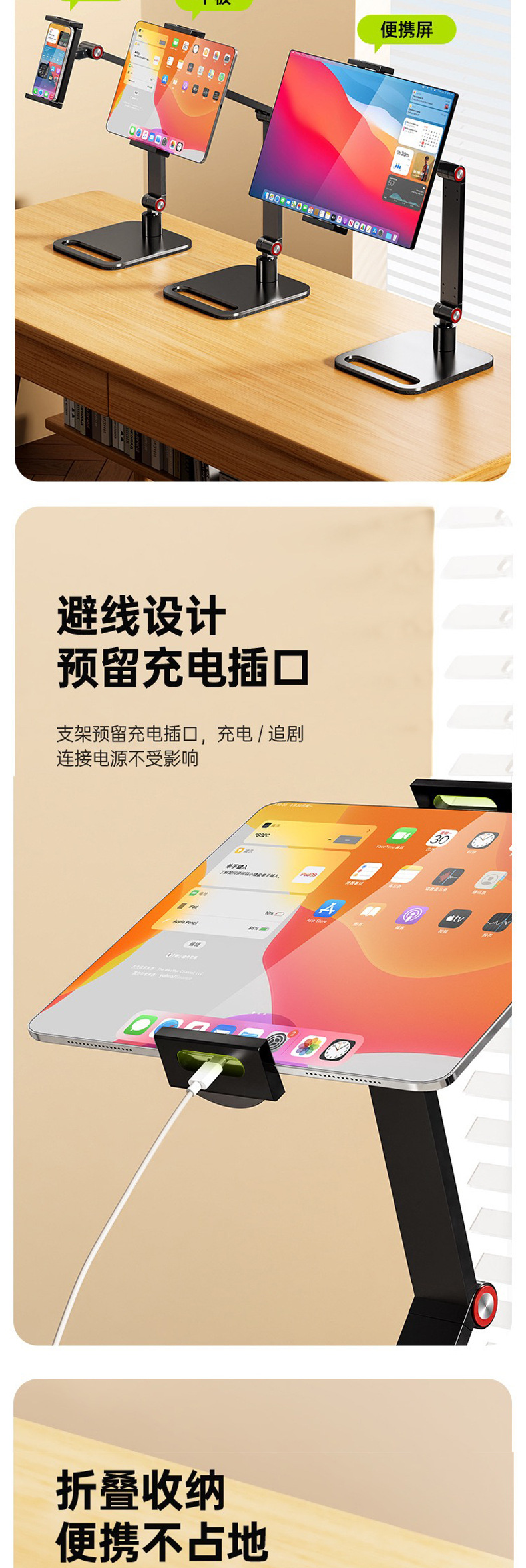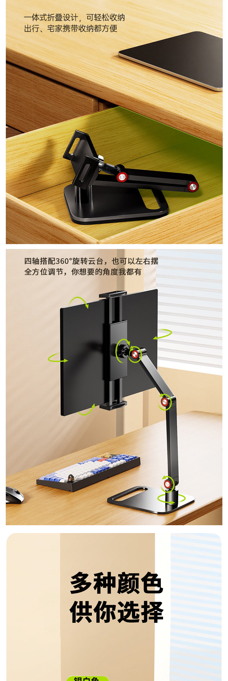 데스크탑 듀얼 암 태블릿 스탠드 360도 회전 알루미늄 합금 조절 가능 휴대용 스크린 확장 스탠드