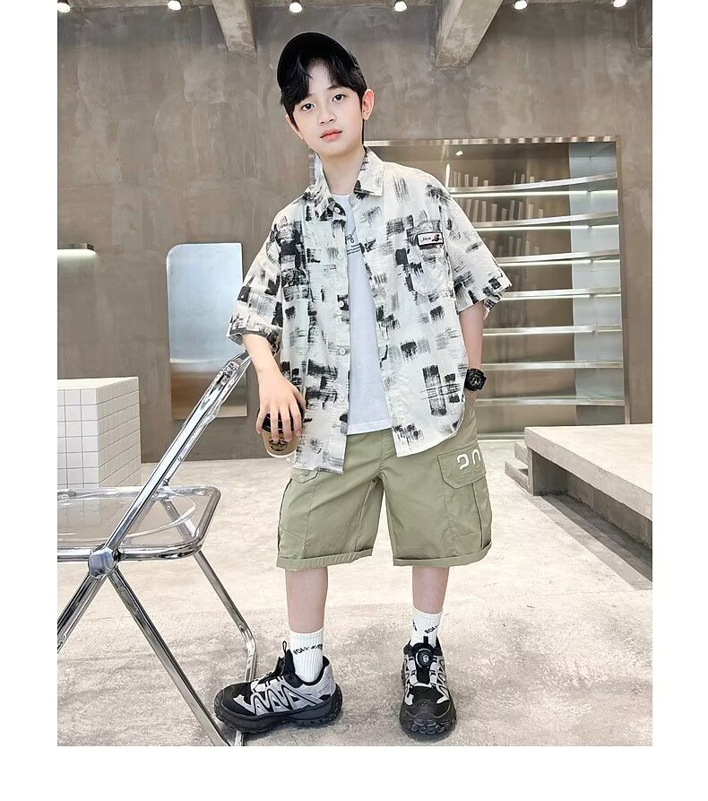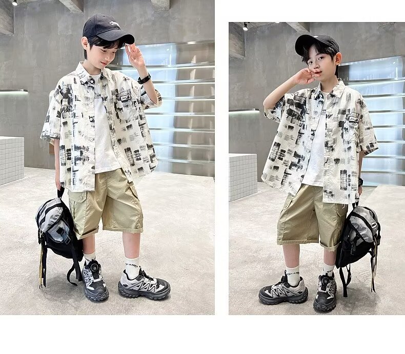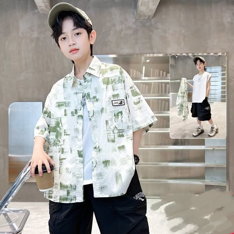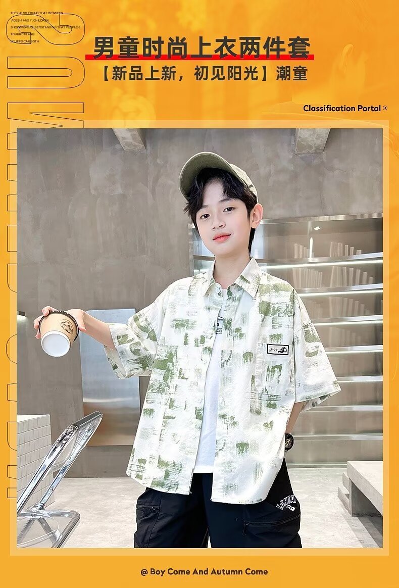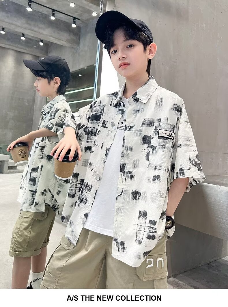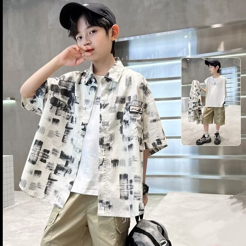 소년 여름 셔츠 시원한 느낌 2025 새로운 여름 중대형 어린이 소년 여름 반팔 셔츠 유행상의스토어 가기