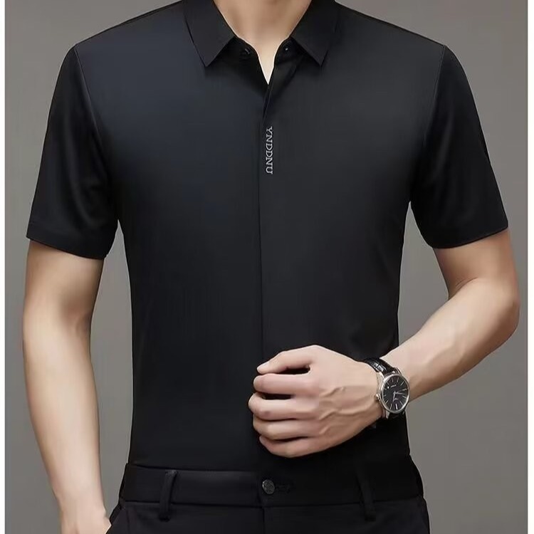 봄과 여름 남성 긴팔 셔츠 주름 방지 및 비 다림질 전문 원피스 패션 비즈니스 하이 엔드 아이스 실크 셔츠 블랙 셔츠