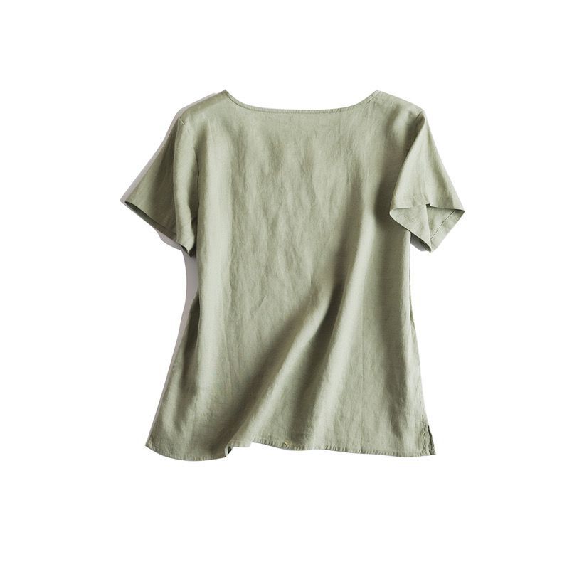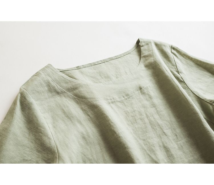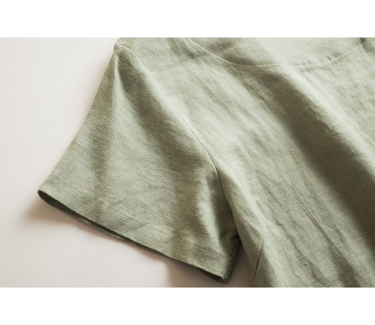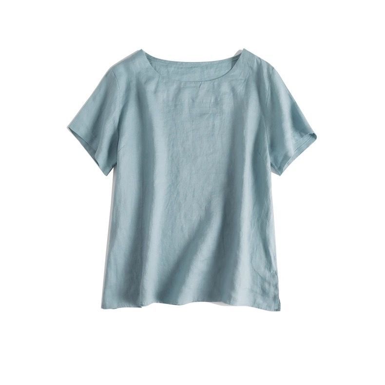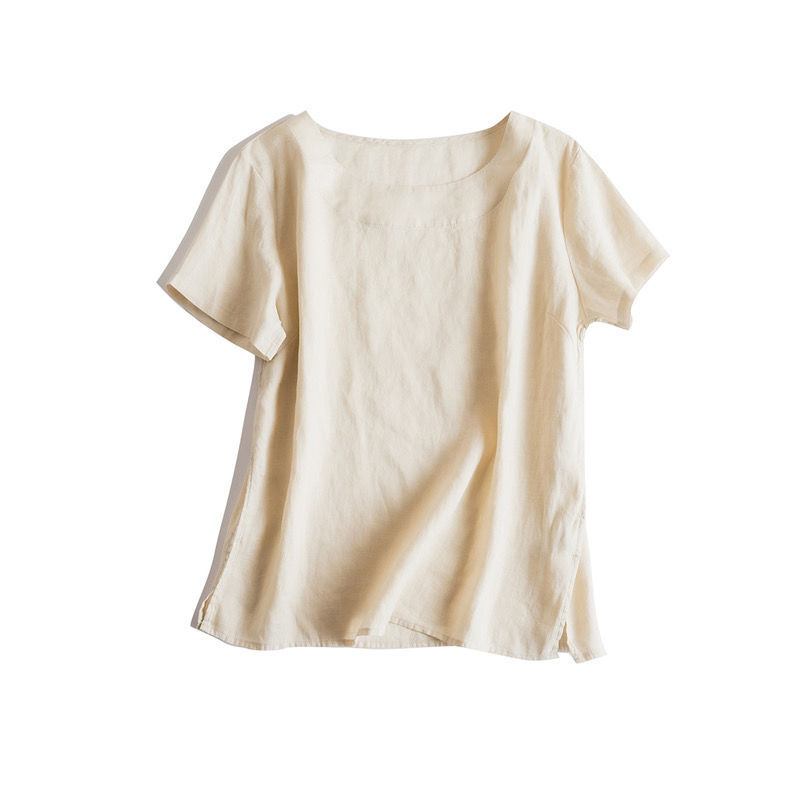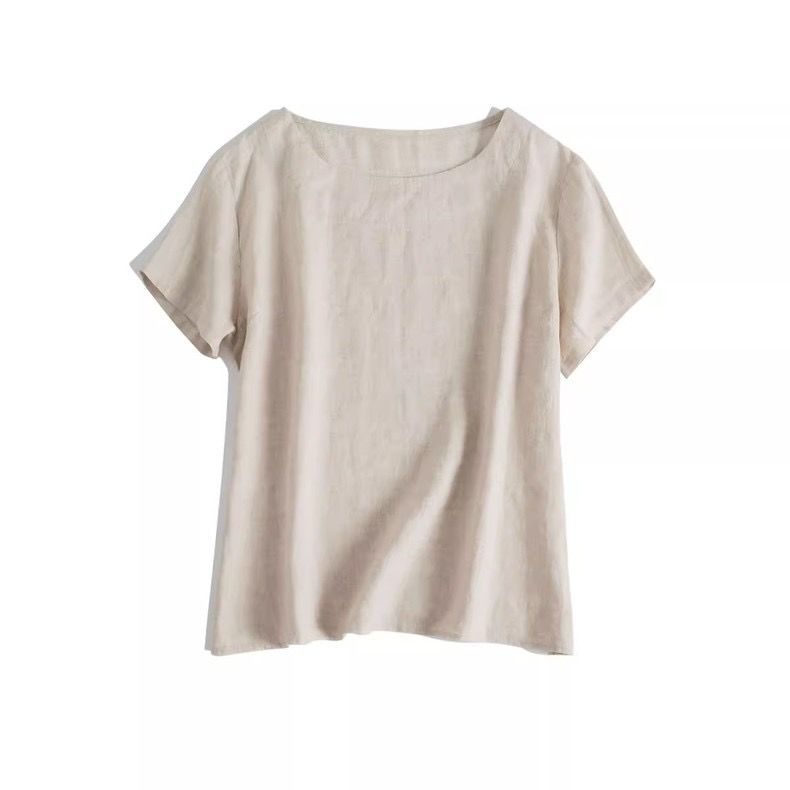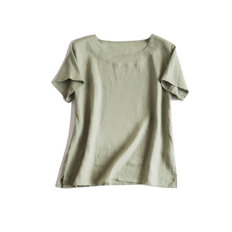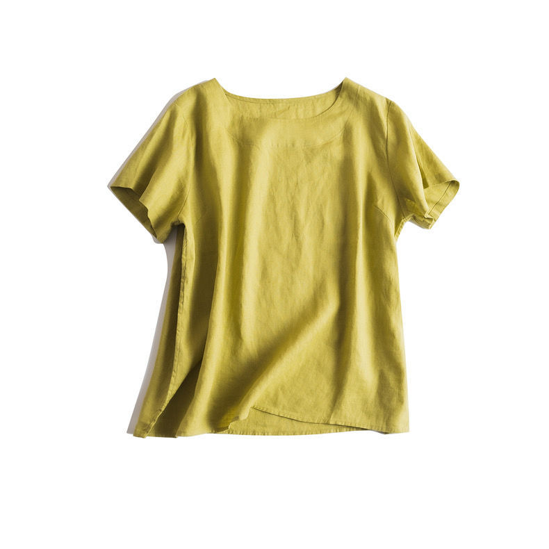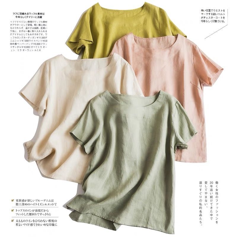 일본 통근 단순 17 × 21 미세 순수 리넨 예술적 기질 얇은 둥근 목 반팔 티셔츠 셔츠 탑스토어 가기