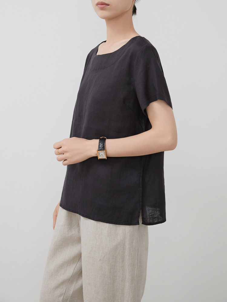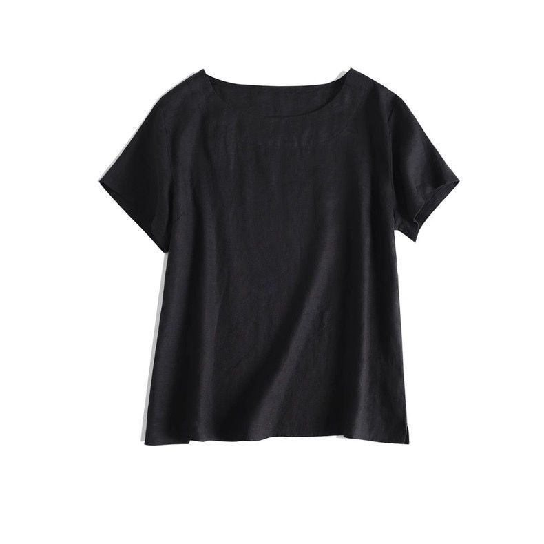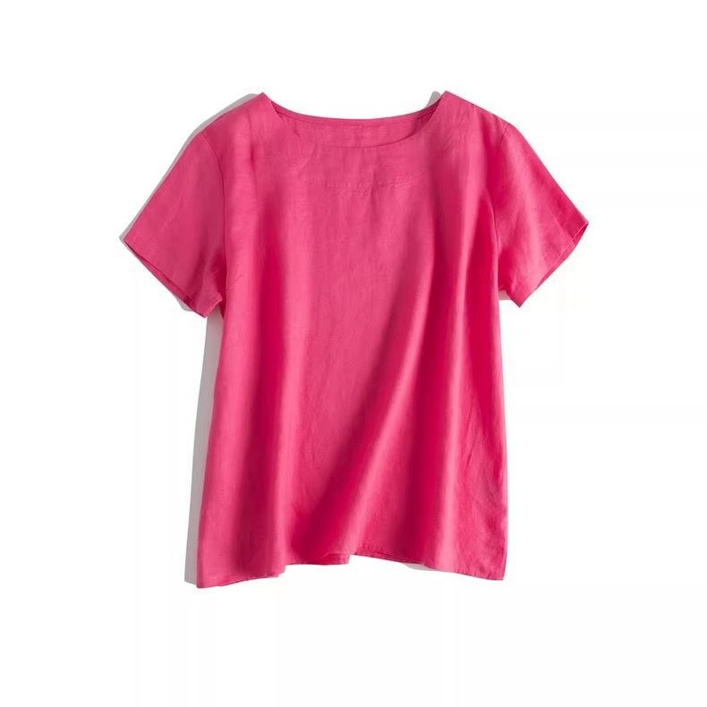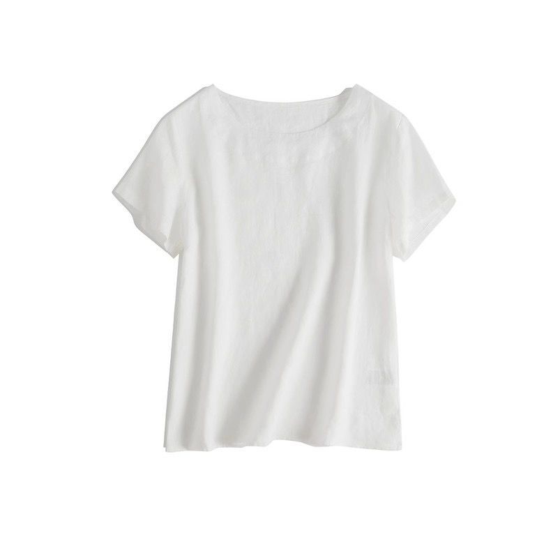 일본 통근 단순 17 × 21 미세 순수 리넨 예술적 기질 얇은 둥근 목 반팔 티셔츠 셔츠 탑