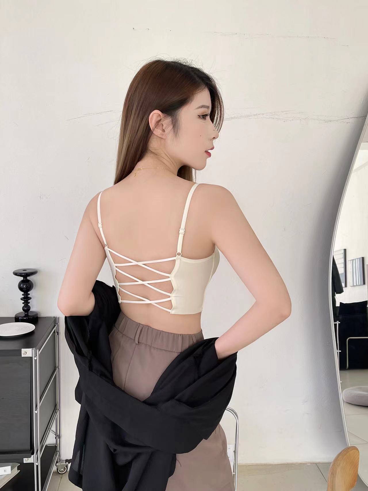 TikTok New Women's 82423 # French Satin Fixed Cup Hollow-out 원피스 Beautiful Back Women's Summer All-match Short Bra스토어 가기