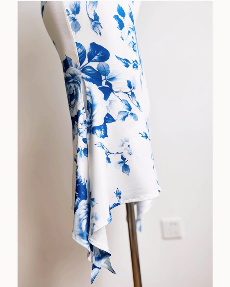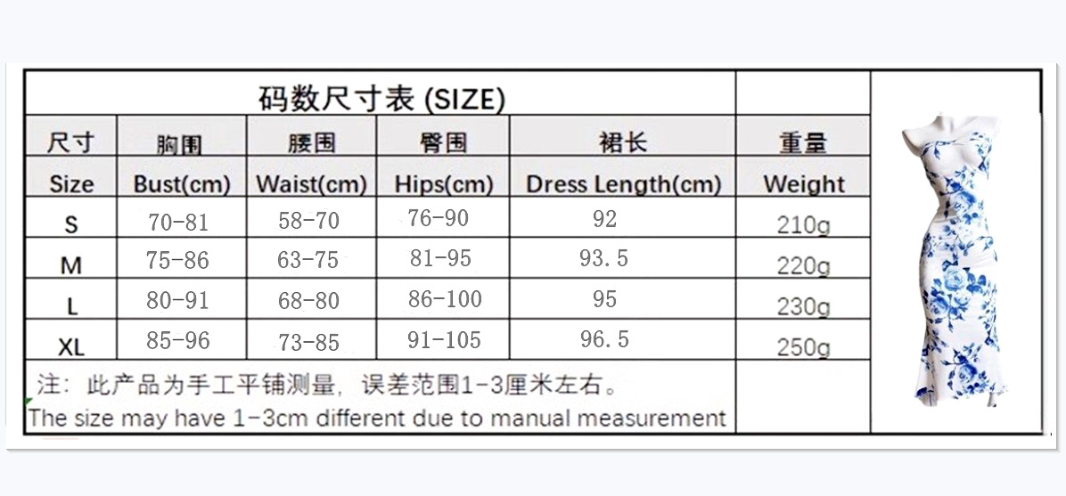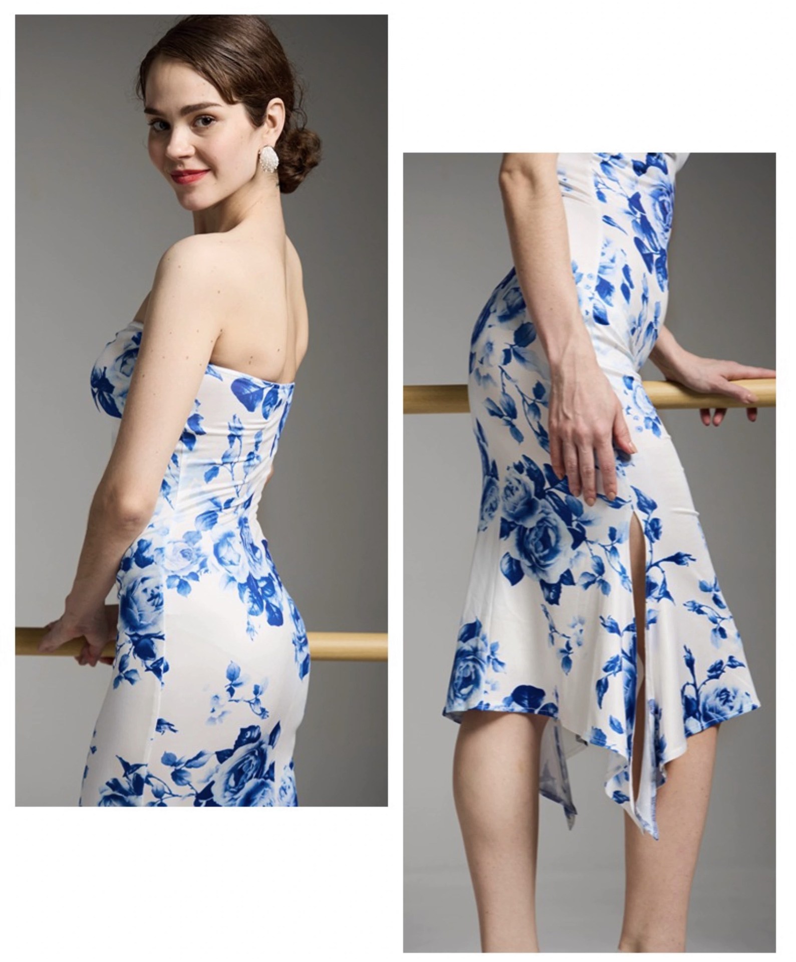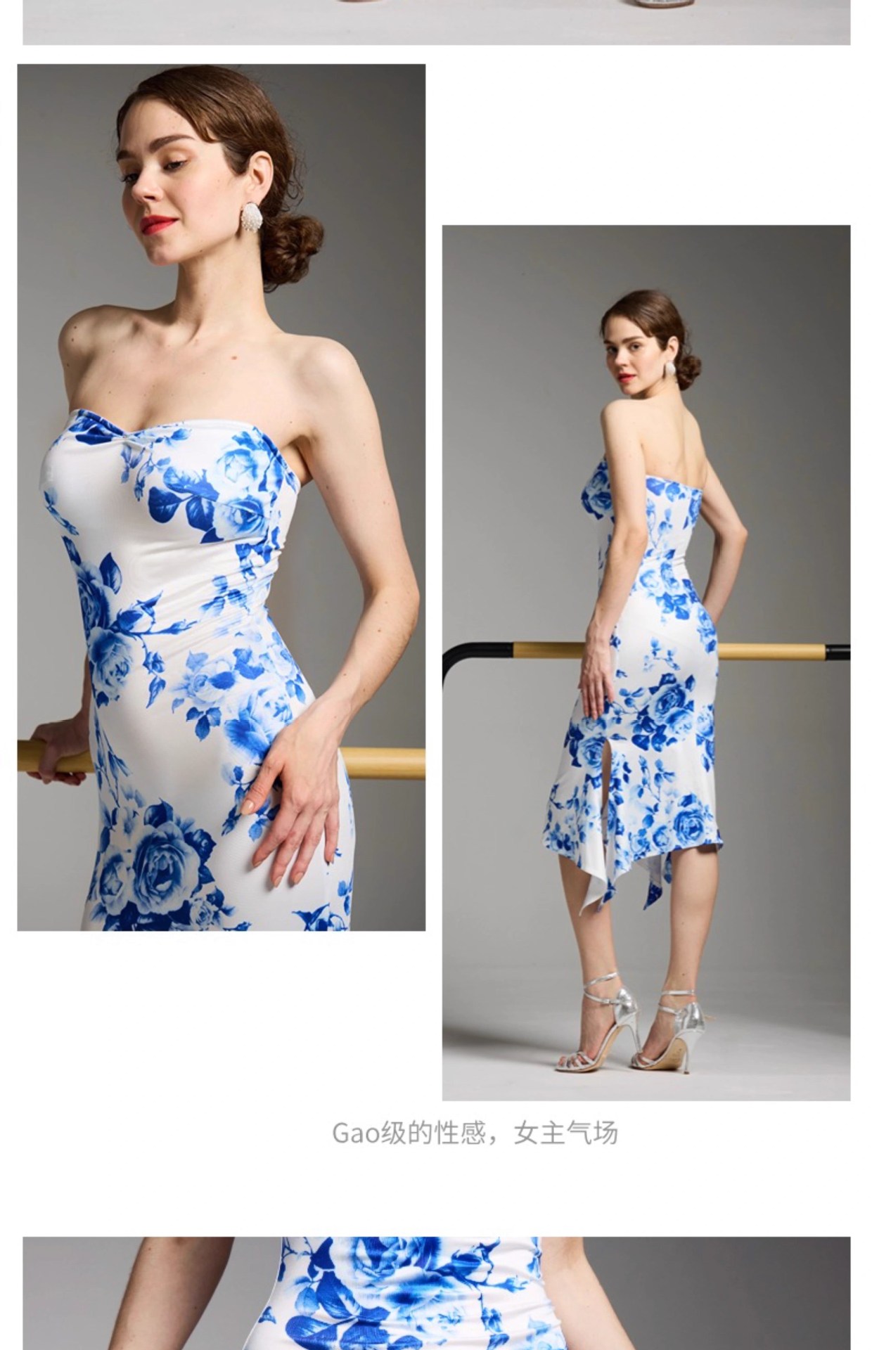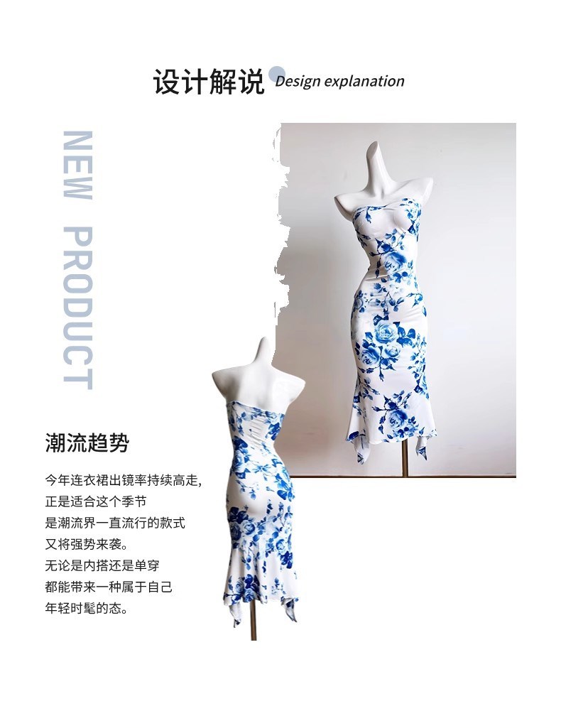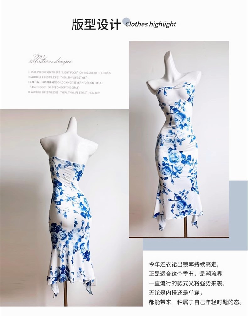 새로운 중국 스타일의 슬림 핏 틈새 인쇄 튜브 탑 원피스 파란색과 흰색 도자기 힙 피쉬 원피스 섹시한 분할 연예인 원피스스토어 가기