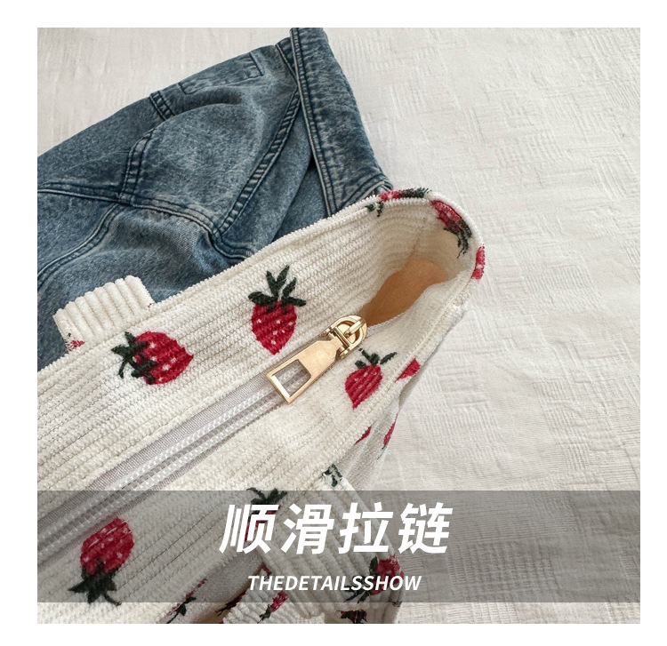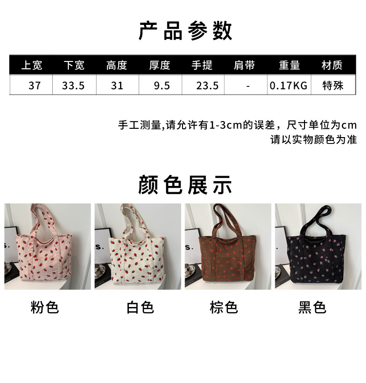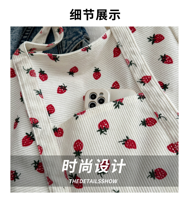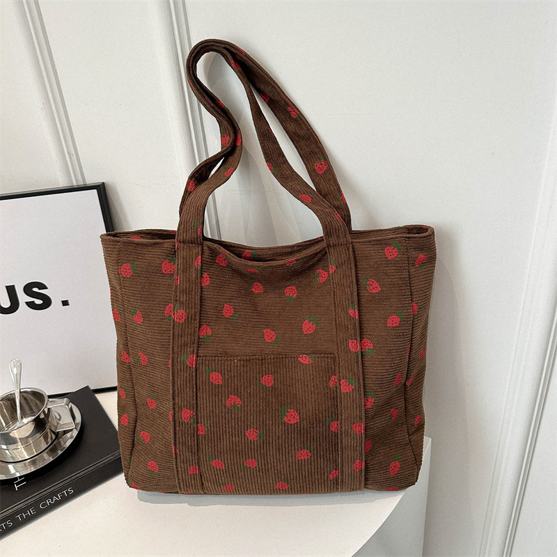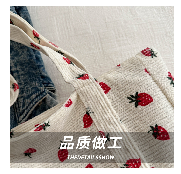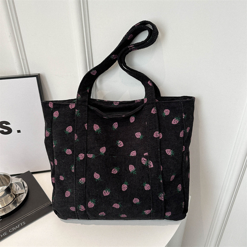 코듀로이 딸기 프린트 토트 백 올 매치 언더암 여성용 가방 대용량 어깨 가방 대학생 캔버스 가방 국경스토어 가기