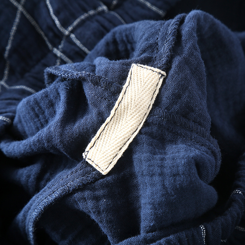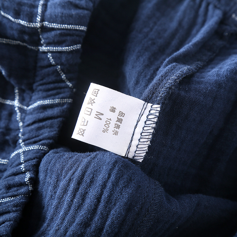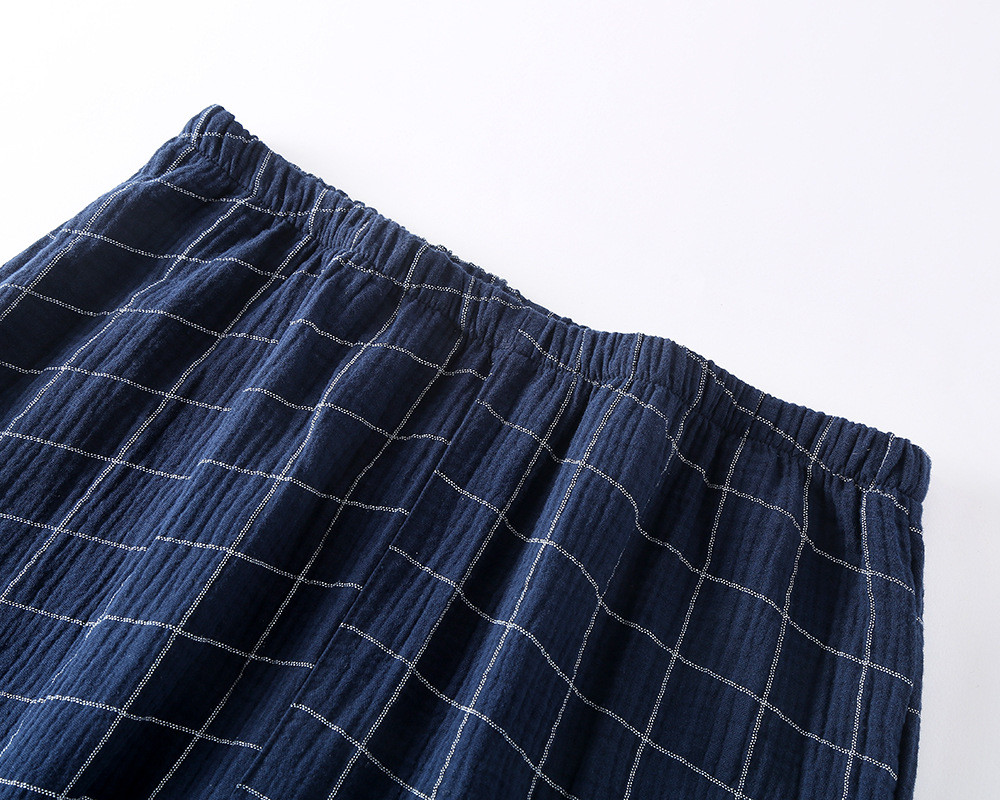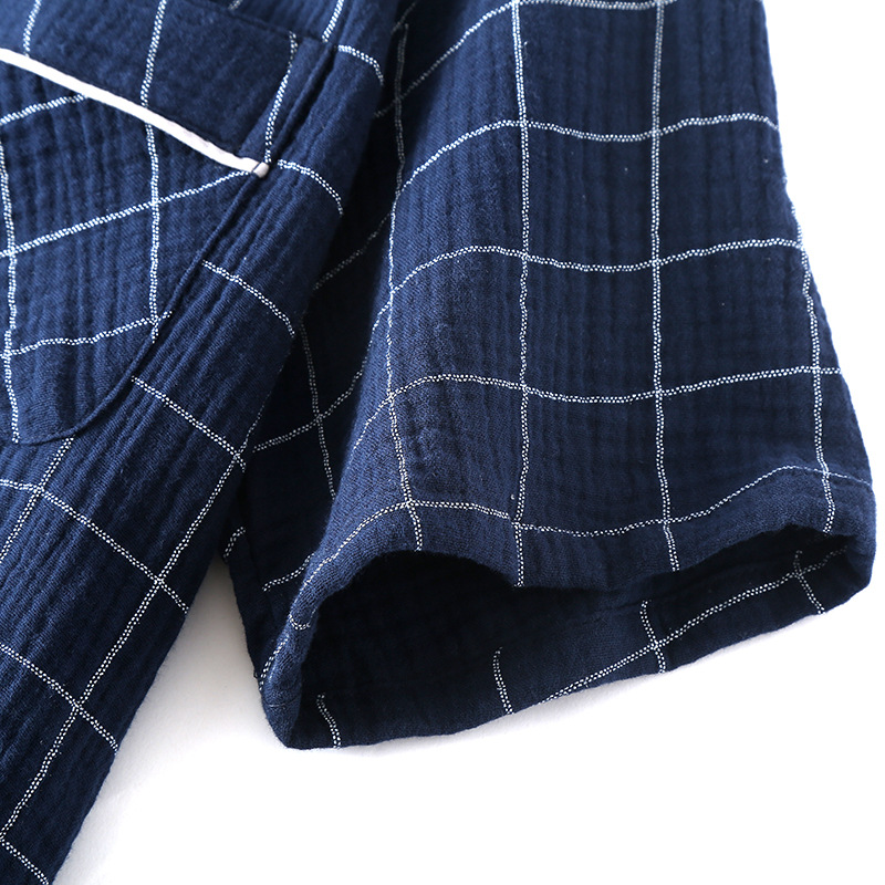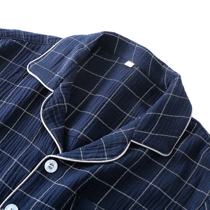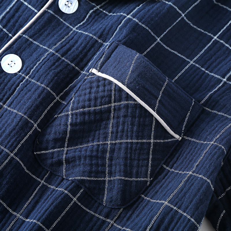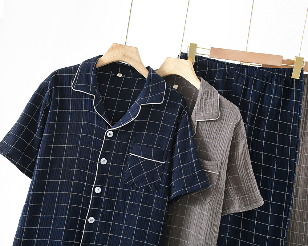 인쇄되지 않은 품질 파자마 반팔 남성 더블 레이어 크레페 퓨어 코튼 여름 얇은 격자 무늬 세트 홈 의류스토어 가기