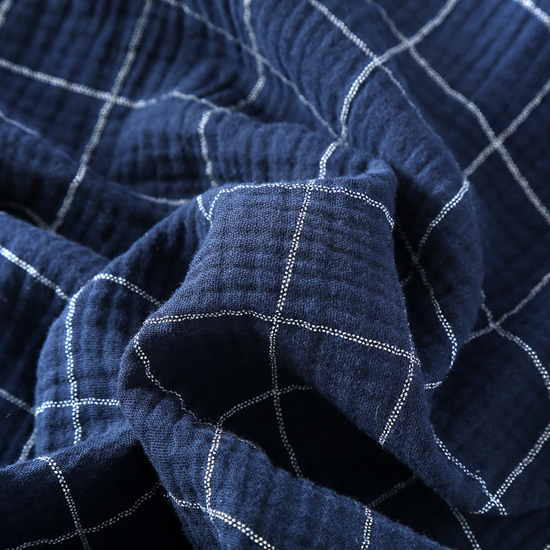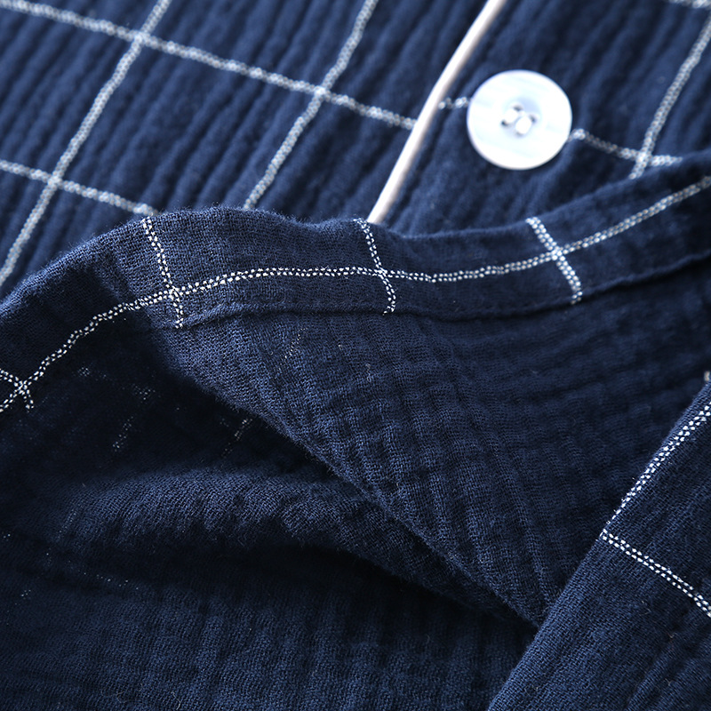 인쇄되지 않은 품질 파자마 반팔 남성 더블 레이어 크레페 퓨어 코튼 여름 얇은 격자 무늬 세트 홈 의류