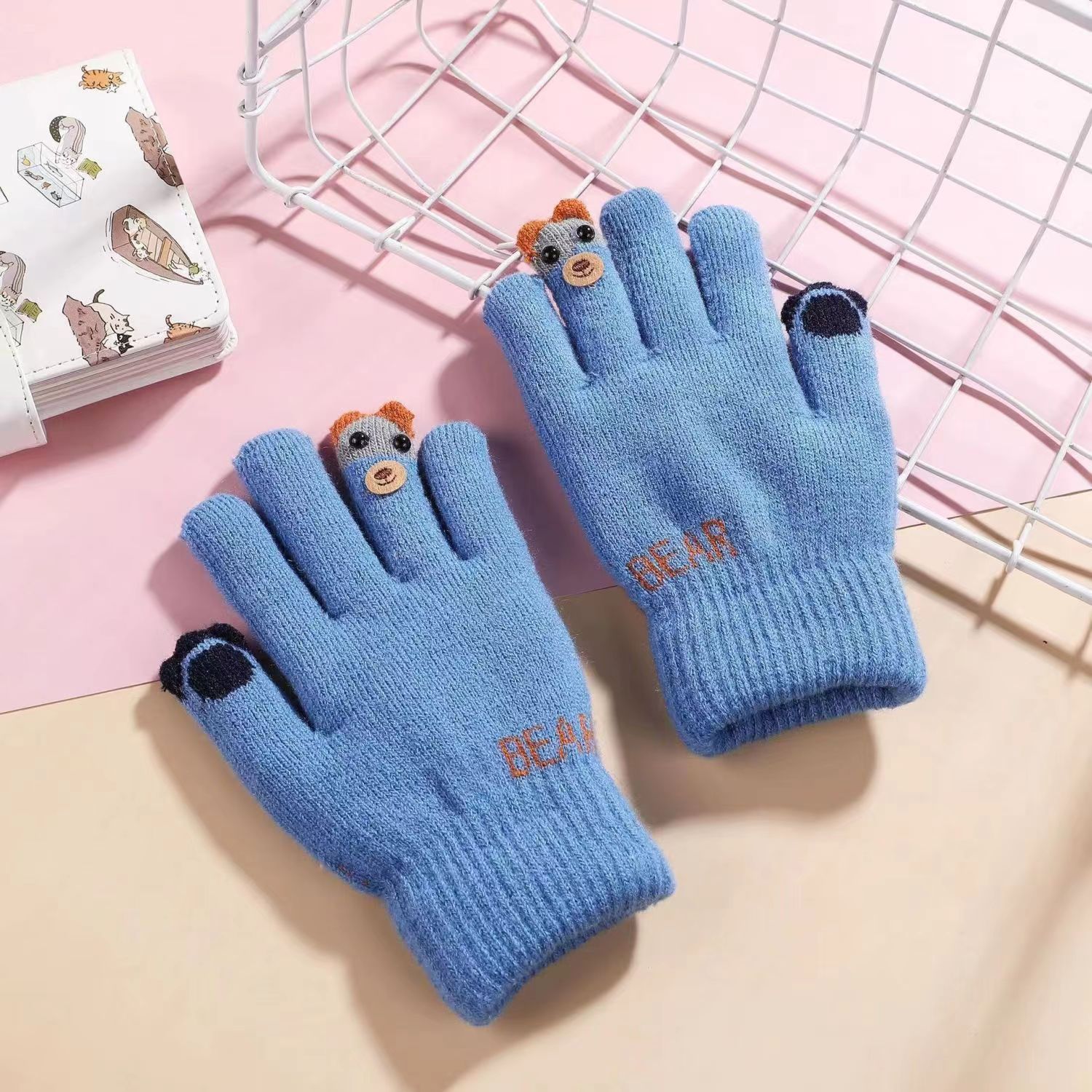 겨울 초등학교 학생 장갑 따뜻한 풀 손가락 봉제 장갑 기모 두꺼운 귀여운 곰 만화 유니섹스 장갑스토어 가기