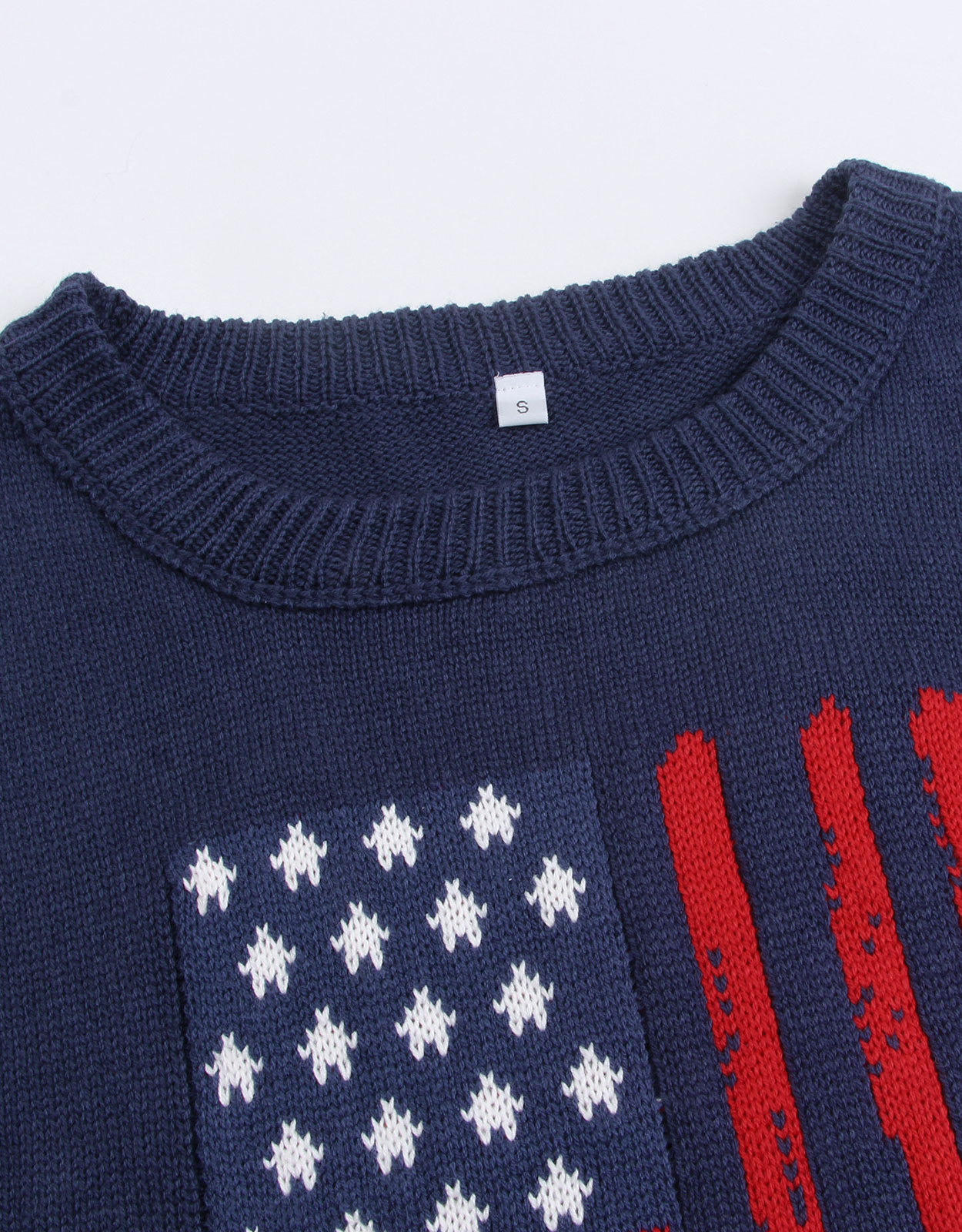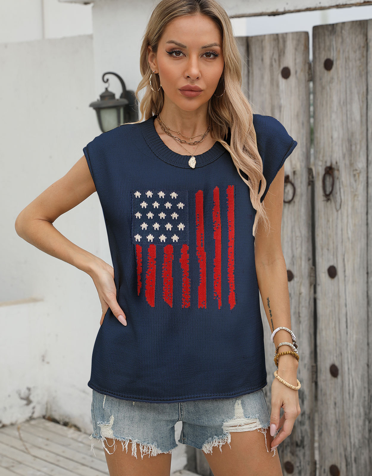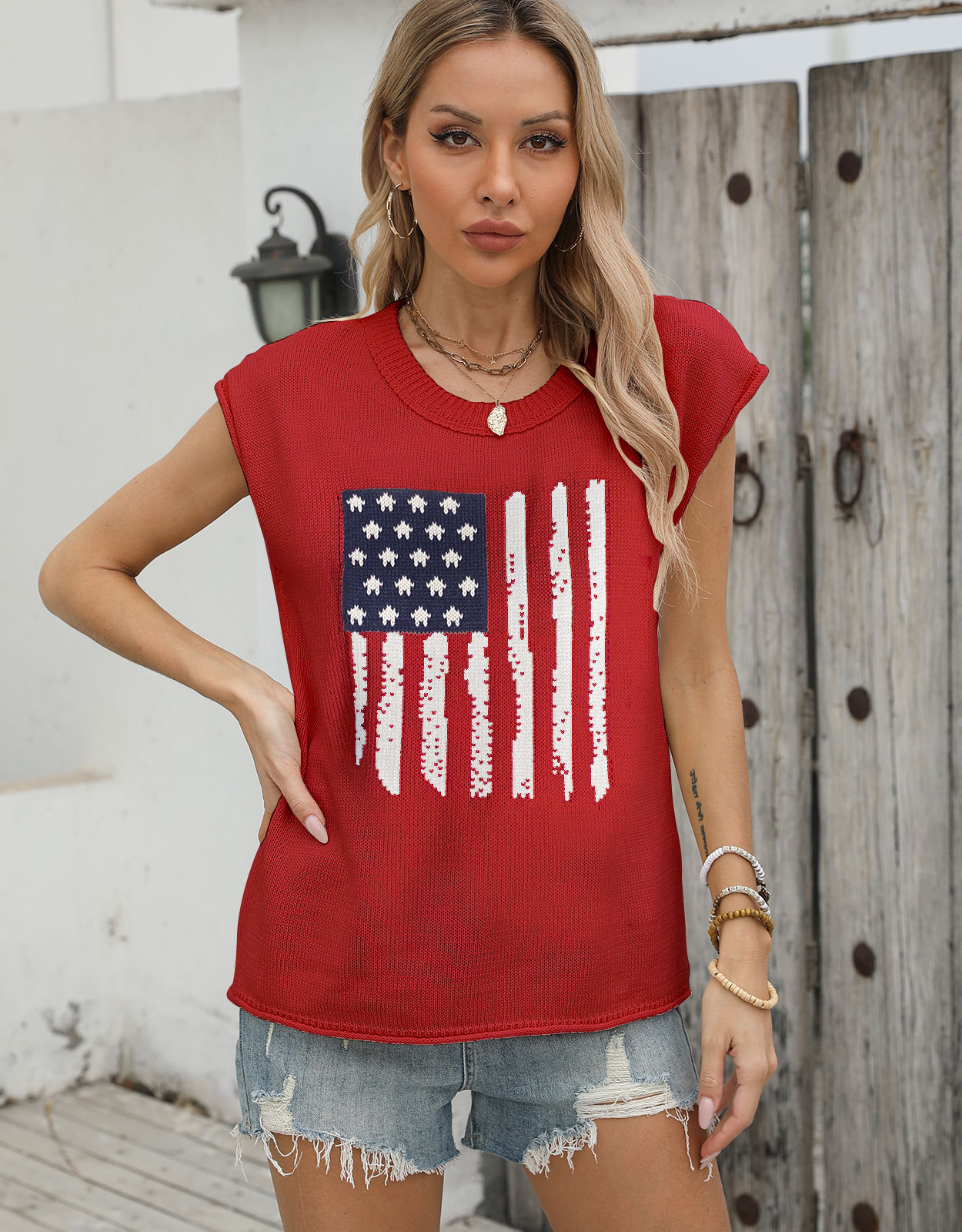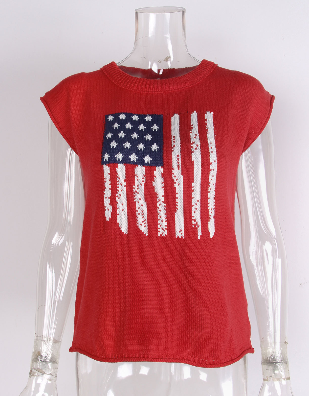 가을 국경 아마존 유럽과 미국 베스트셀러 독립 기념일 승무원 목 국기 단색 스웨터 패션 반팔 스웨터 여성