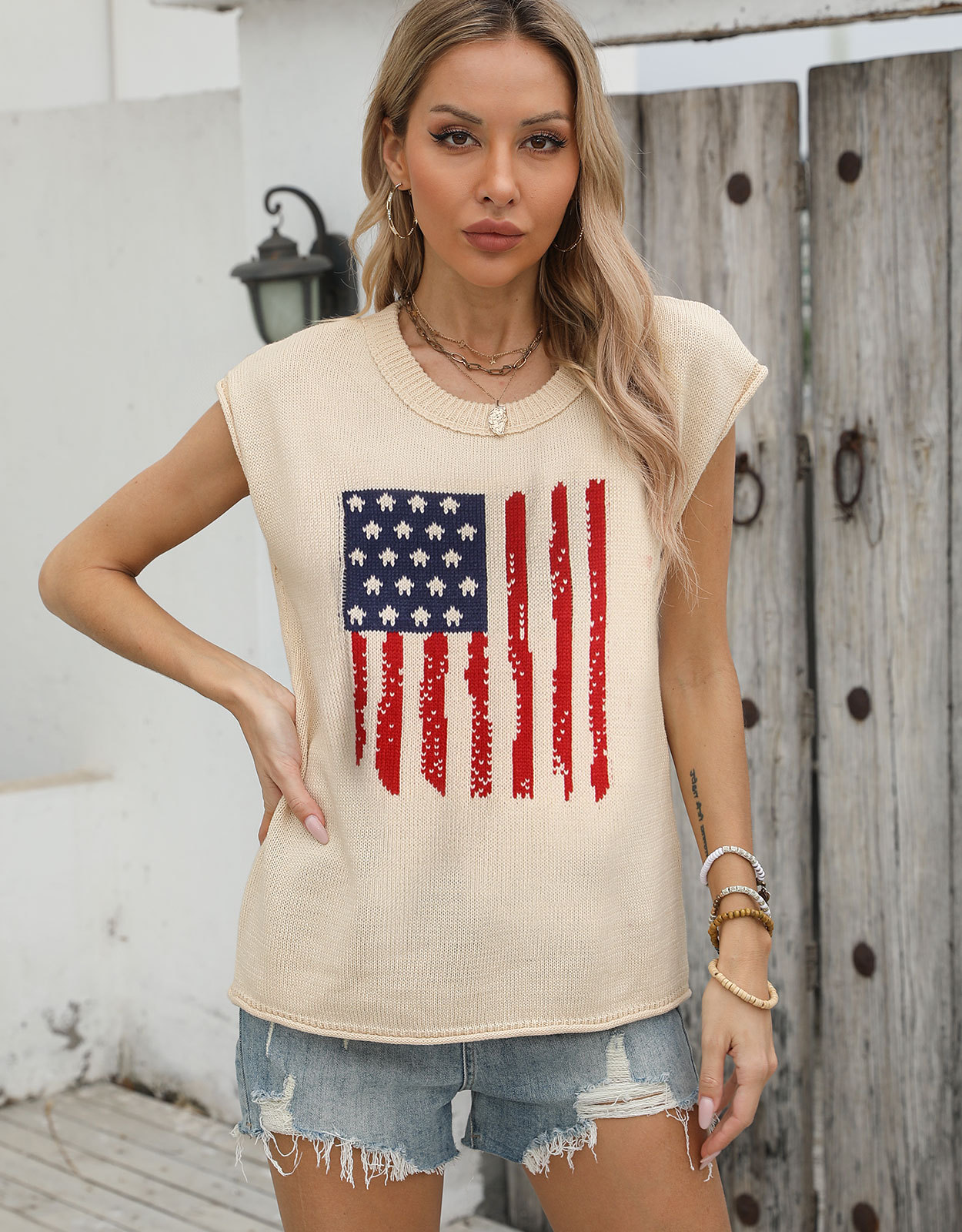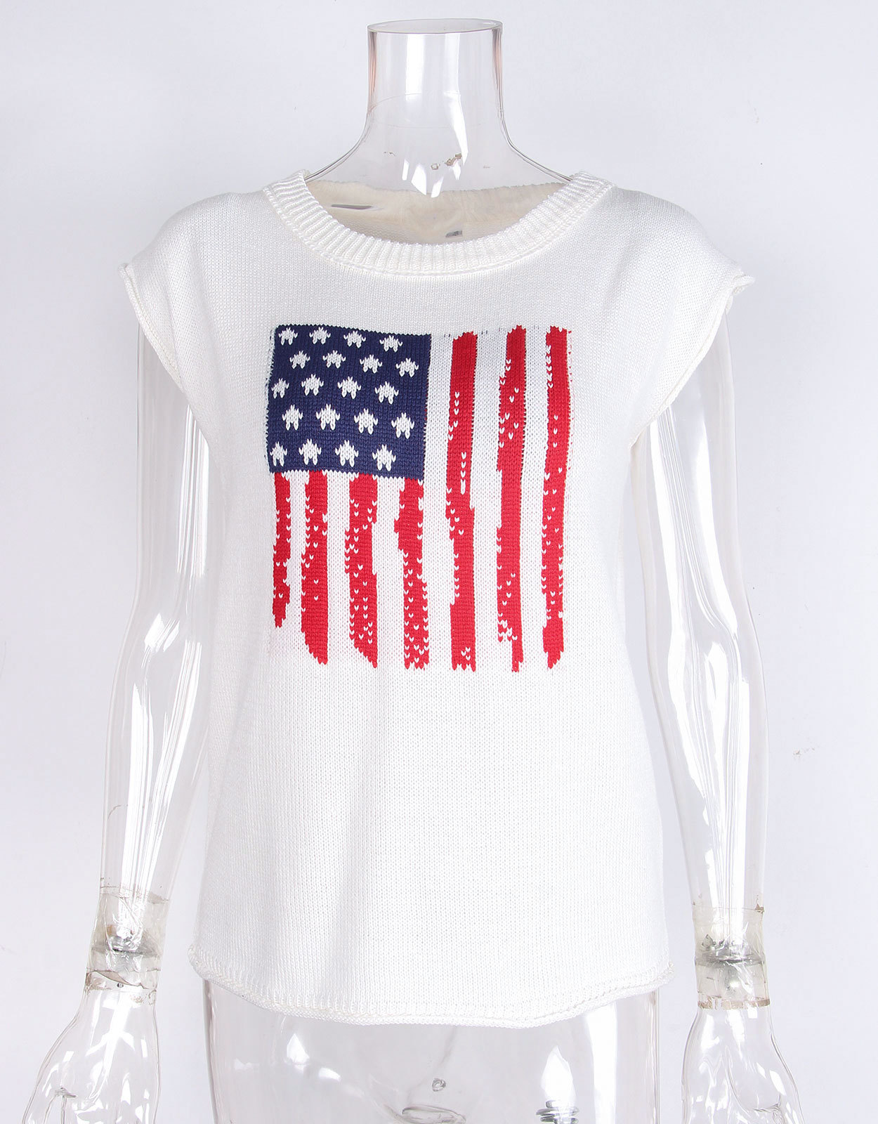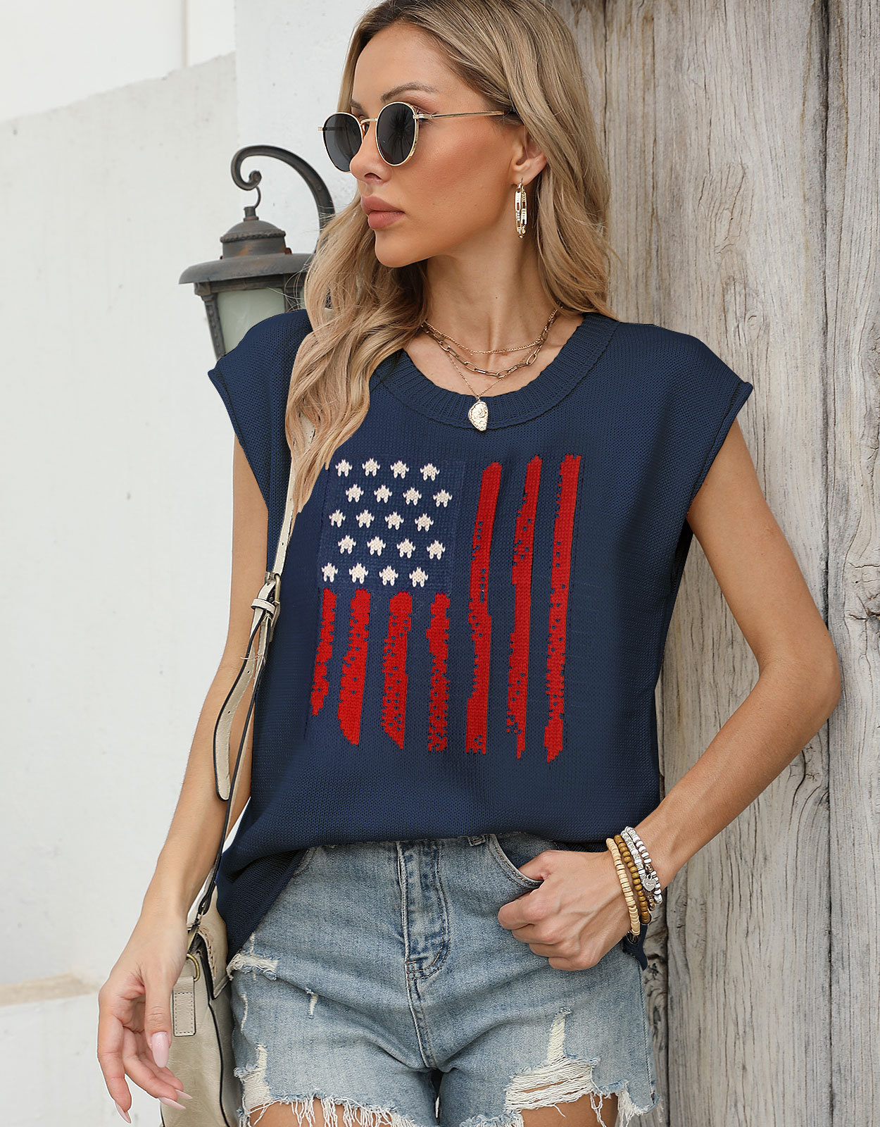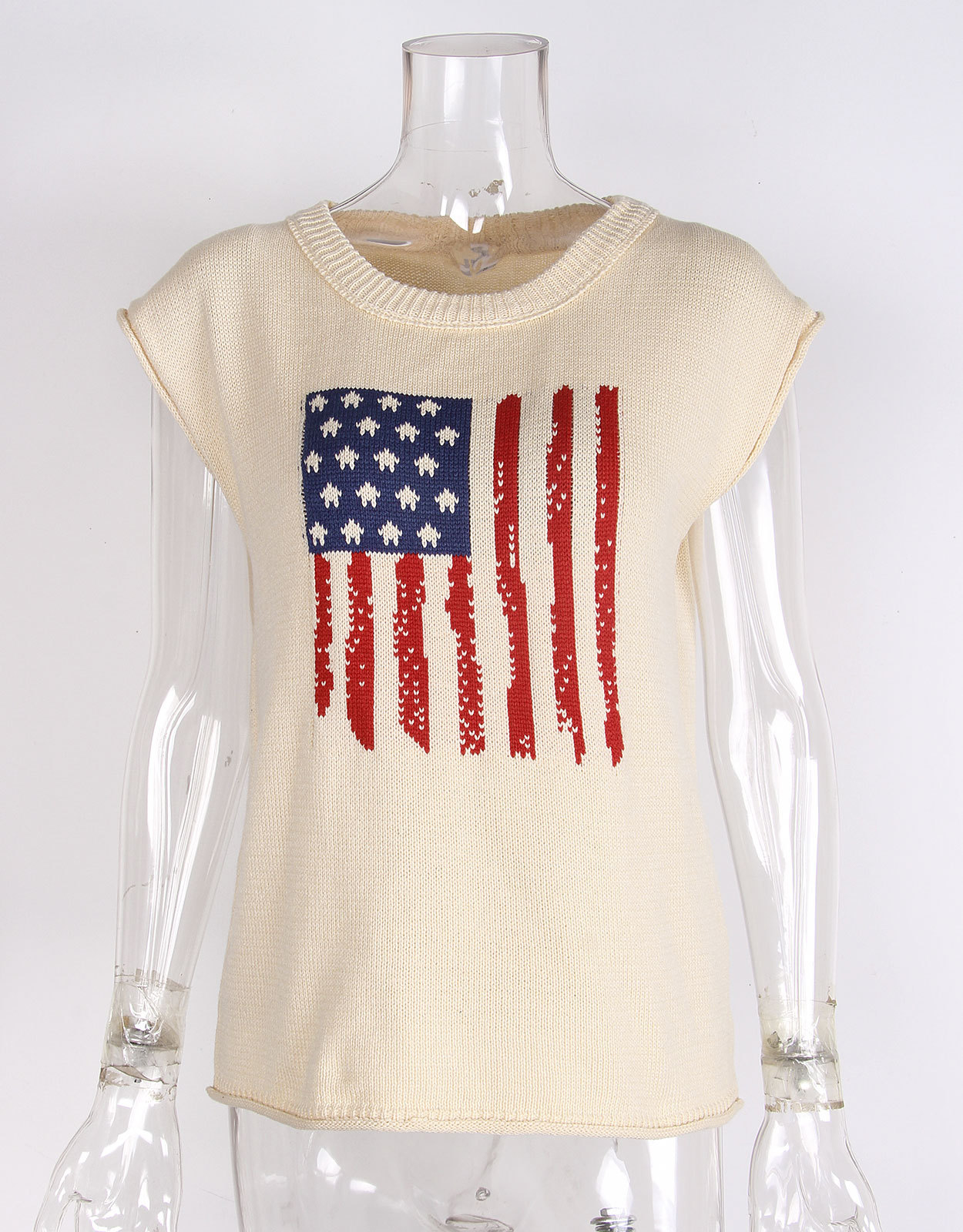 가을 국경 아마존 유럽과 미국 베스트셀러 독립 기념일 승무원 목 국기 단색 스웨터 패션 반팔 스웨터 여성