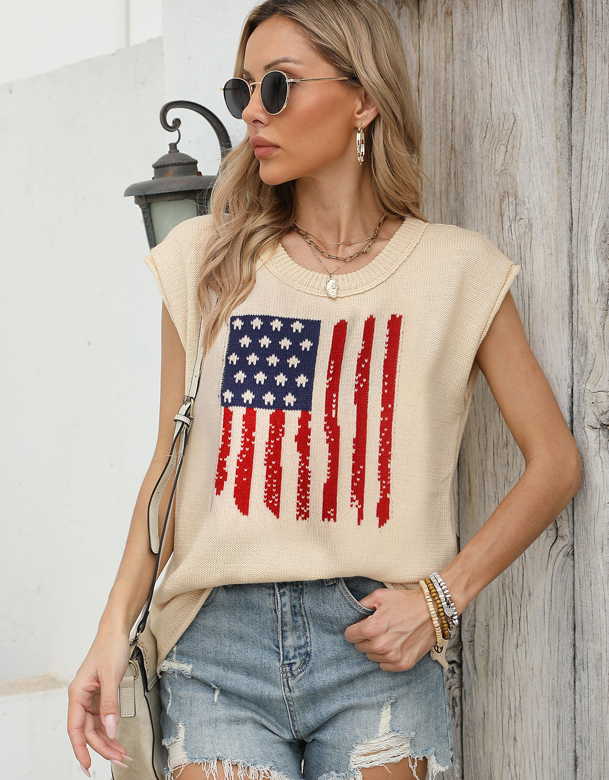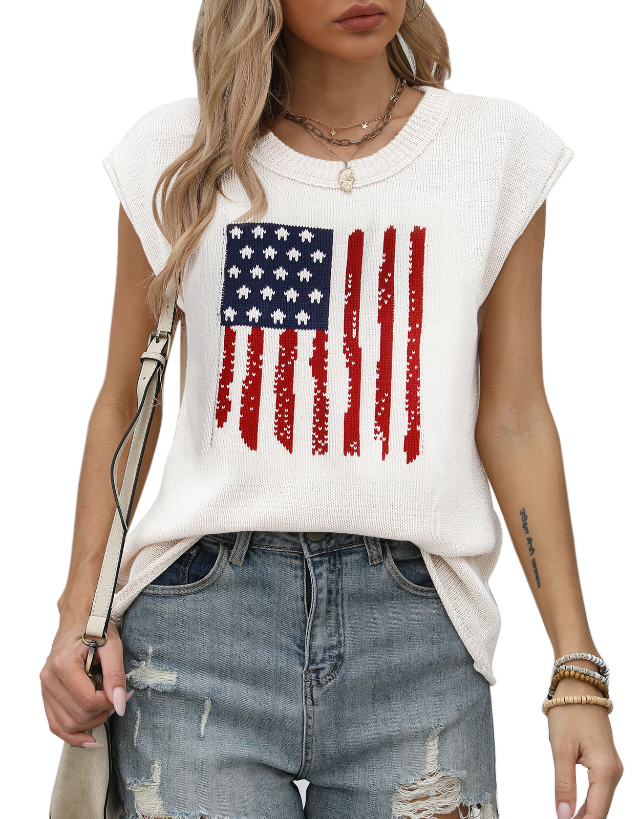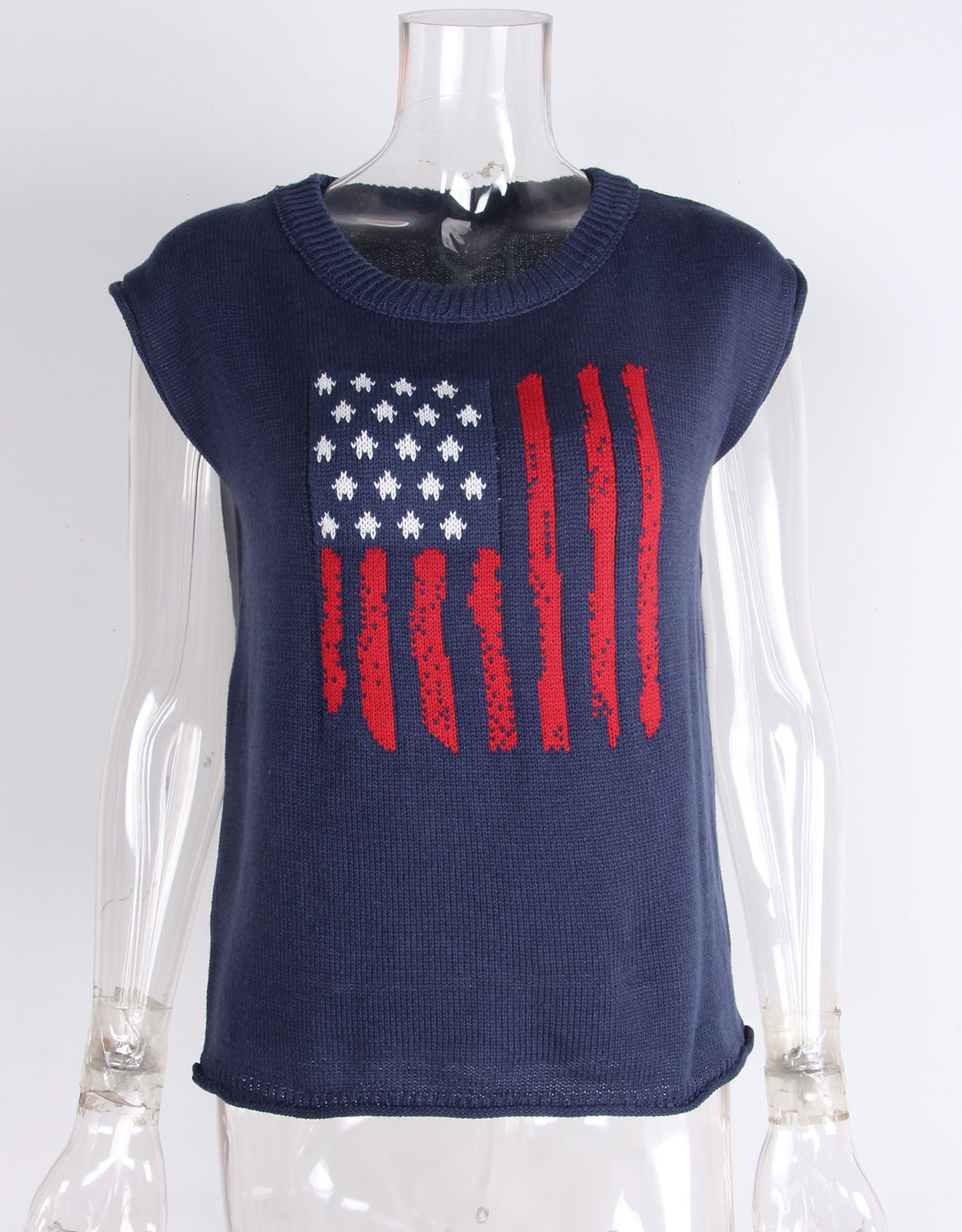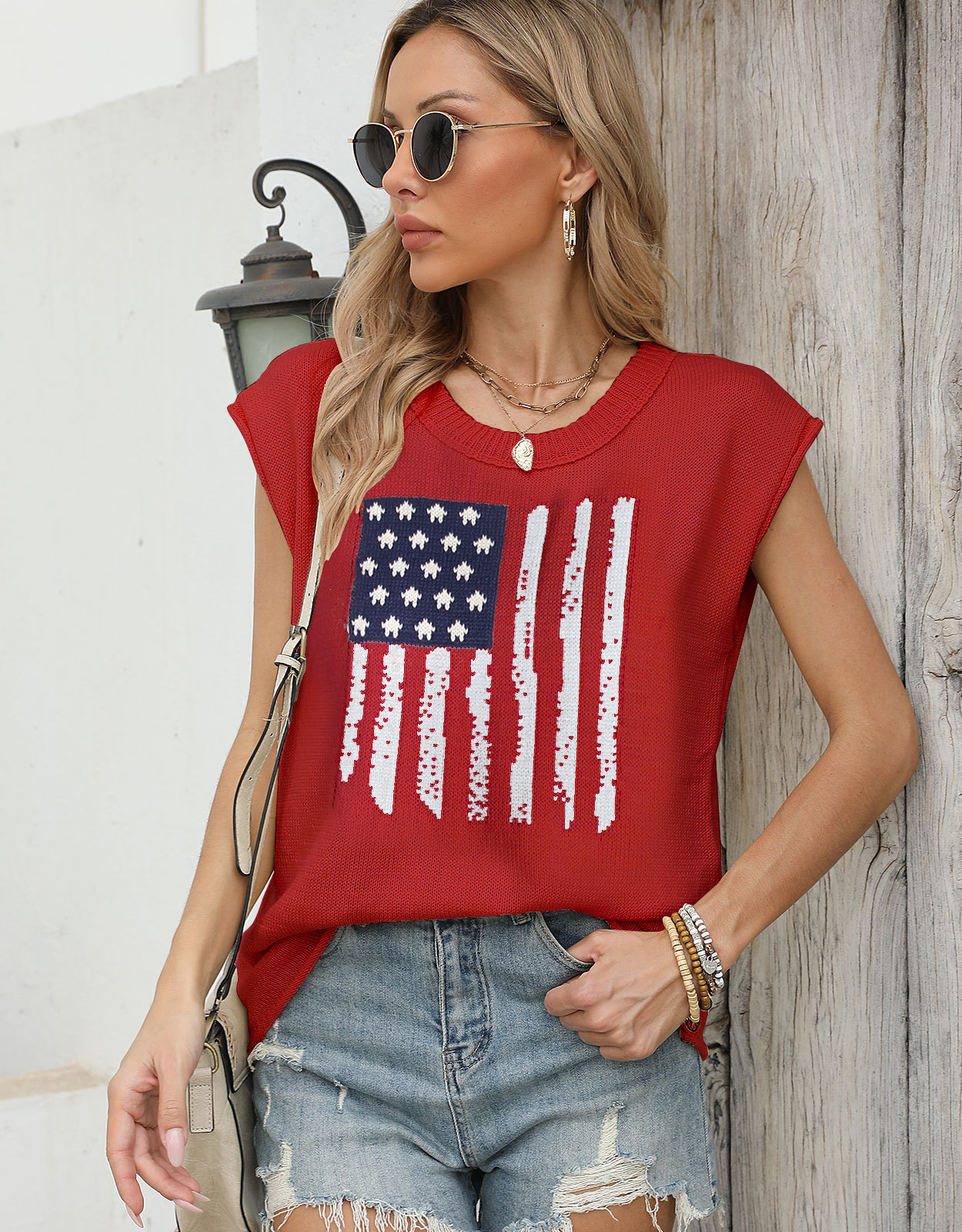 가을 국경 아마존 유럽과 미국 베스트셀러 독립 기념일 승무원 목 국기 단색 스웨터 패션 반팔 스웨터 여성