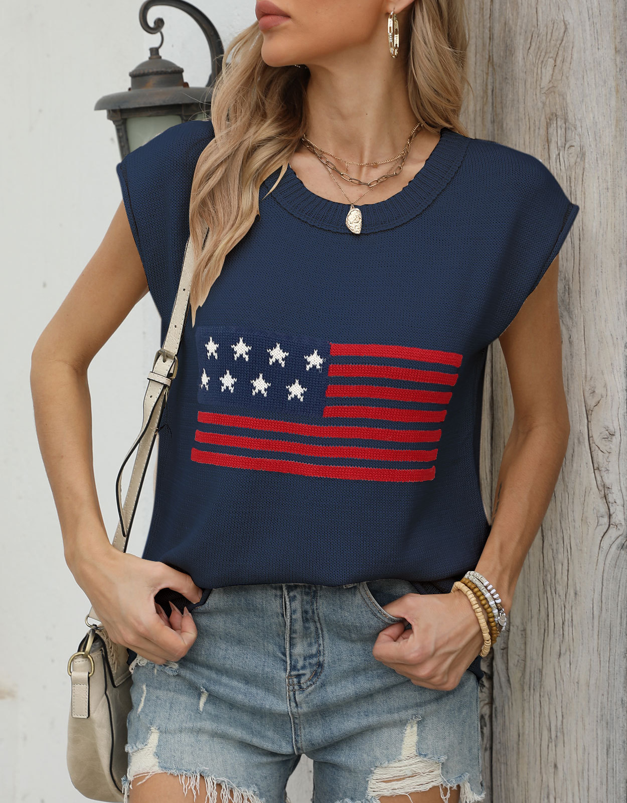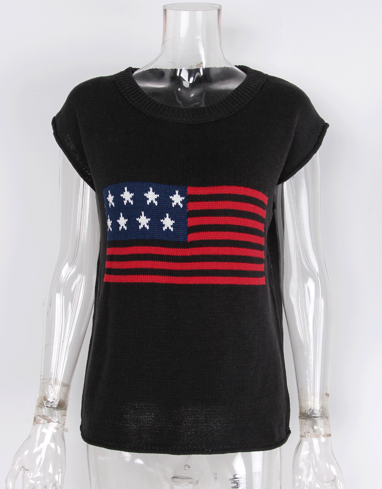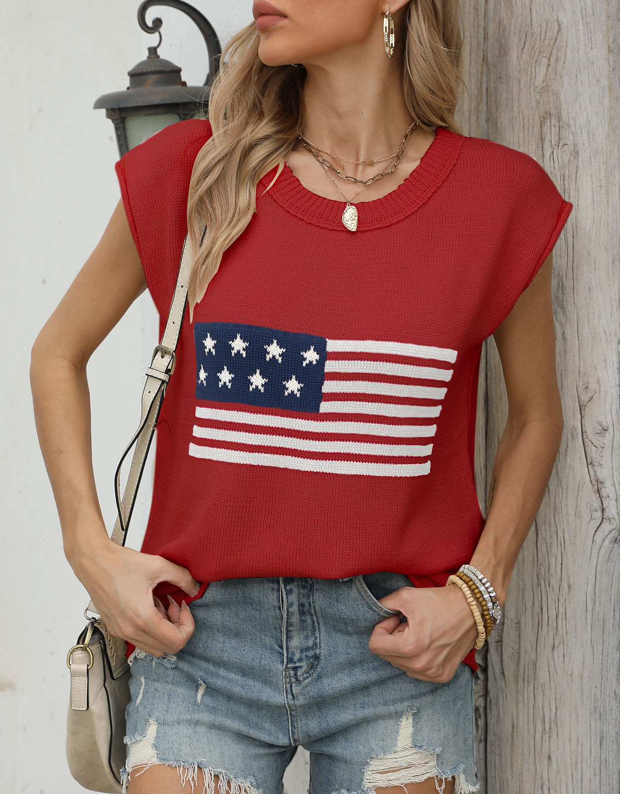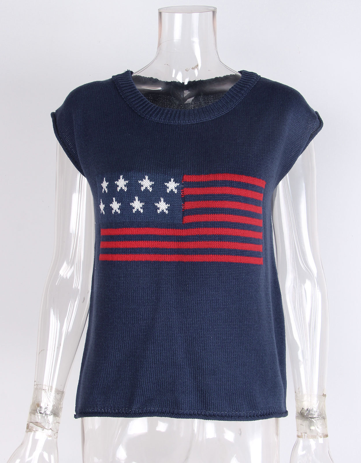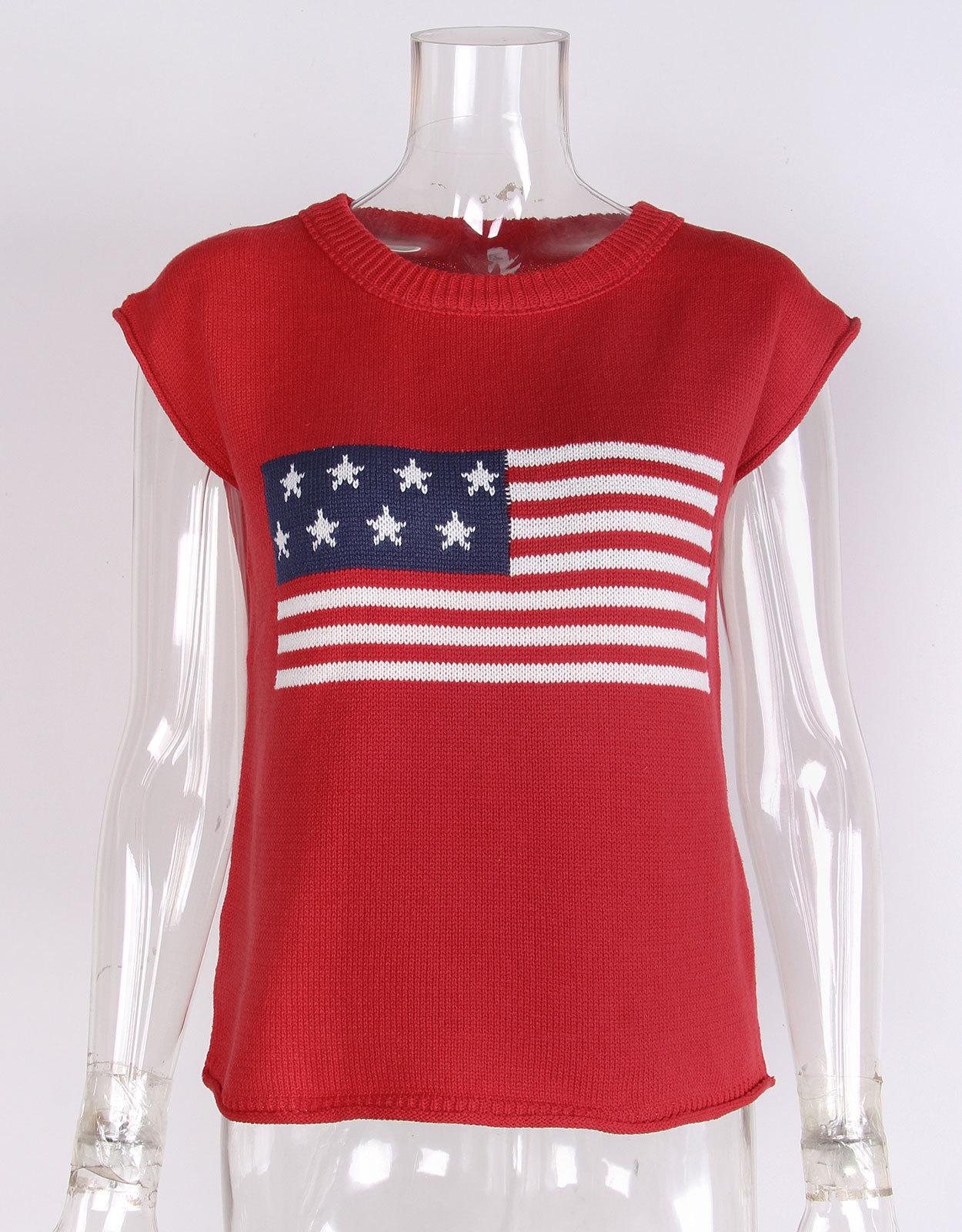 가을 새로운 아마존 뜨거운 독립 기념일 크루 넥 국기 유럽과 미국의 단색 스웨터 패션 여성용 짧은 소매 스웨터